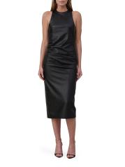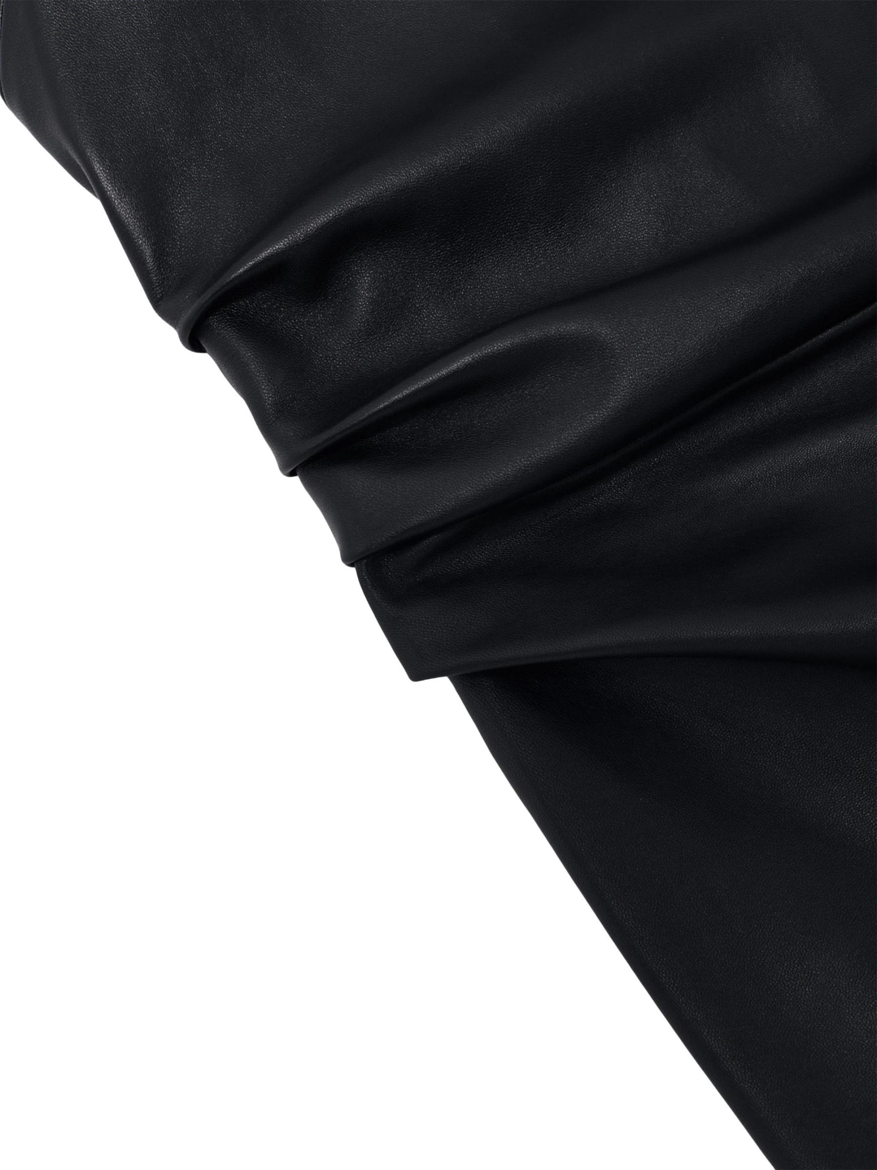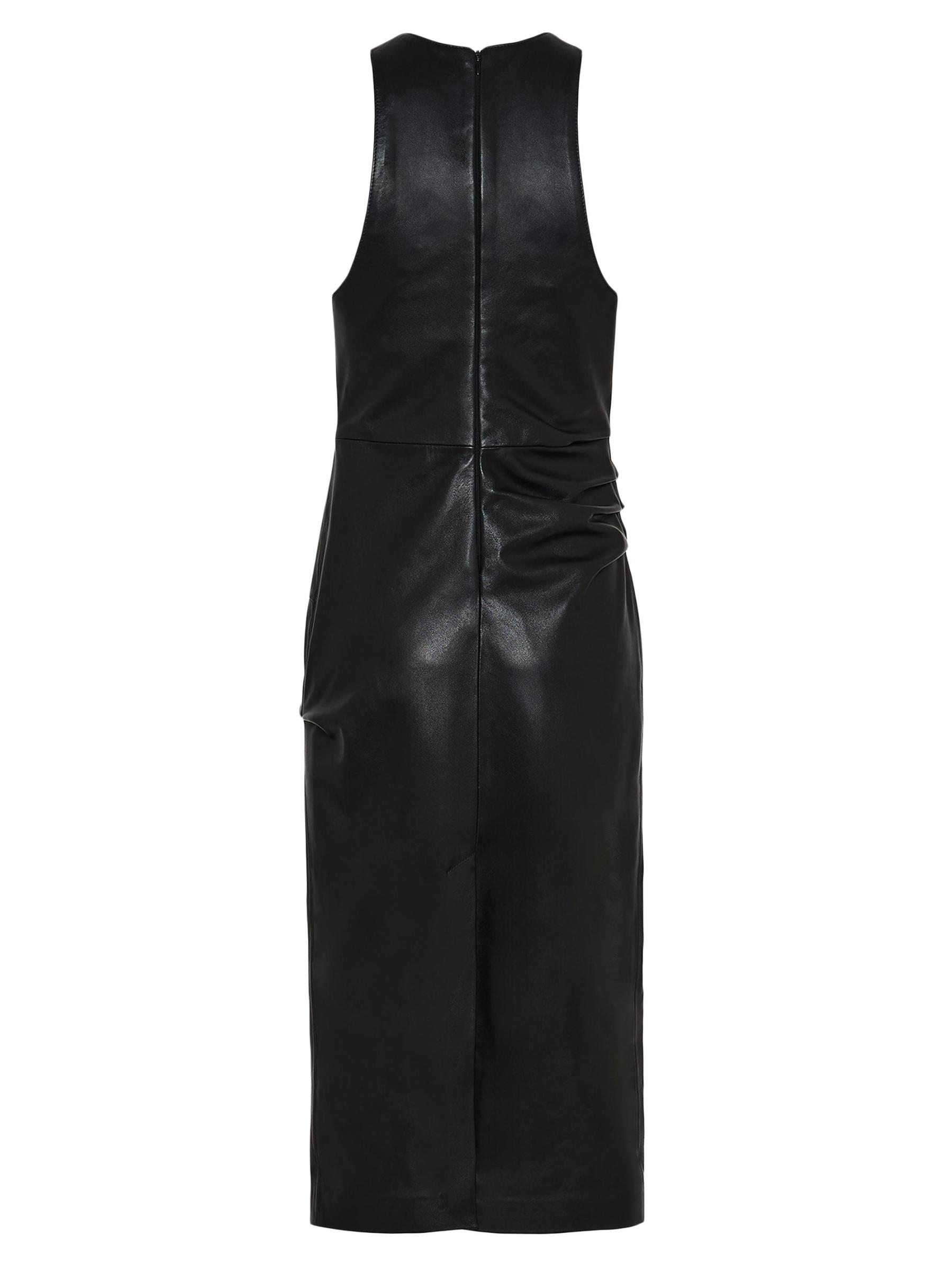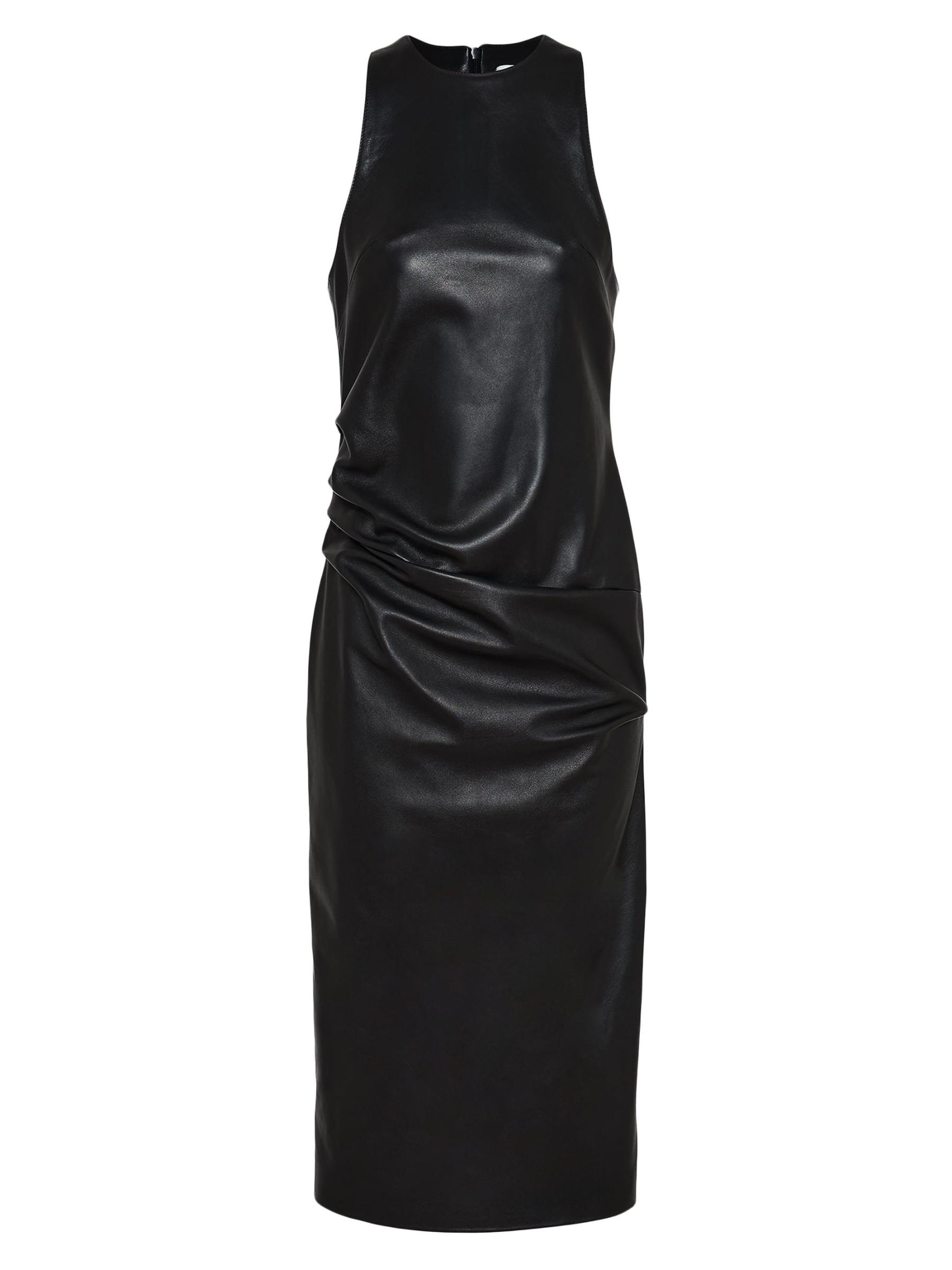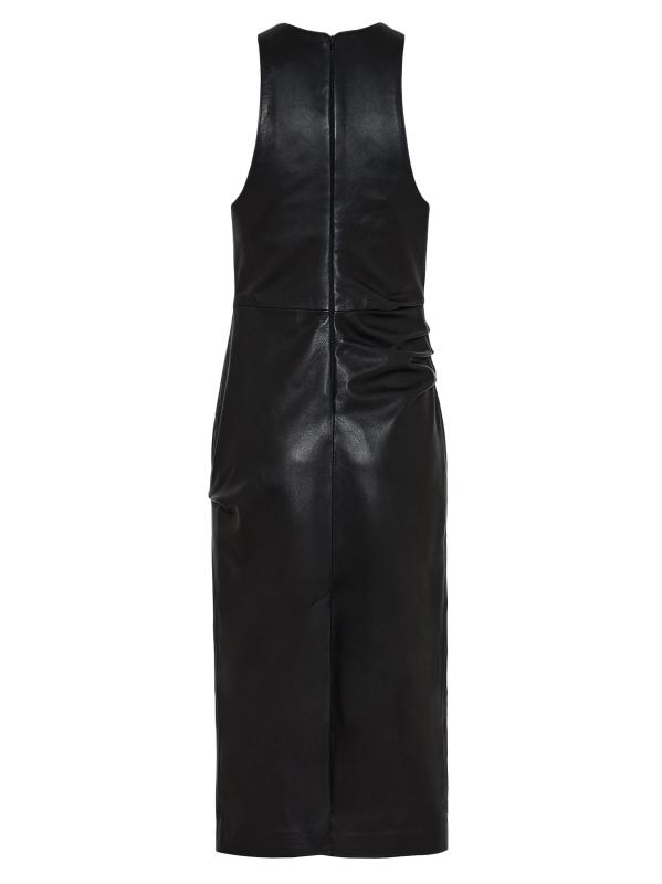 يُبرز فستان Pernilla المتوسط من Amarium، المصنوع من جلد النابا الإيطالي الفاخر، صورة ظلية ضيقة مع لف ديناميكي عند الخصر. تتميز هذه القطعة بياقة مستديرة وقصة بلا أكمام وشق خلفي.