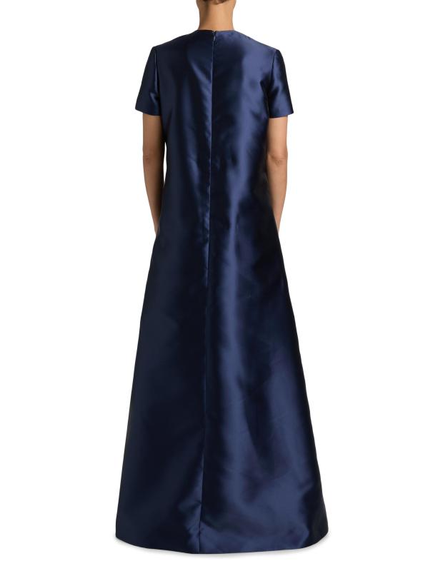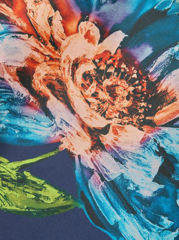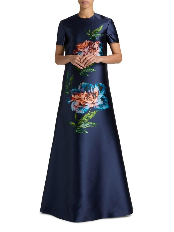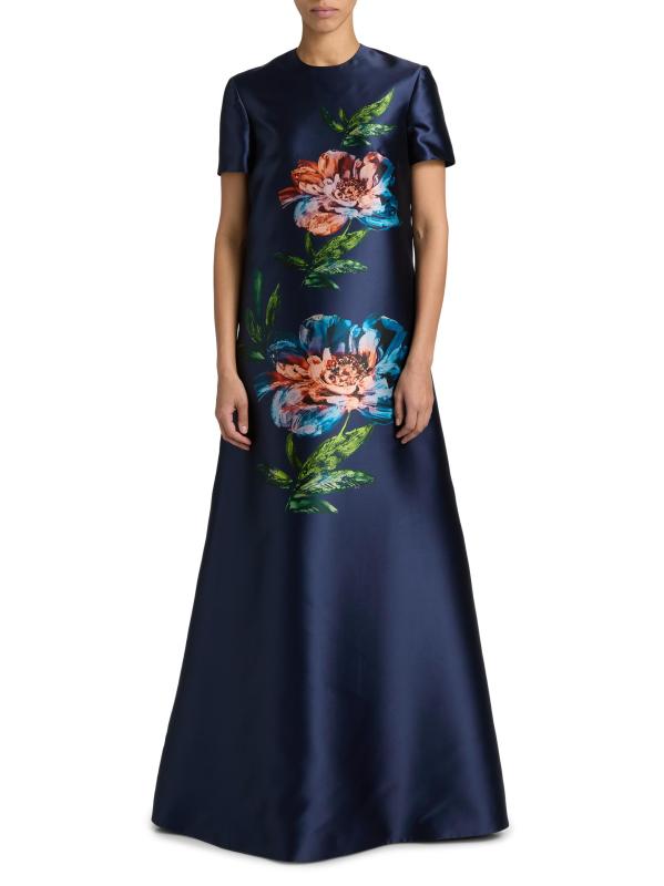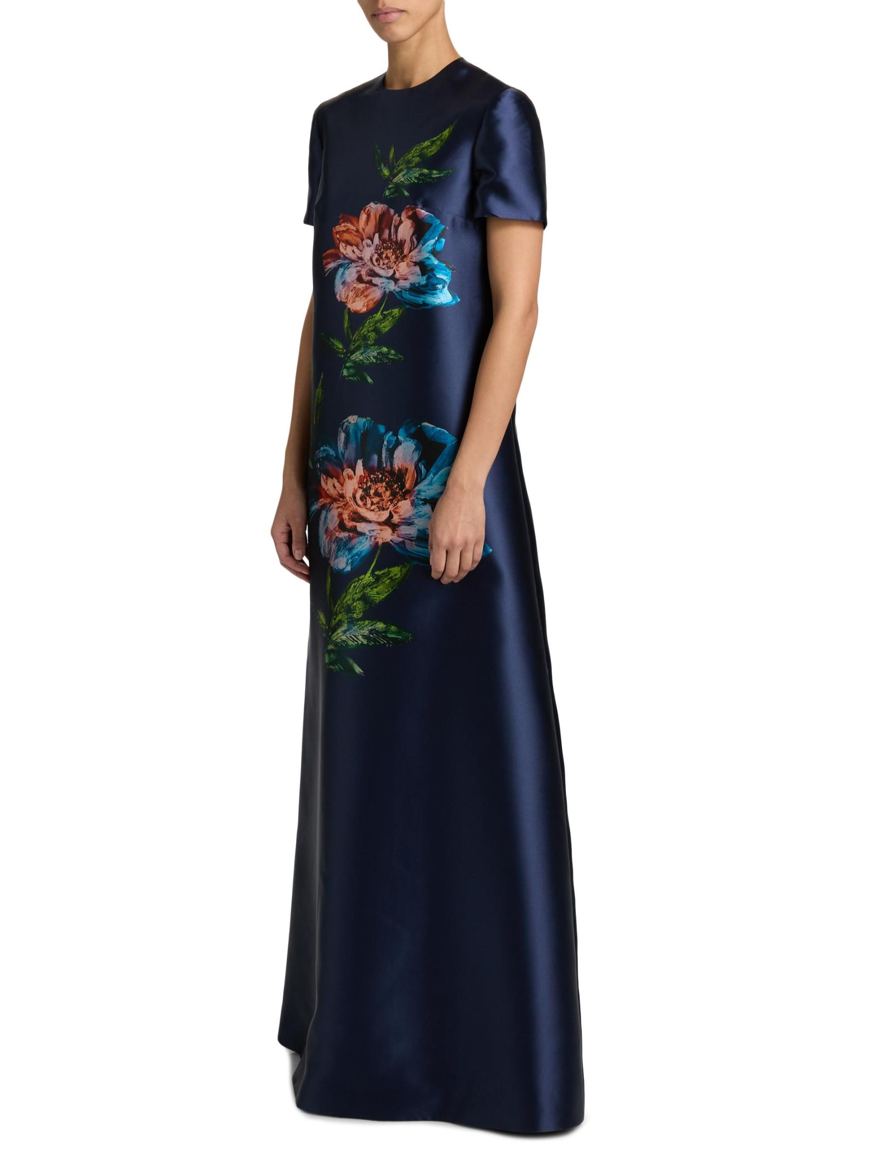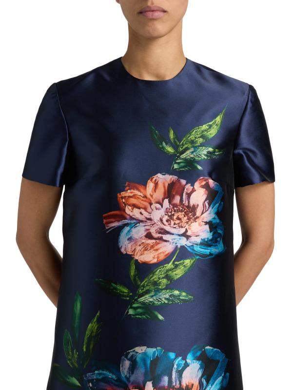 صُمم فستان «بيتال آند سبايس آند ويسبرز أوف ريش ميكادو» من ريم أكرا بنقشة زهور رقمية على شكل حرف A الأنيق.