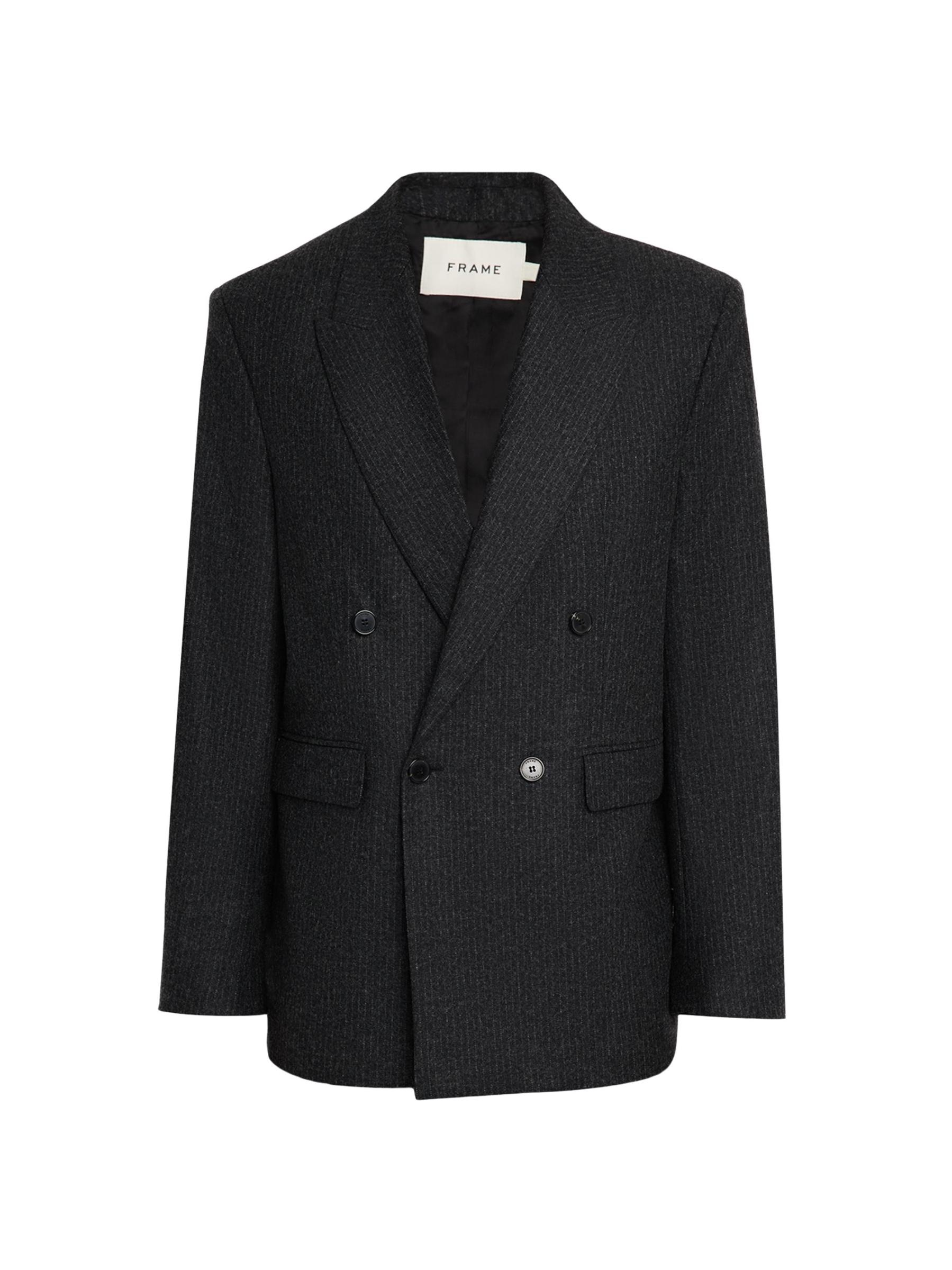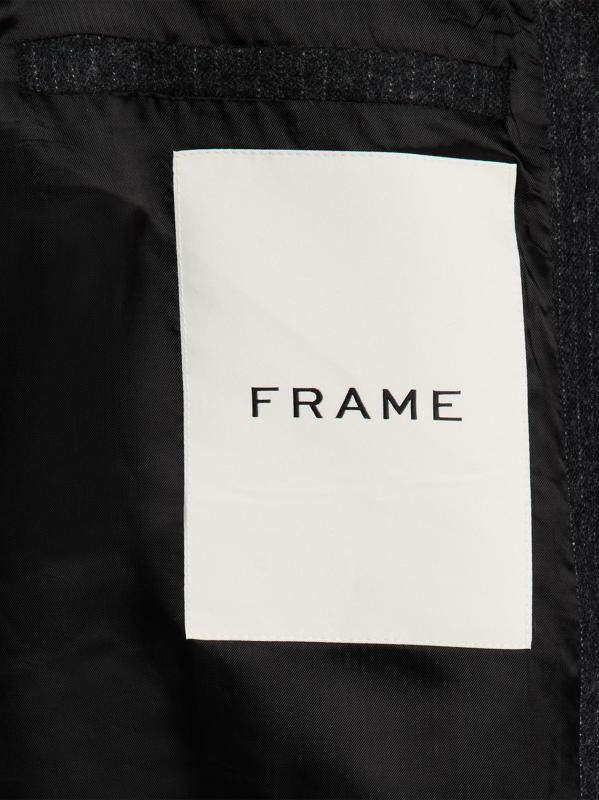 تتميز السترة المصممة خصيصًا من Frame بتصميم مزدوج الصدر ومزينة بخطوط دقيقة. هذه القطعة مصنوعة من مزيج من الصوف، وهي كاملة مع ثنيات علوية وجيوب جانبية قابلة للطي.