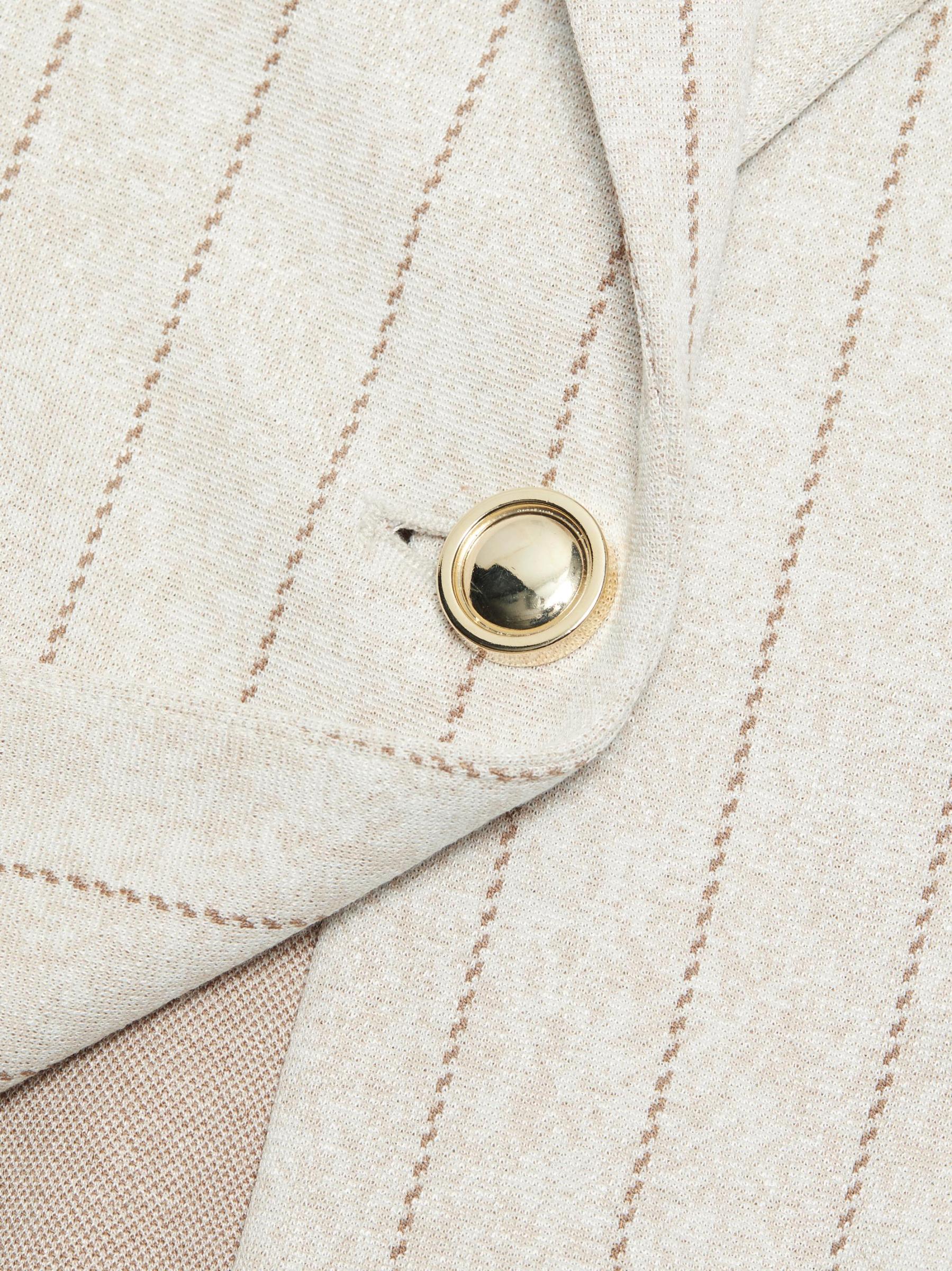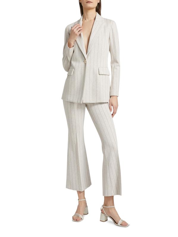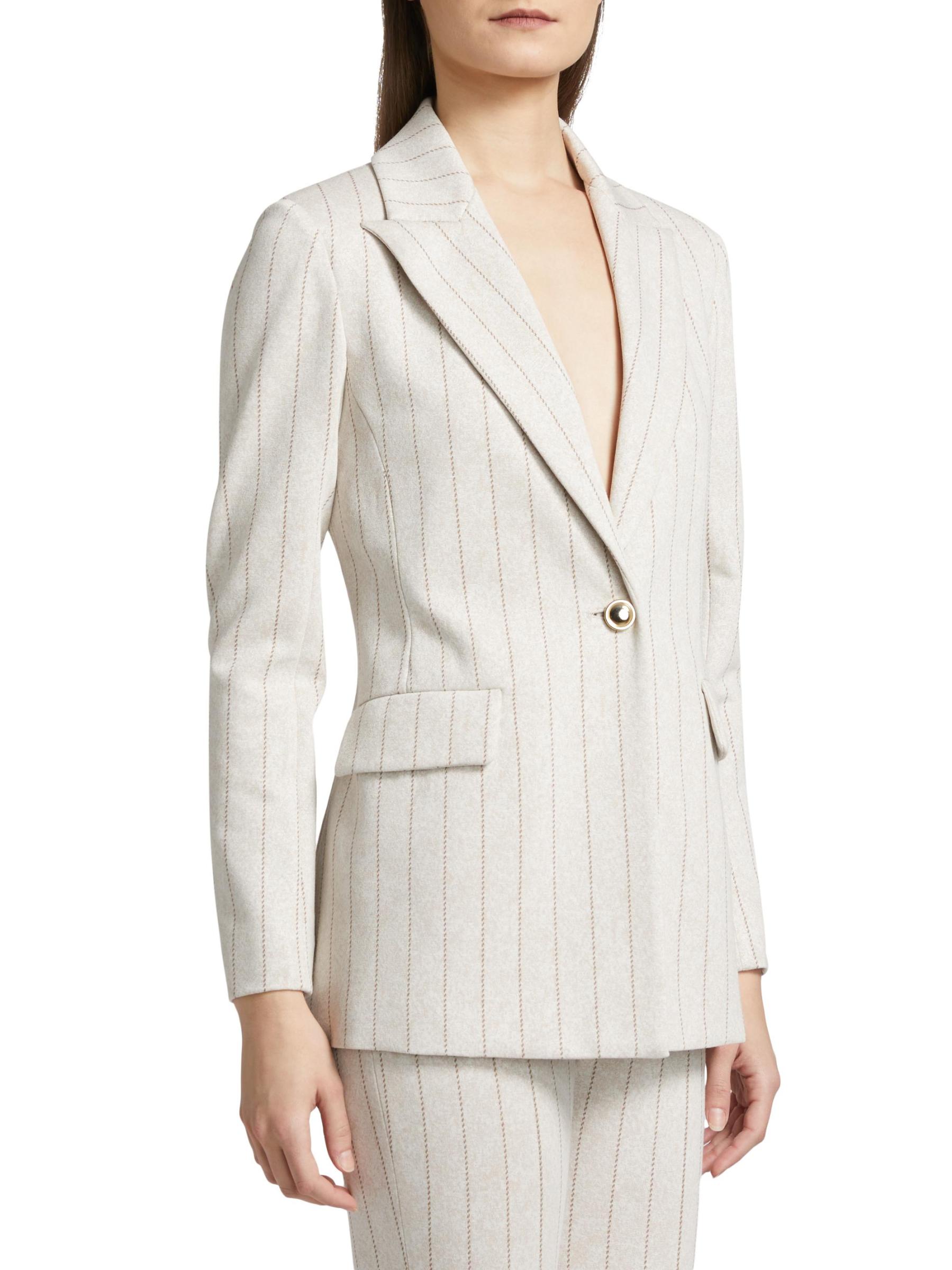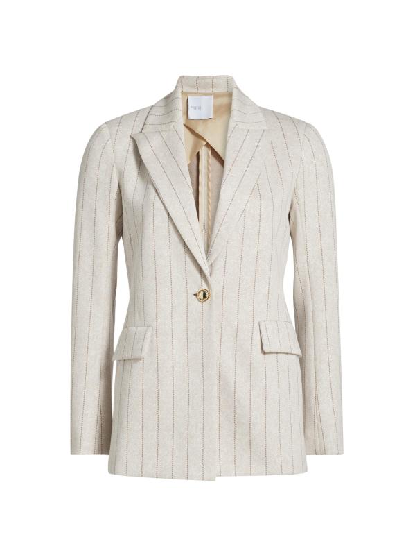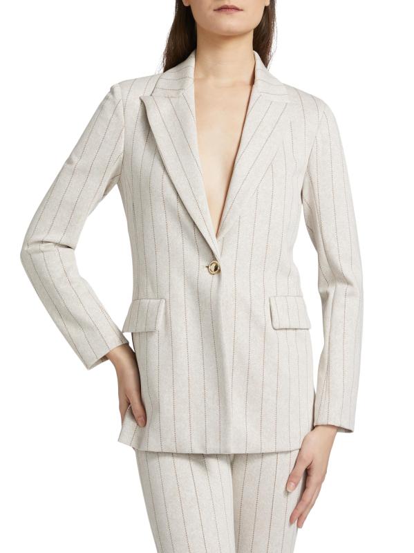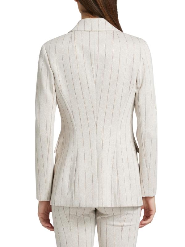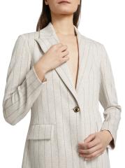 صُنعت هذه السترة أحادية الصدر من Rosetta Getty في الولايات المتحدة الأمريكية، وهي مزينة بخطوط ضيقة.