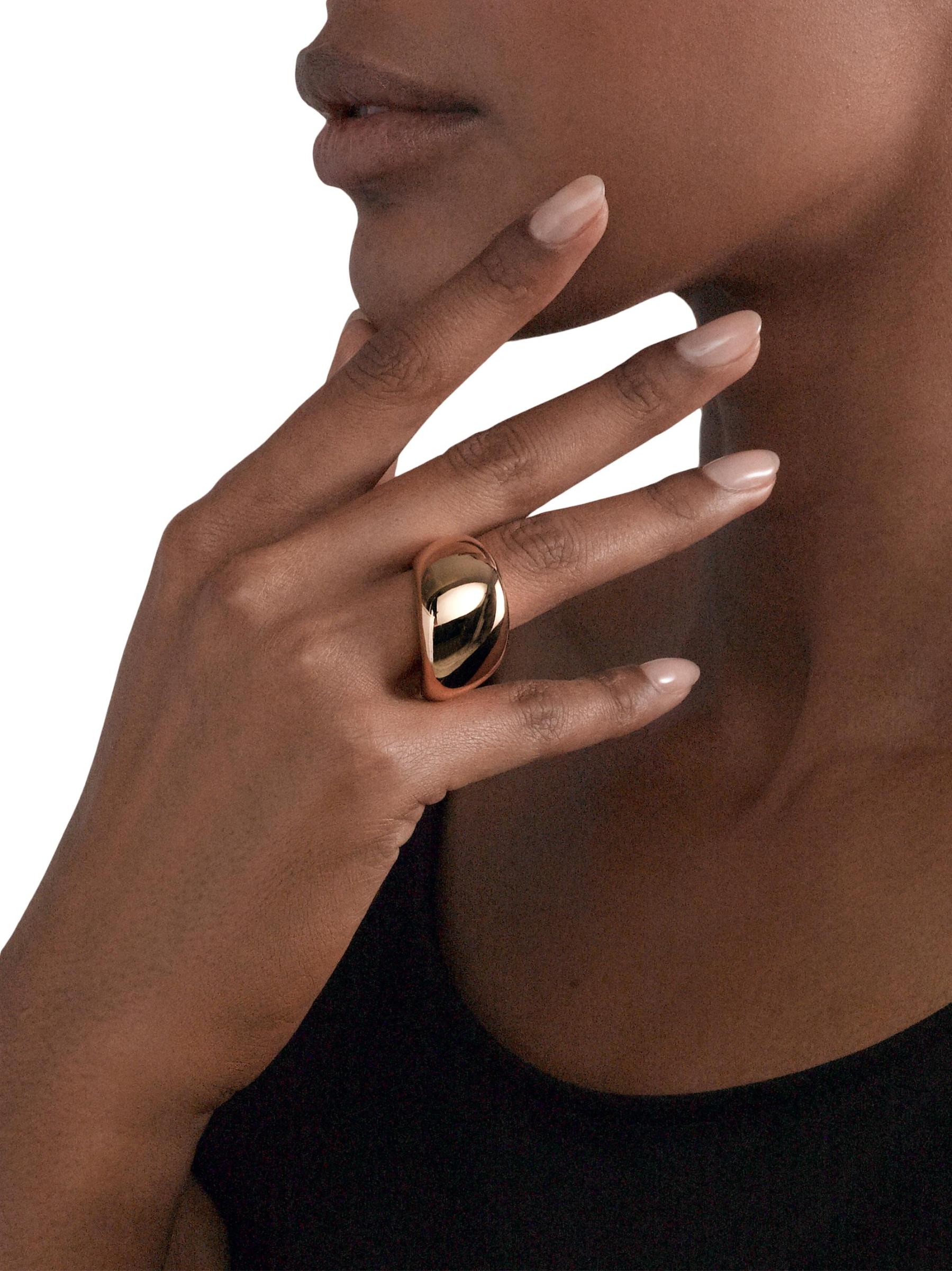 من مجموعة Pirouette. يتميز هذا الخاتم المميز المصنوع يدويًا من الذهب الوردي عيار 18 قيراطًا بتصميم منحني فريد ولمسة نهائية مصقولة تعكس الضوء بشكل جميل. تُكمل قطعة الماس الصغيرة في الداخل هذه القطعة النحتية.