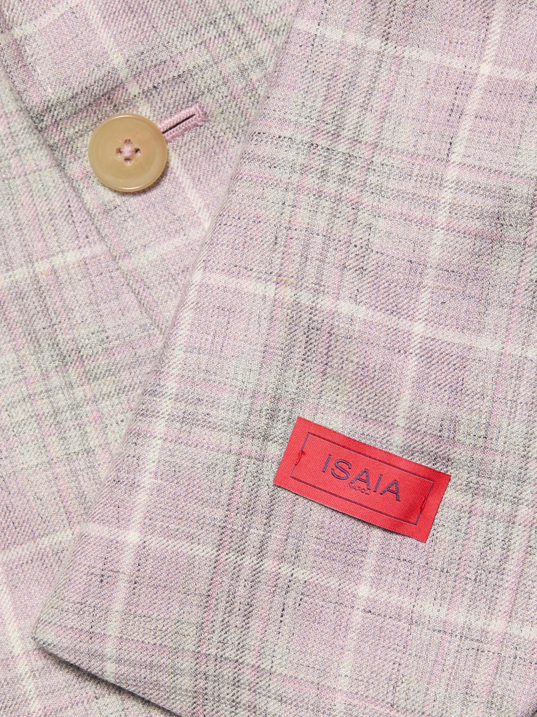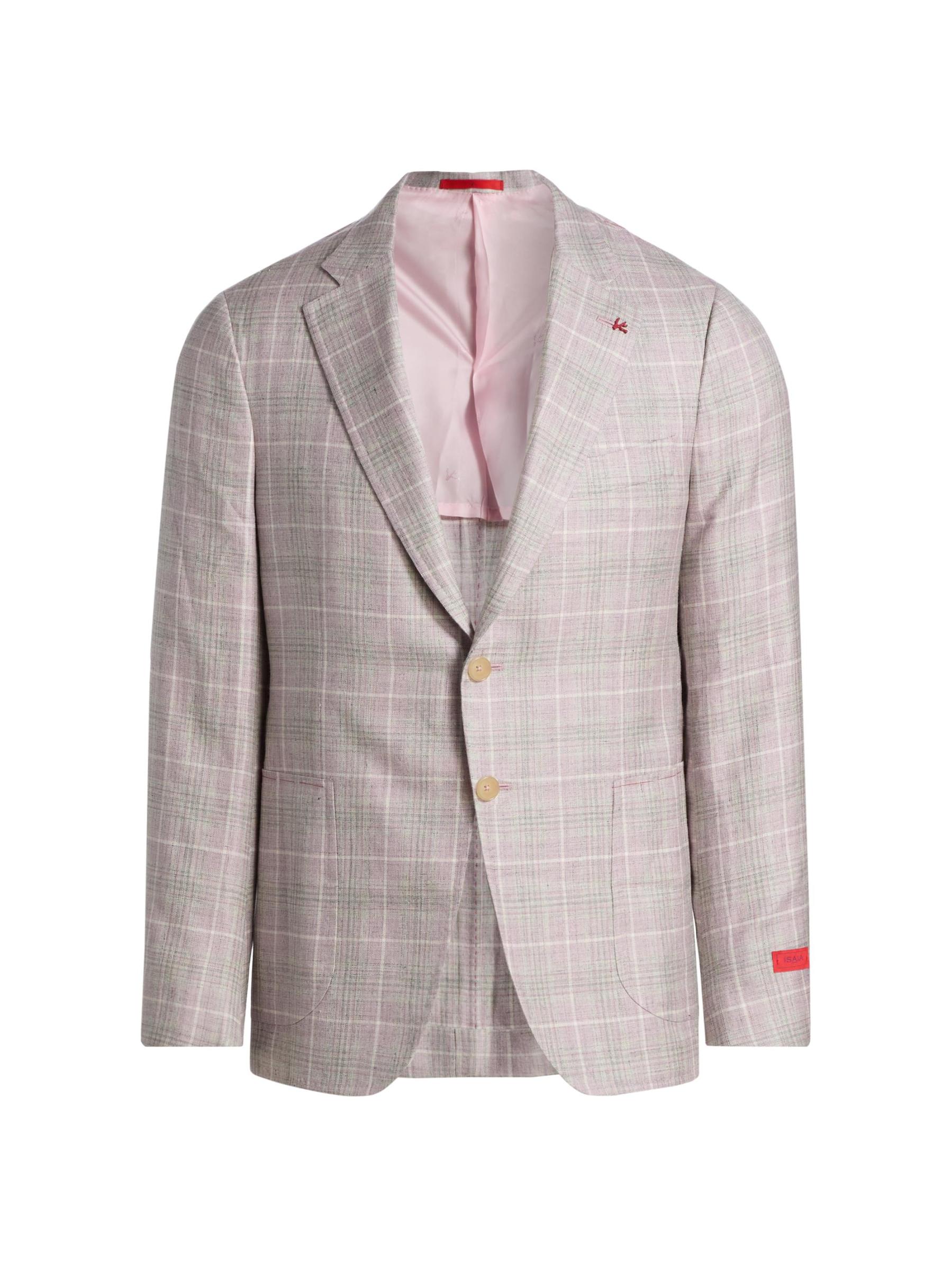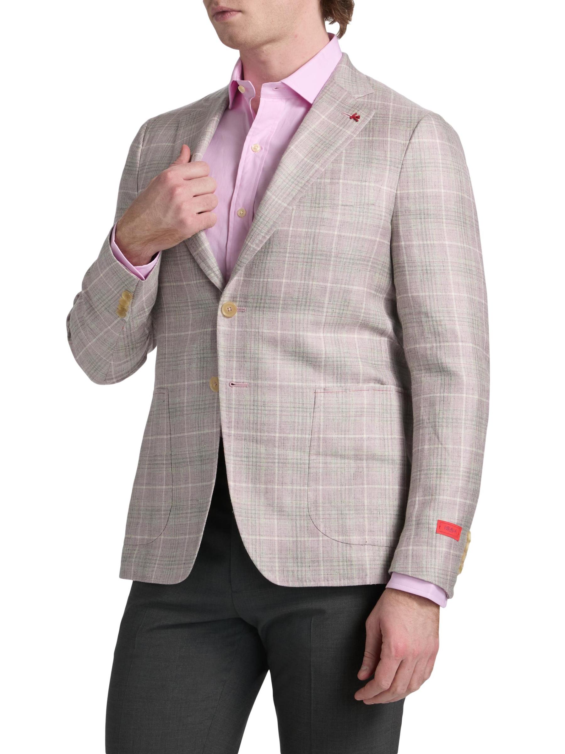 صُنع هذا المعطف الرياضي المنقوش من Isaia من مزيج فاخر من الصوف والحرير والكتان. تُبرز ثنيات الصدر المشقوقة والجيوب الجانبية المزركشة والمزرين للإغلاق الخياطة النابولية المميزة للعلامة التجارية.