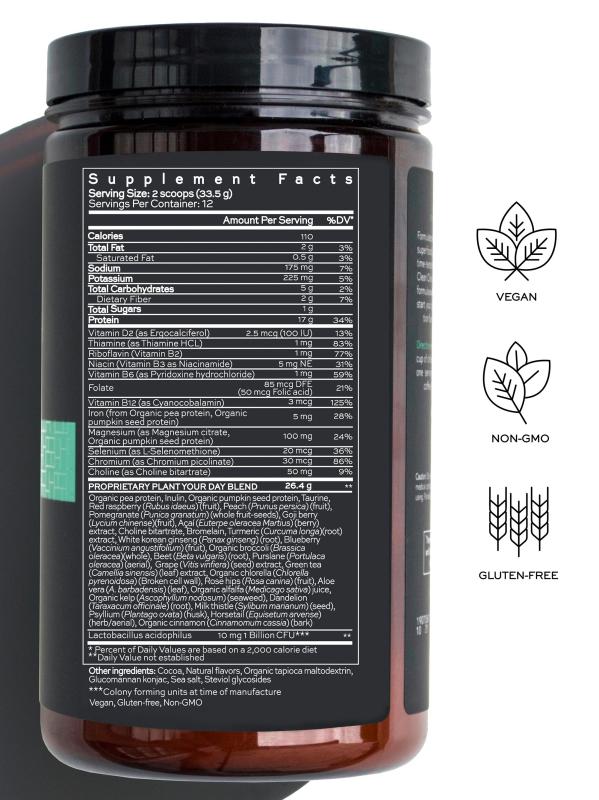 تتكون هذه الوصفة من بروتين اليقطين العضوي، والخضراوات الفائقة، والأطعمة الفائقة، ومضادات الأكسدة فائقة الشحن، وتعمل هذه الوصفة التي تعمل على موازنة درجة الحموضة على تزويد الجسم بتركيبة من مصادر نباتية للحصول على طاقة تدوم طويلاً. 14.18 أونصة، صُنعت في الولايات المتحدة الأمريكية.