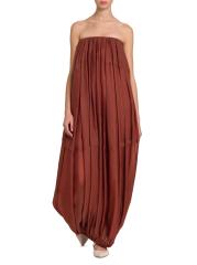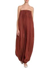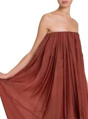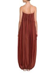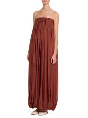 يتميّز فستان Bustier maxi الضخم من FERRAGAMO، المصنوع من الأورجانزا الناعمة، بتصميم عمودي مع طيات متموجة. تتميز هذه القطعة بصدر داخلي لدعم خط العنق المتجمّع، وتتجاوز مظهر الطقس الدافئ إلى قطعة راقية متعددة الطبقات.