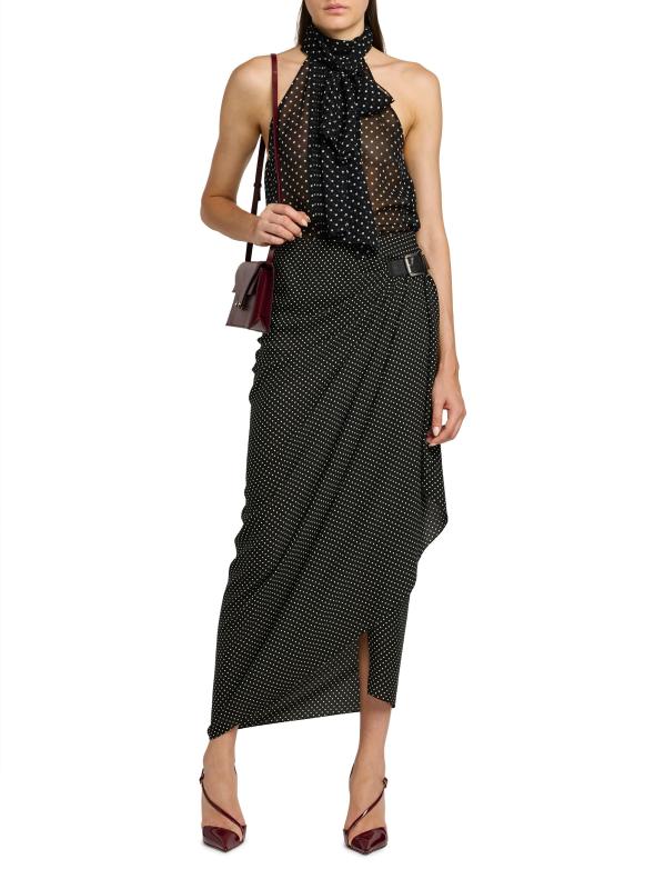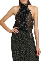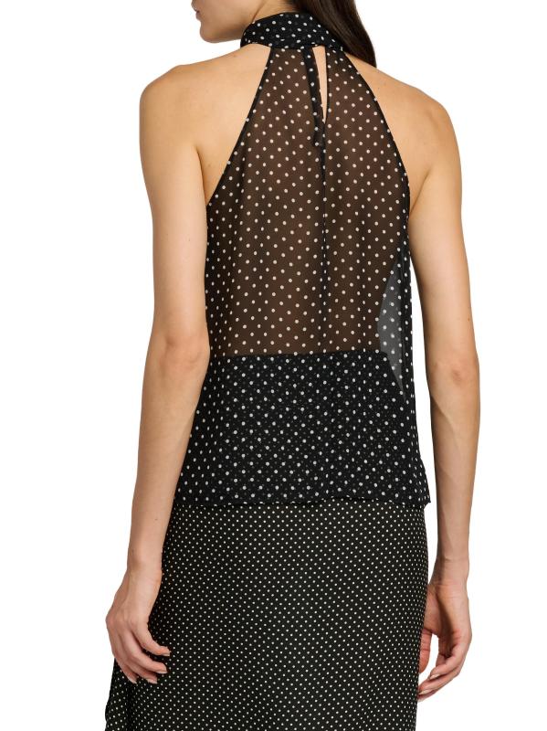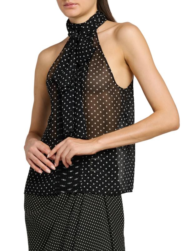 تتميز هذه البلوزة بدون أكمام من توم فورد، والمصنوعة من قماش جورجيت الحريري، بنقشة منقّطة وياقة على شكل ربطة