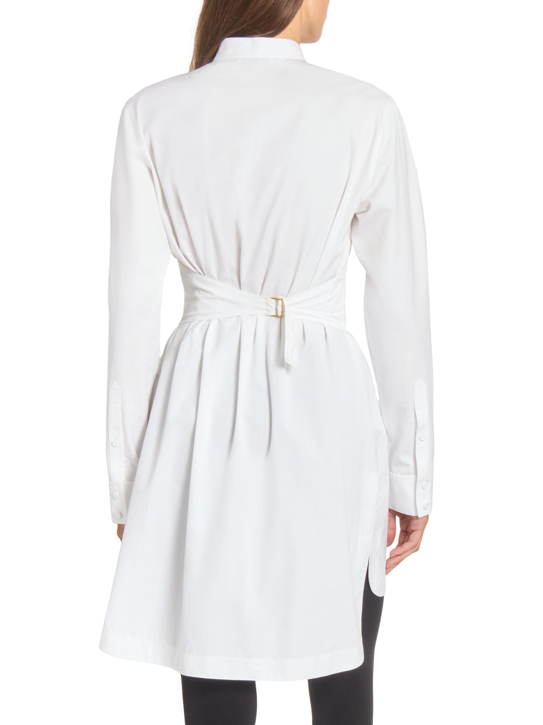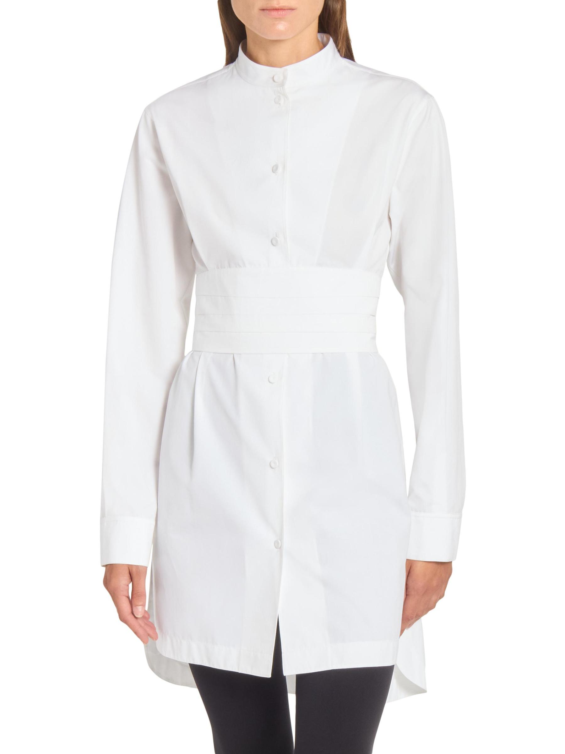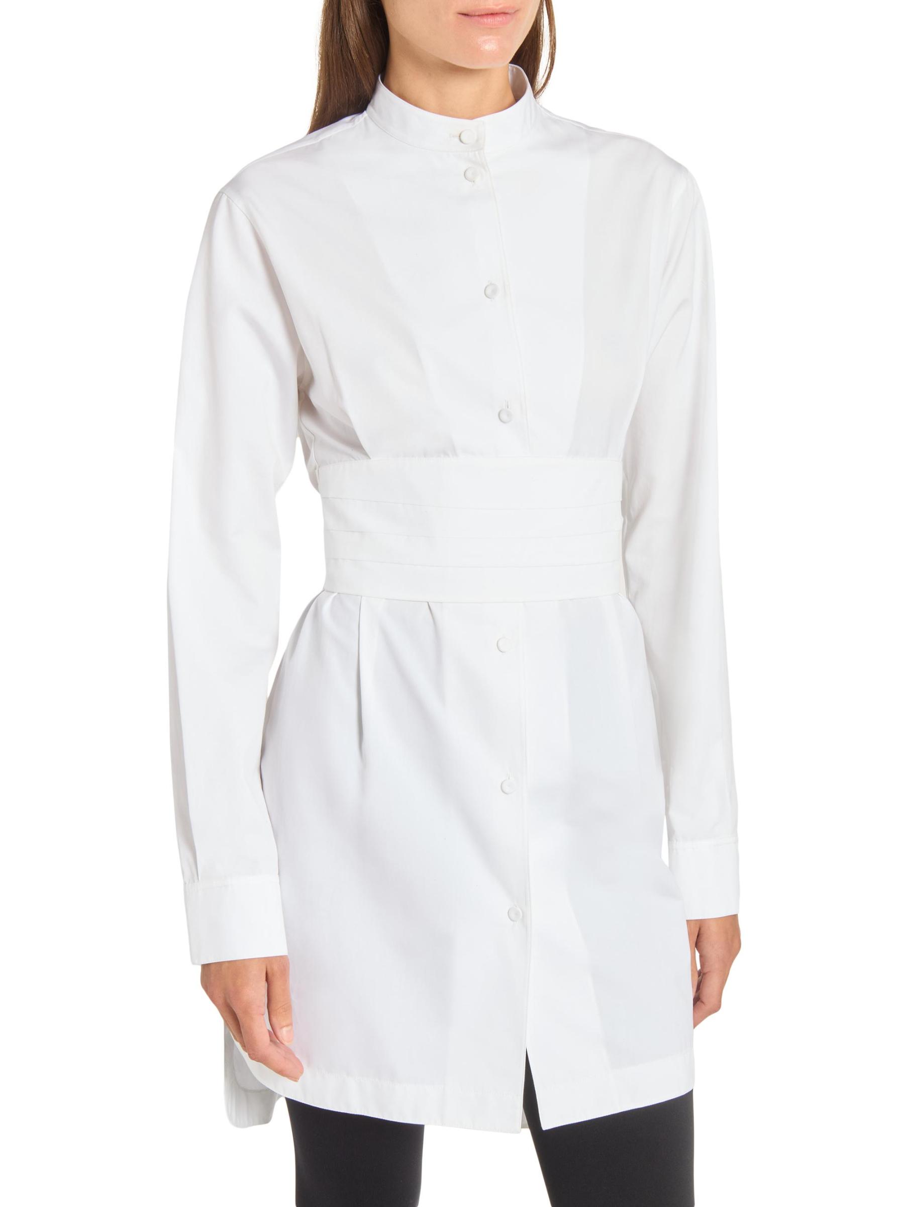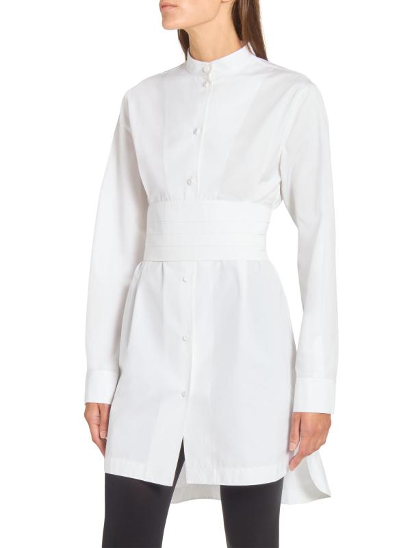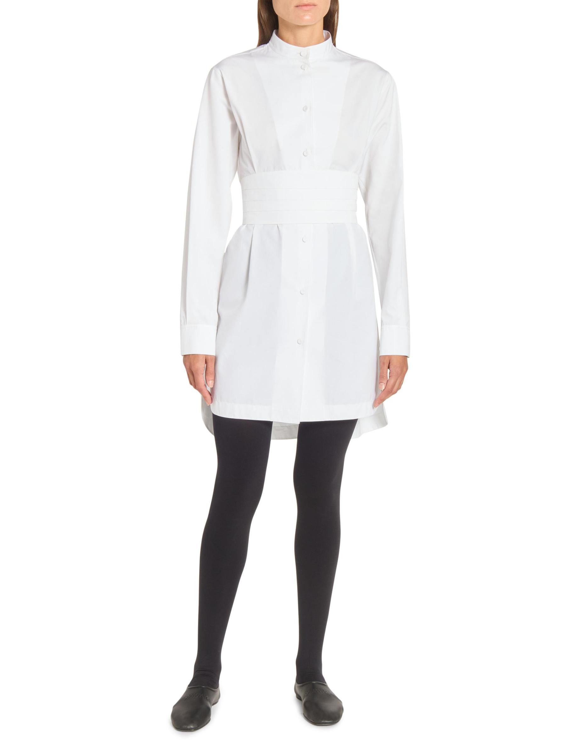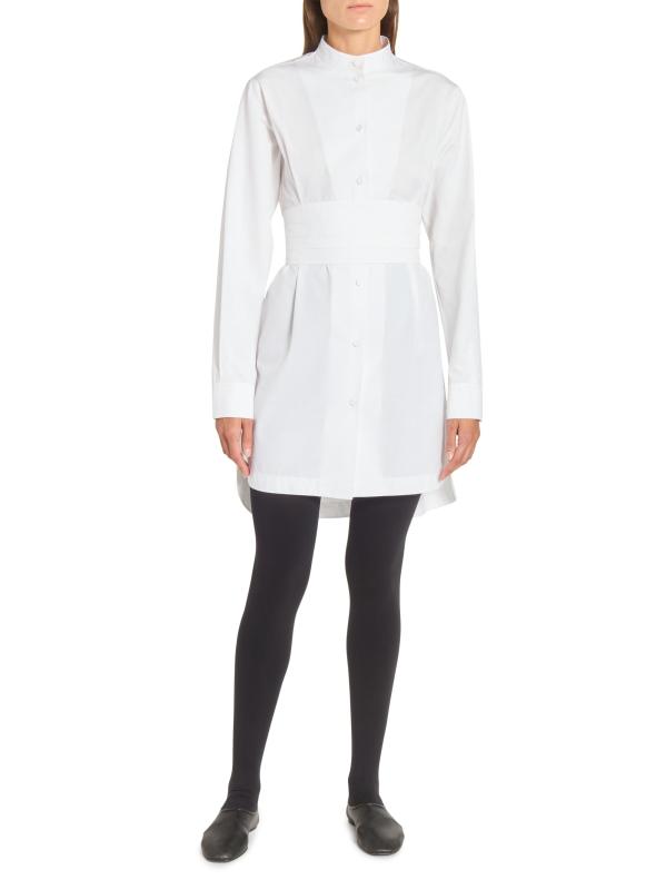 يستمد فستان Alaïa الصغير المصنوع من البوبلين الإلهام من الملابس الرجالية مع هذا التصميم الظلي المصمم على طراز التوكسيدو، والذي يتميز بحزام مستوحى من الكمبريند وحافة على شكل ذيل القميص.طوق الفرقة أكمام طويلة حلقة على شكل حرف D في الخلف إغلاق بأزرار أمامية قطن بنسبة 100% تنظيف جاف صُنع في إيطاليا