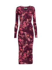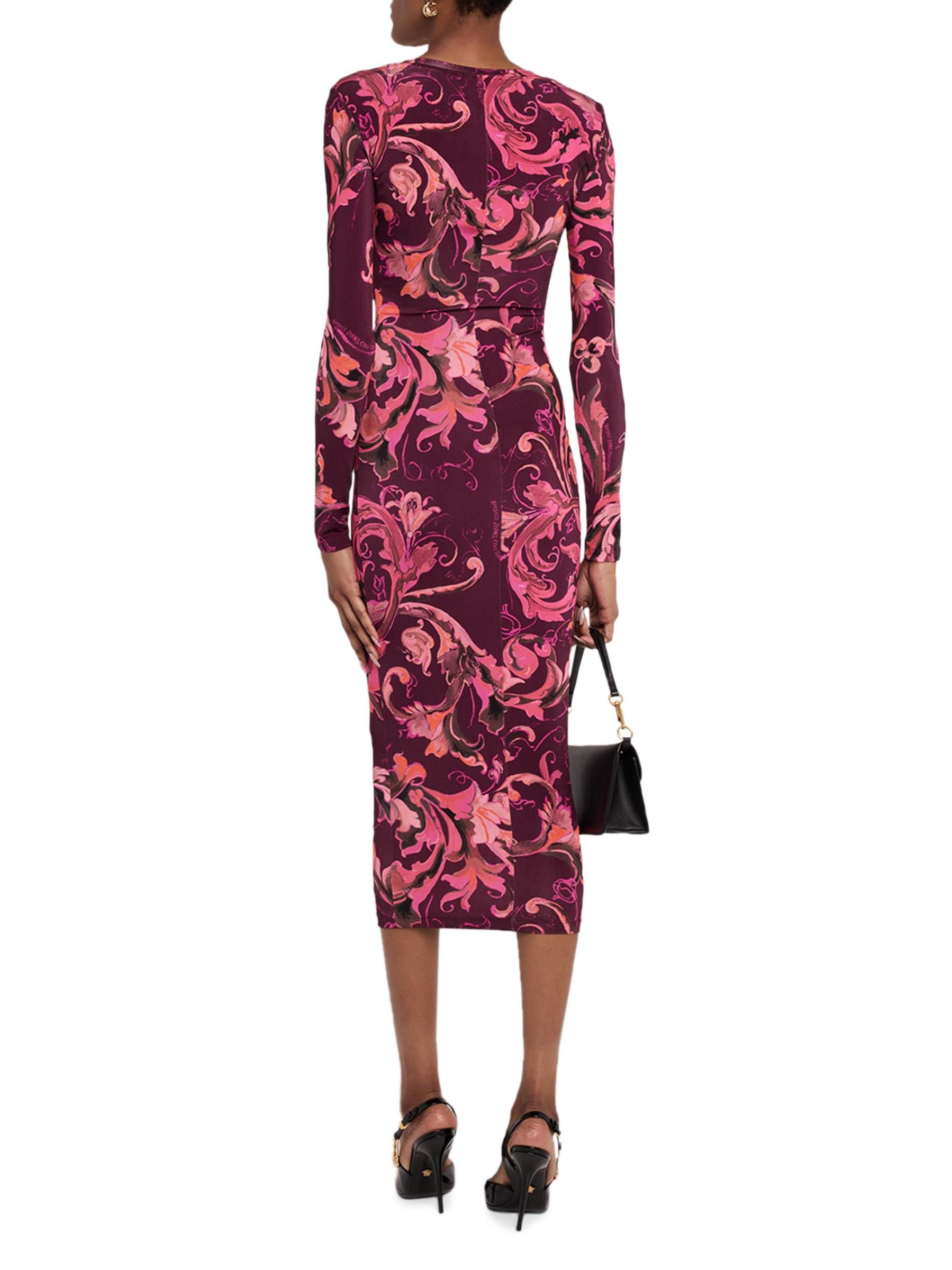 يتميّز هذا الفستان المتوسط من فيرساتشي جينز كوتور، المصنوع من الجيرسيه الشبكي الناعم، بزخرفة باروكو المصنوعة بالكامل من البورسلين وبأكمام طويلة.