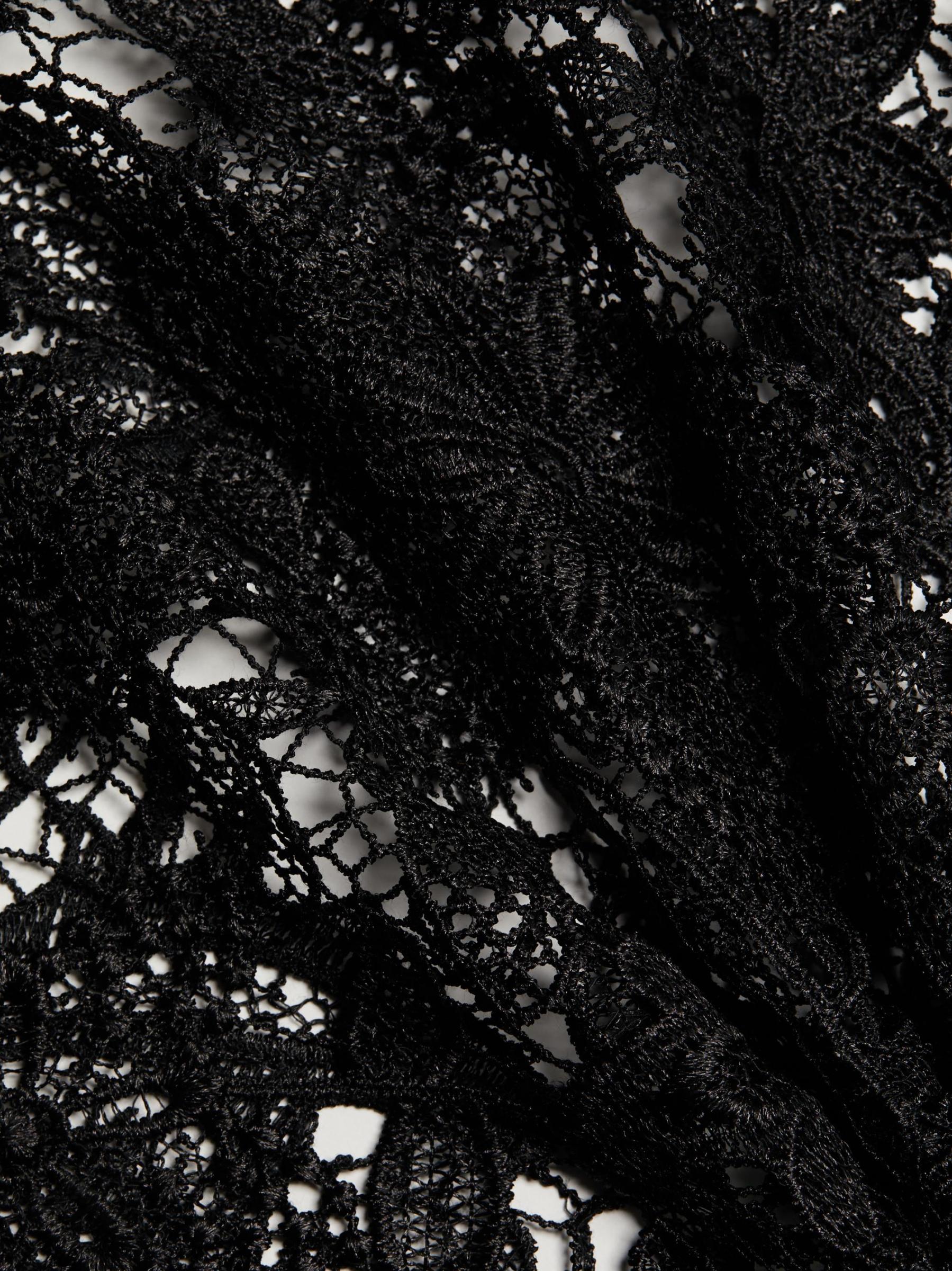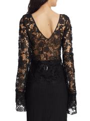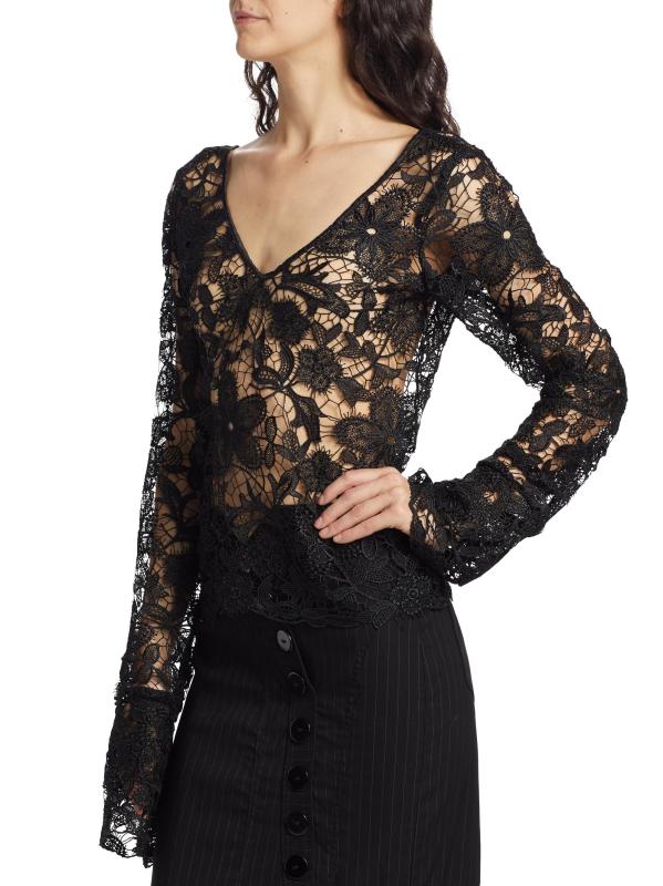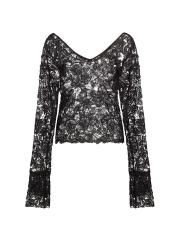 من المقدمة: مجموعة حكايات آما. تتميّز هذه البلوزة ذات الأكمام الطويلة من House of Aama بتصميم خارجي شفاف من الكروشيه، وتكتمل بتقويرة واسعة على شكل حرف V وتصميم من الدانتيل المزهّر.