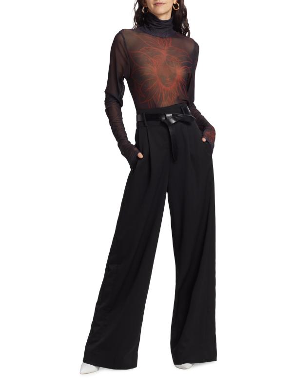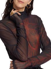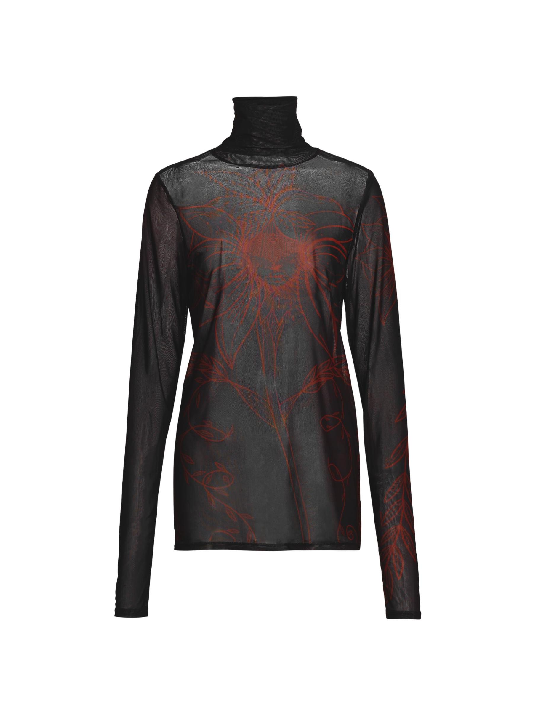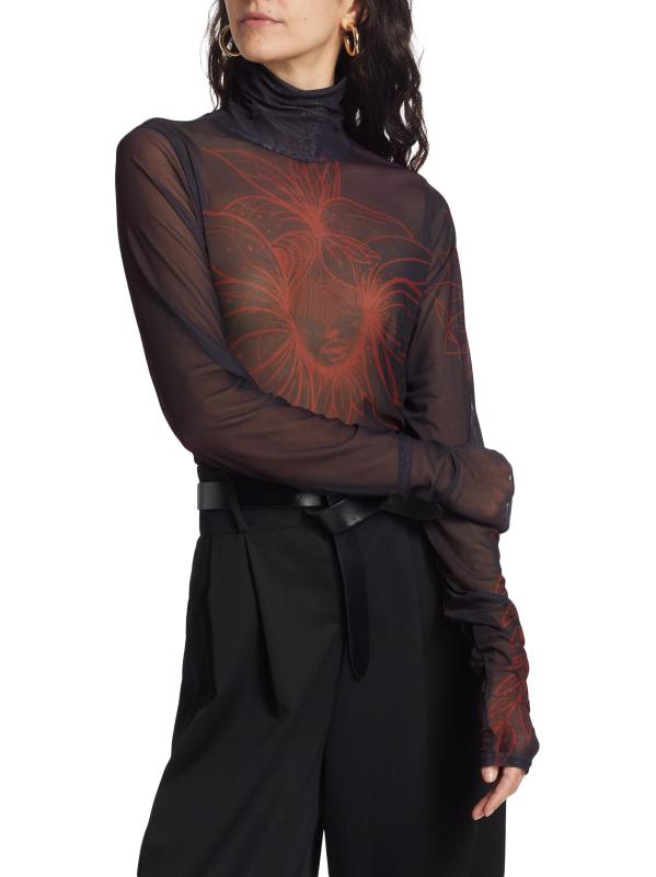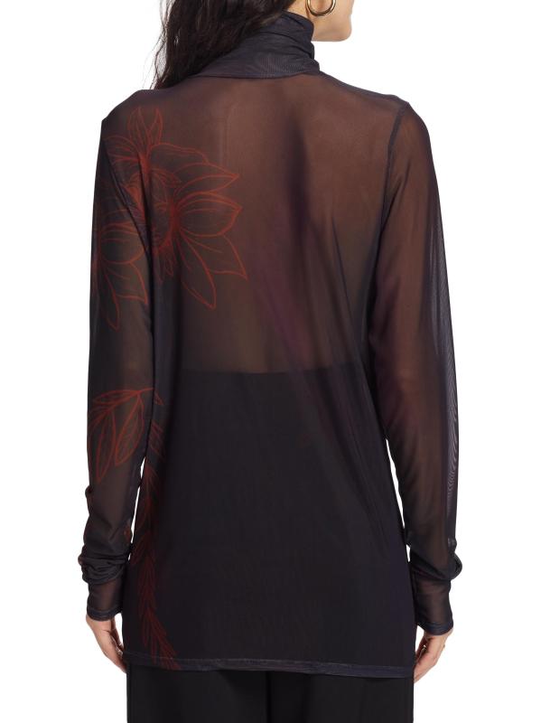من المقدمة: مجموعة حكايات آما. تتميّز بلوزة House of Aama ذات الياقة المدورة المصنوعة من الشبك شبه الشفاف بطبعات زهرية متباينة.بلوفر بياقة عالية أكمام طويلة تسحب 90% نايلون/ 10% سباندكس تنظيف جاف صُنع في الولايات المتحدة الأمريكية من قماش أمريكي