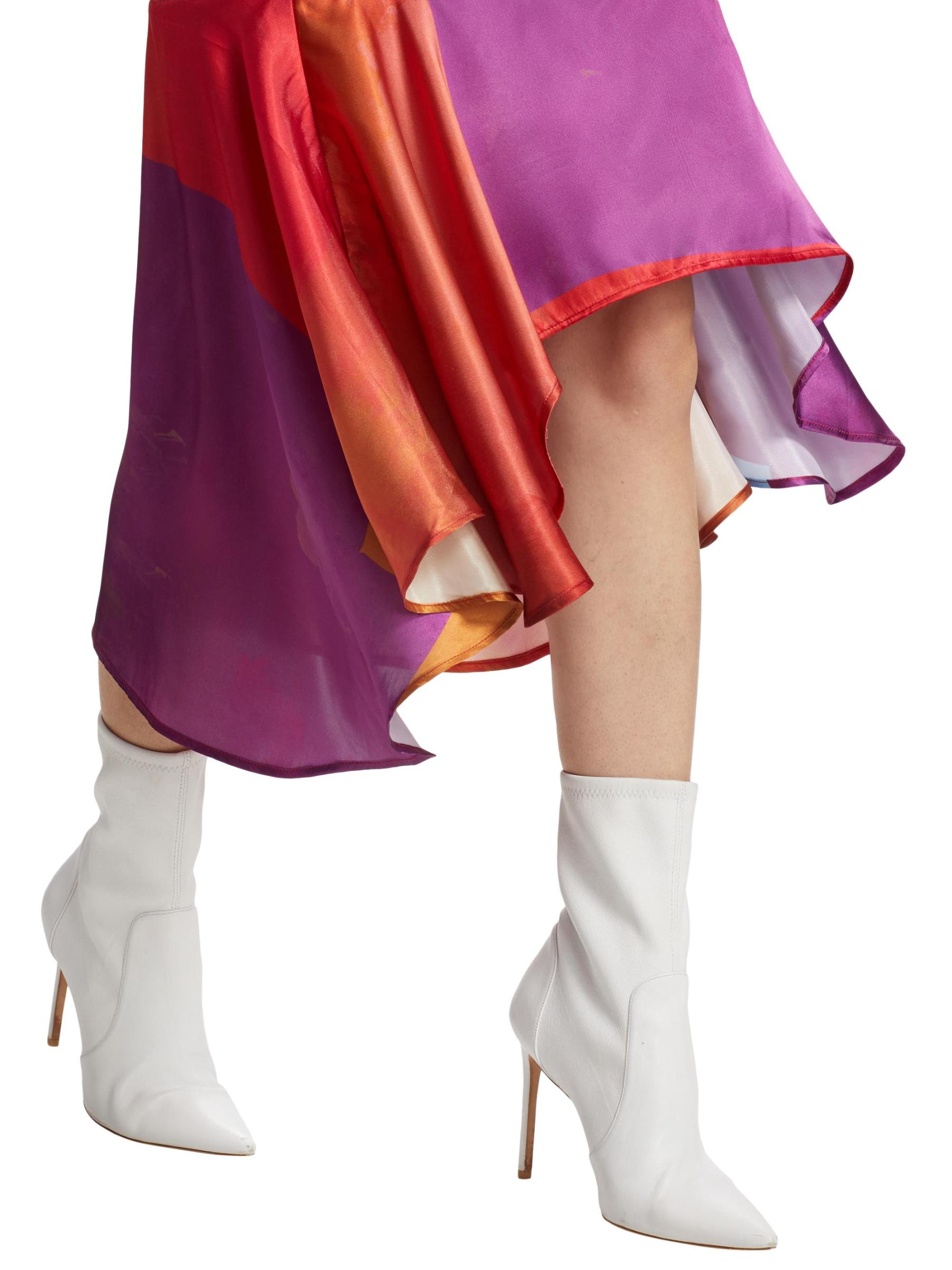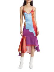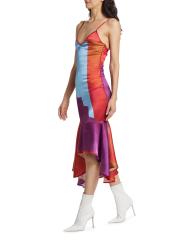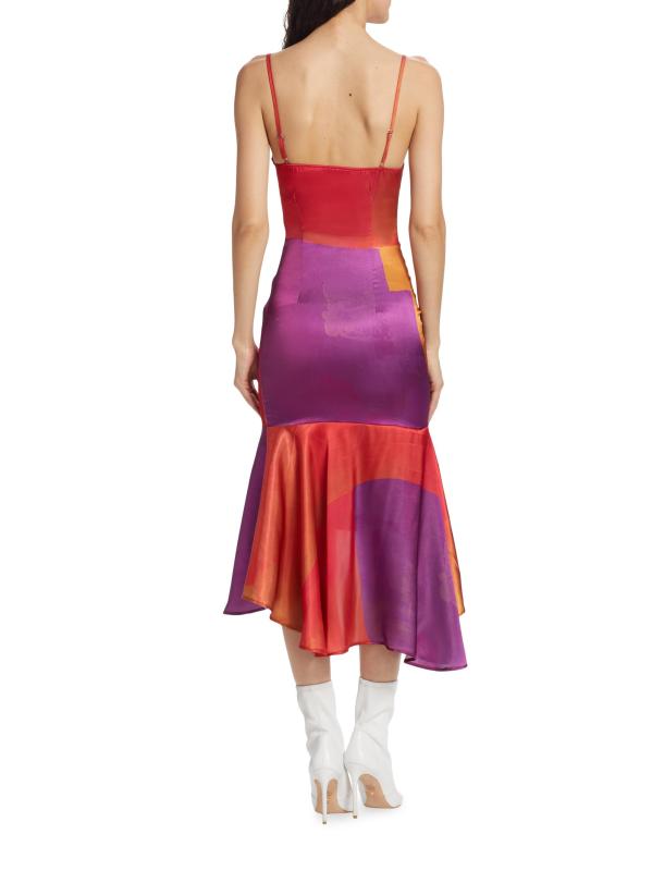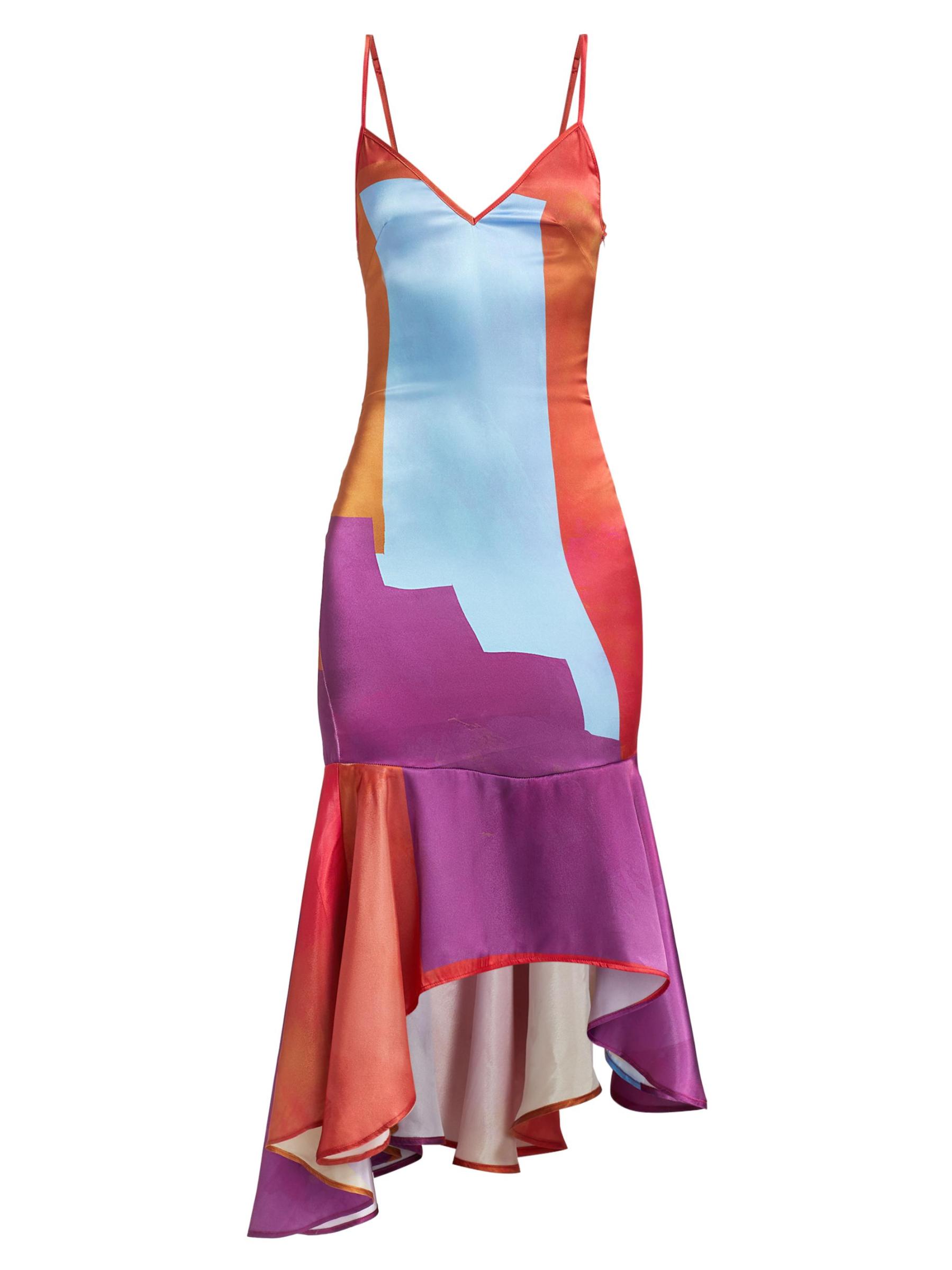 من المقدمة: مجموعة حكايات آما. يتميّز فستان «نايت سكاي» المتوسط بدون أكمام والمصنوع من الساتان اللامع من House of Aama بنقشة ملونة وحاشية منسدلة غير متماثلة.