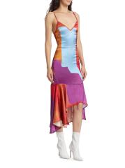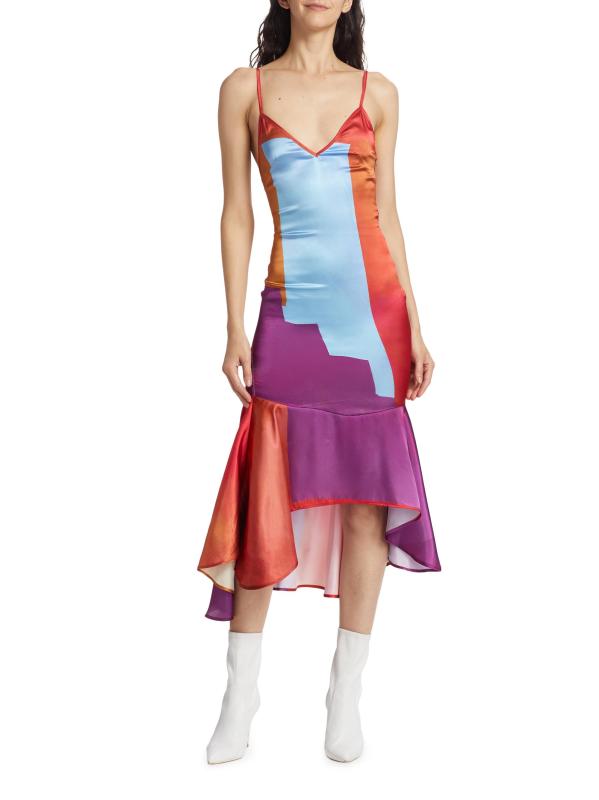 من المقدمة: مجموعة حكايات آما. يتميّز فستان «نايت سكاي» المتوسط بدون أكمام والمصنوع من الساتان اللامع من House of Aama بنقشة ملونة وحاشية منسدلة غير متماثلة.رقبة واسعة على شكل حرف V أحزمة سباغيتي افتح المربع الخلفي حافة غير متماثلة إغلاق بسحّاب جانبي مخفي 100% بوليستر تنظيف جاف صُنع في الولايات المتحدة الأمريكية من قماش أمريكي