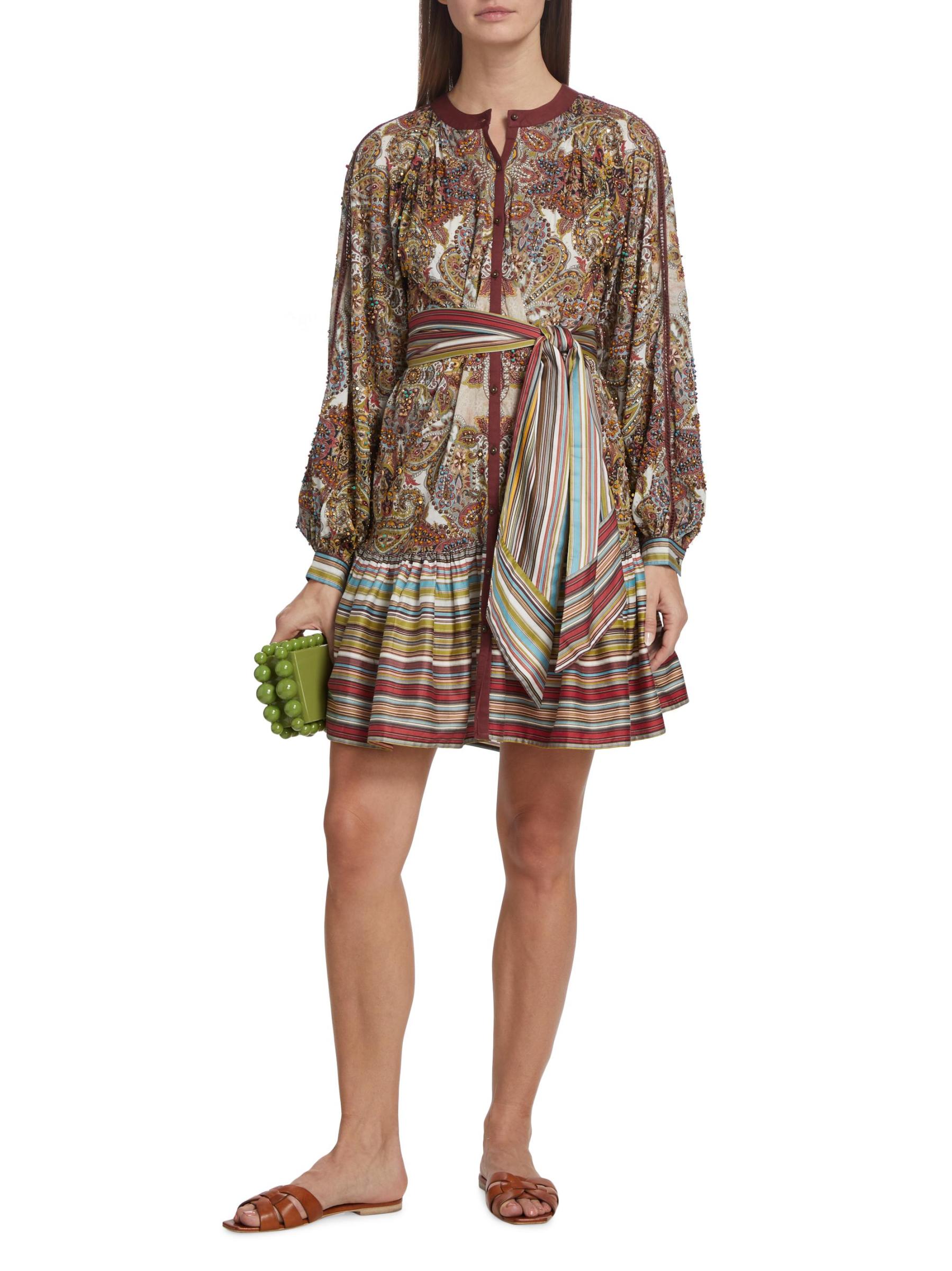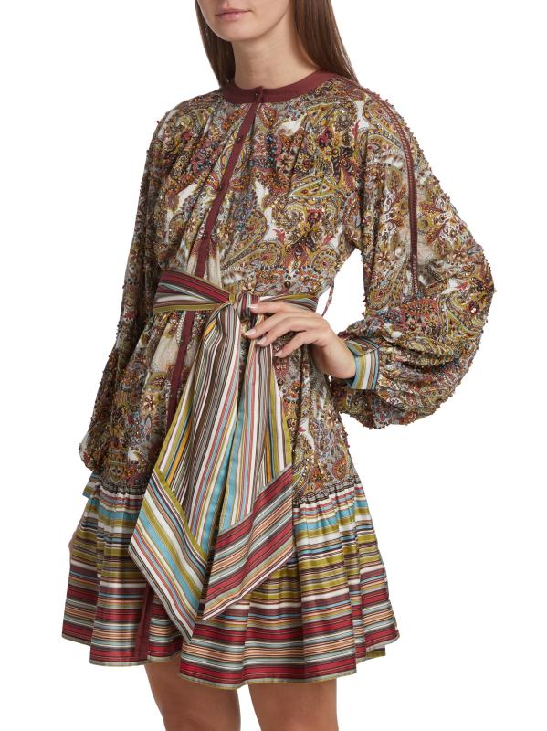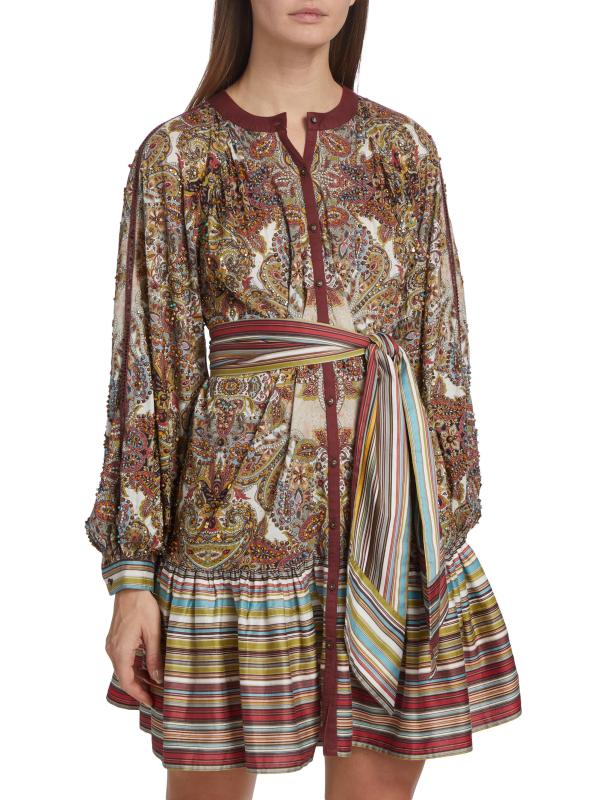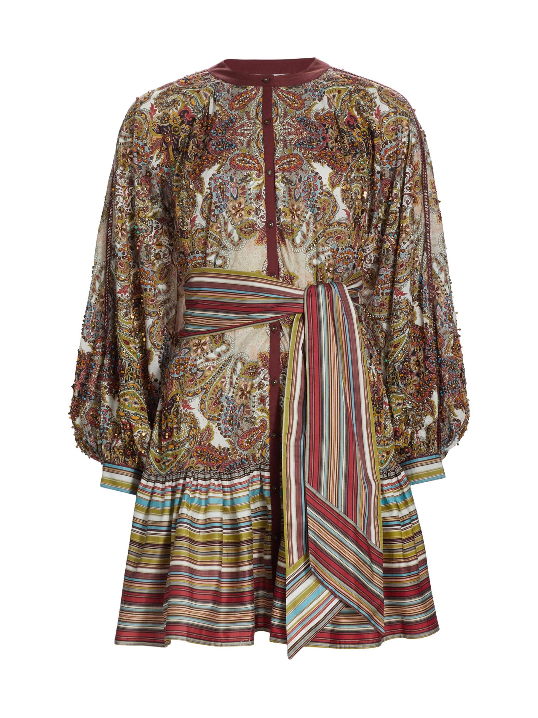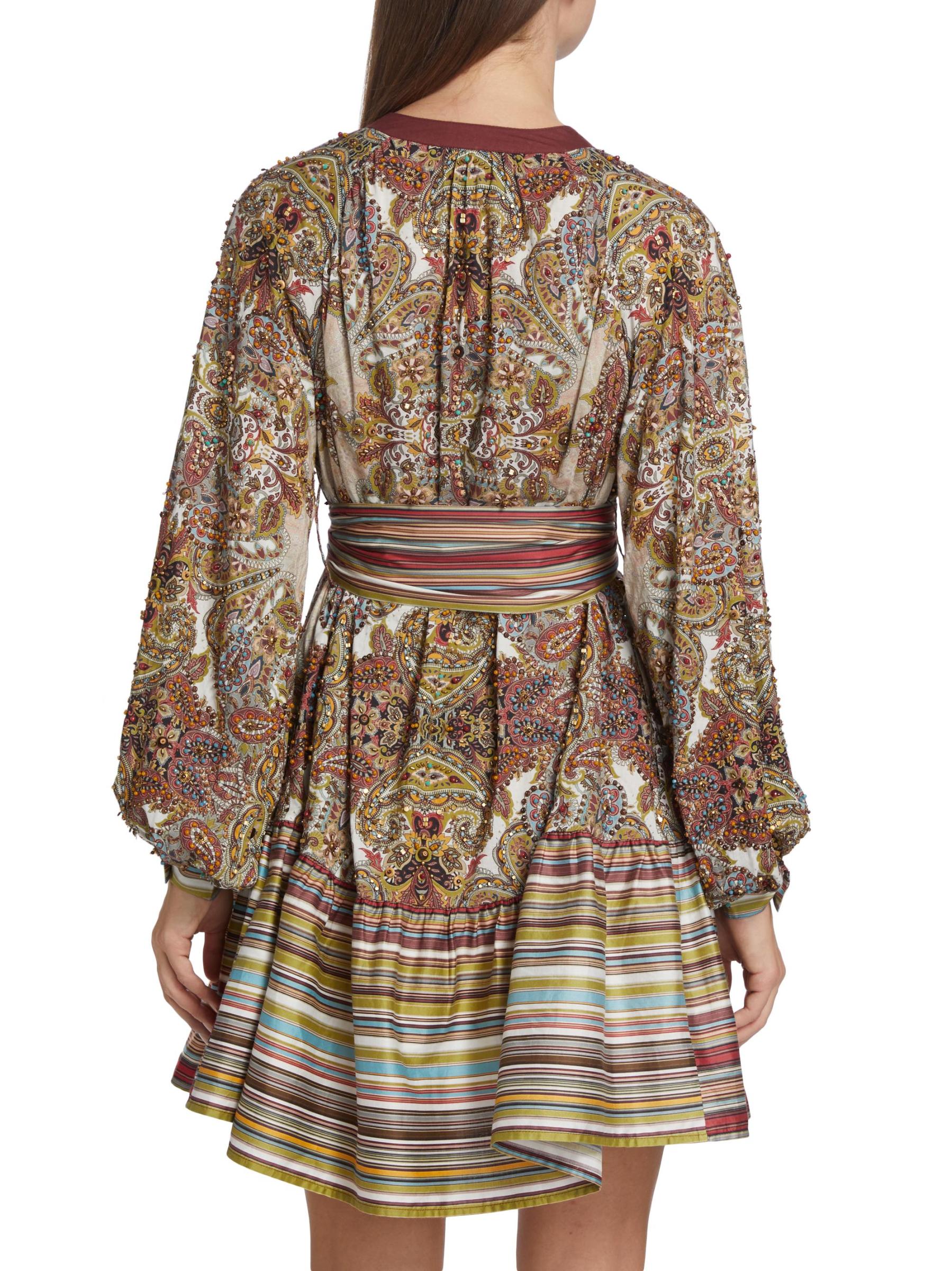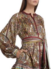 يتميّز فستان كاليبسو سانت بارث بأكمام واسعة من البالونات، ويتميز بتفاصيل رائعة بنقشة بيزلي نابضة بالحياة ومزين بالخرز اليدوي الأنيق. تم تزيين هذا التصميم المتدرج بحزام خصر عريض.