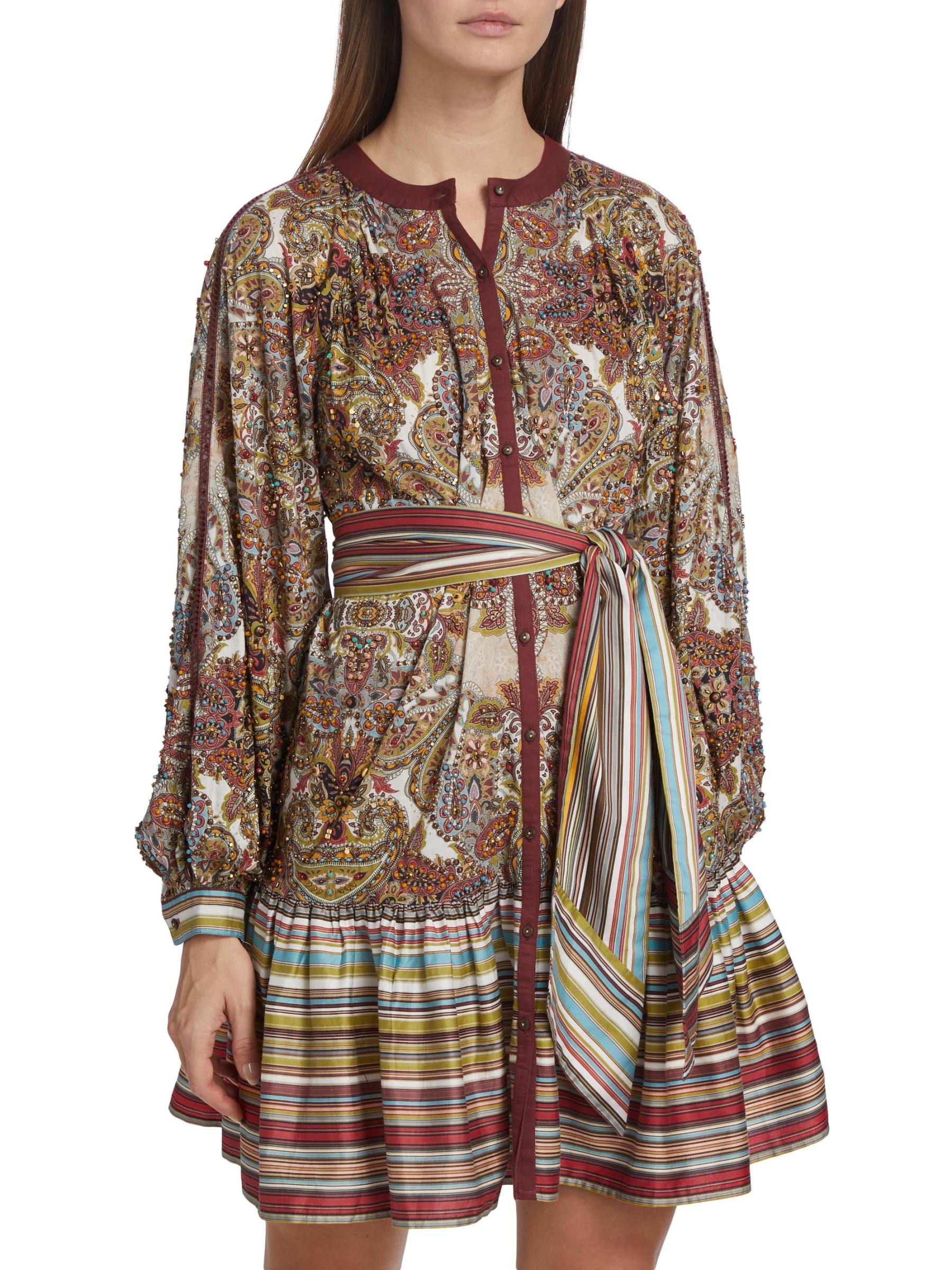 يتميّز فستان كاليبسو سانت بارث بأكمام واسعة من البالونات، ويتميز بتفاصيل رائعة بنقشة بيزلي نابضة بالحياة ومزين بالخرز اليدوي الأنيق. تم تزيين هذا التصميم المتدرج بحزام خصر عريض.رقبة مستديرة أكمام طويلة أساور بأزرار فتحة زر أمامية حزام قابل للإزالة فيسكوز 100% تنظيف جاف مستوردة