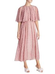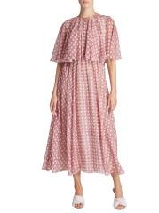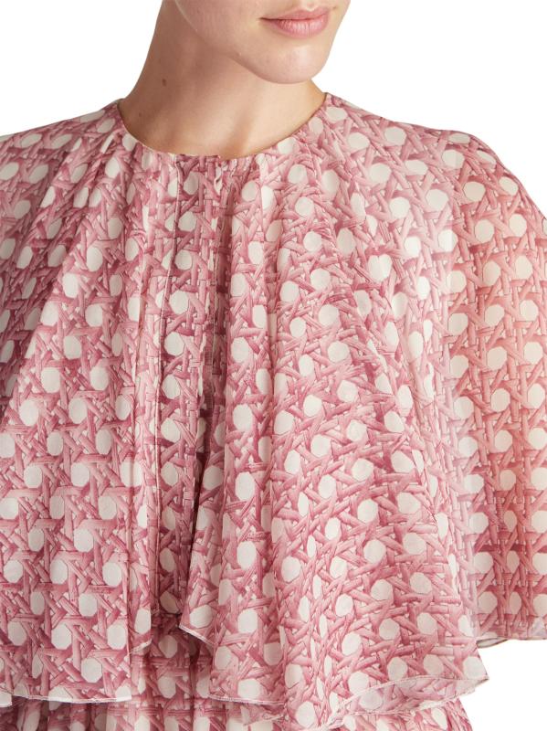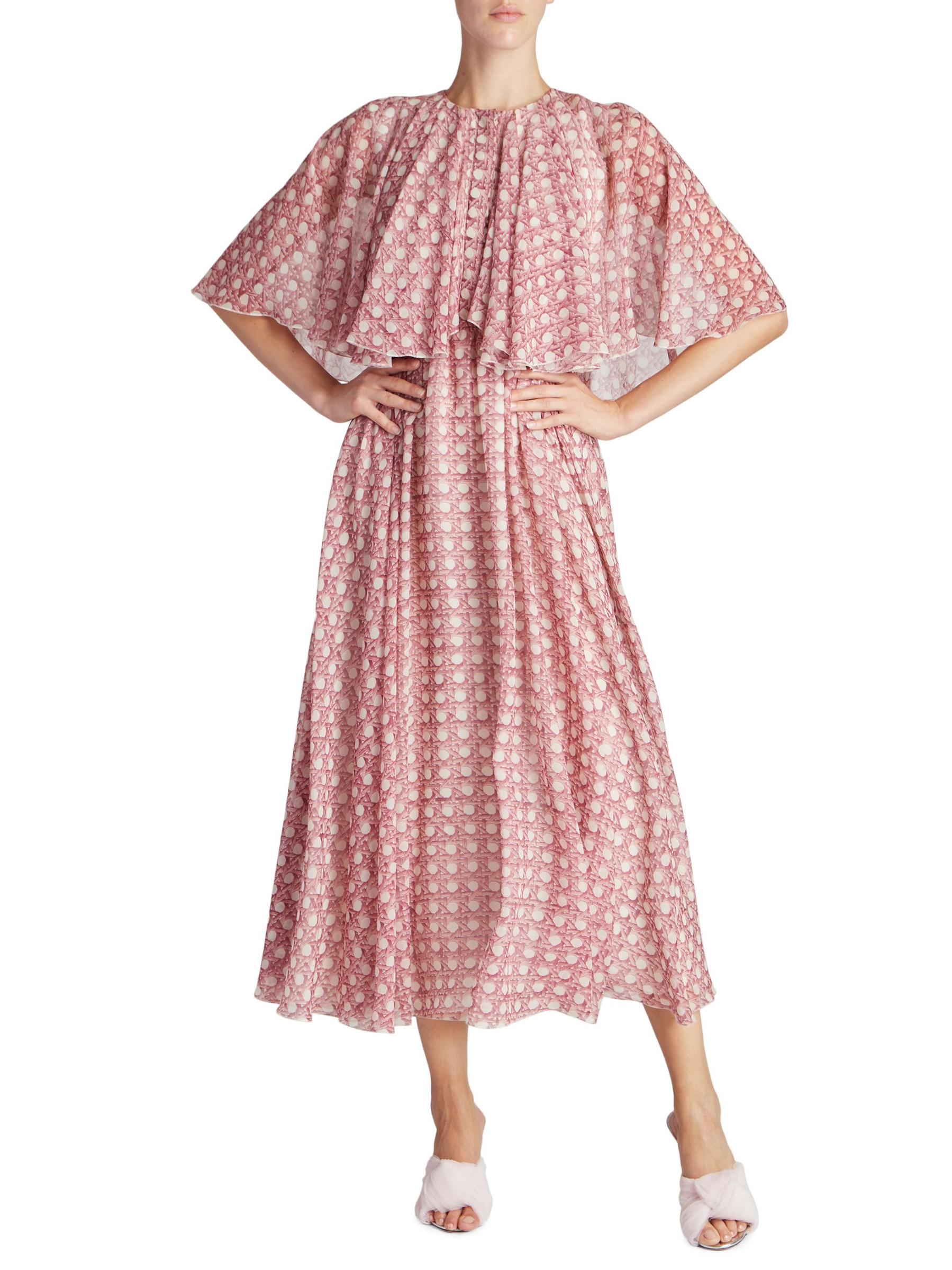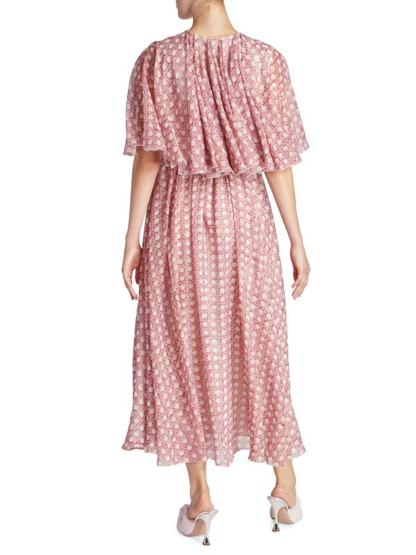 يُظهر فستان Giambattista Valli المذهل متوسط الطول المصنوع من الحرير طبعة مستوحاة من الخوص مزينة بزخرفة دائرية. يُبرز هذا الطراز تصميمًا فولكلوريًا معزّزًا بكباليت واسع على الكتفين.