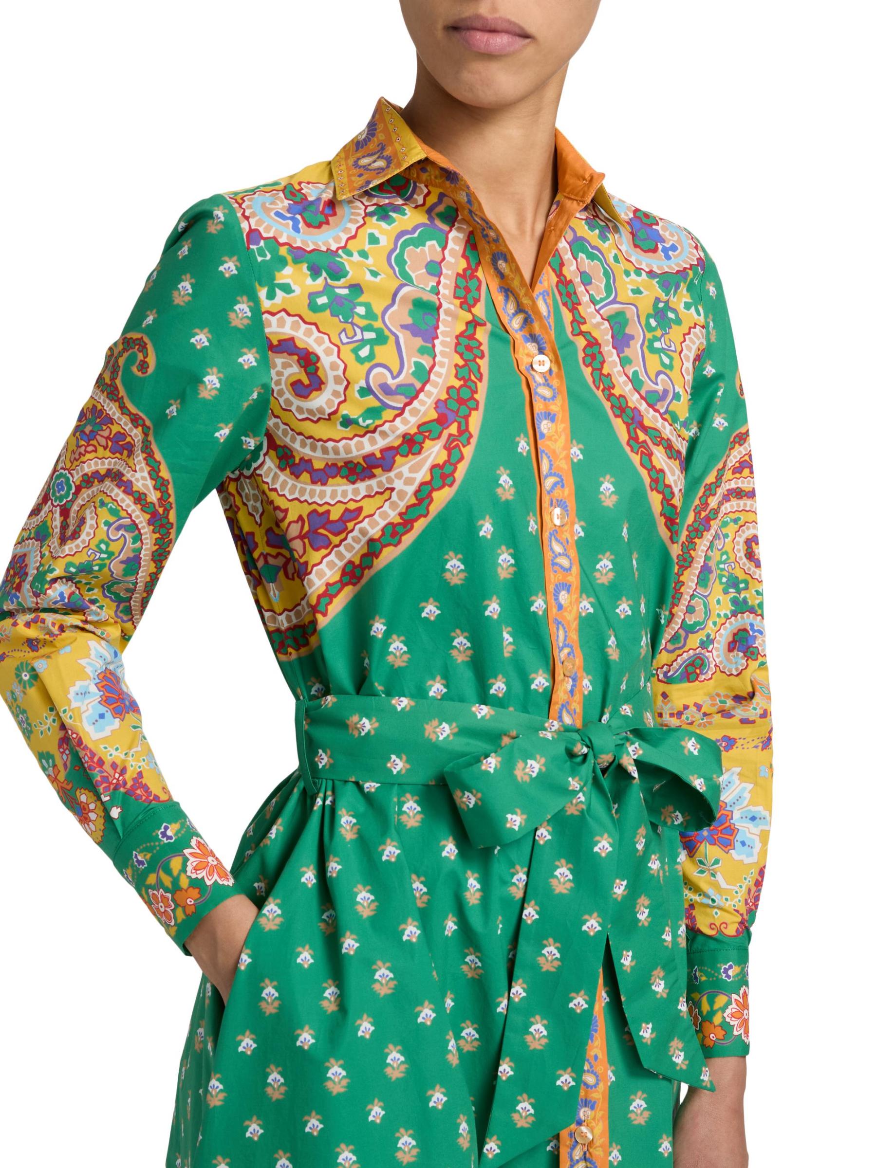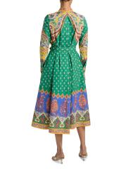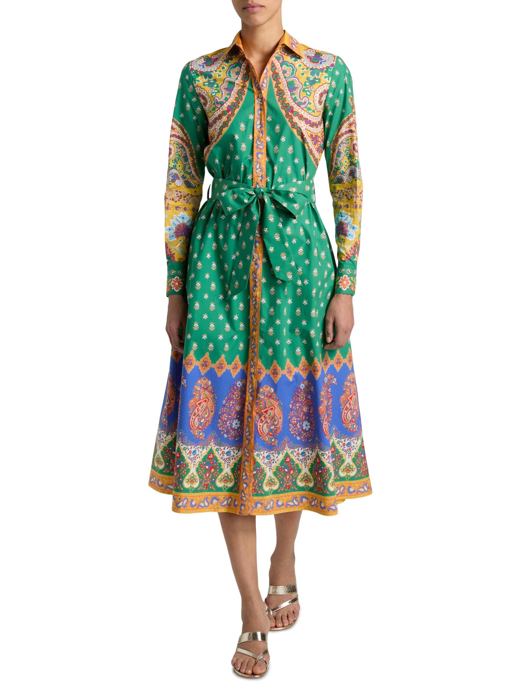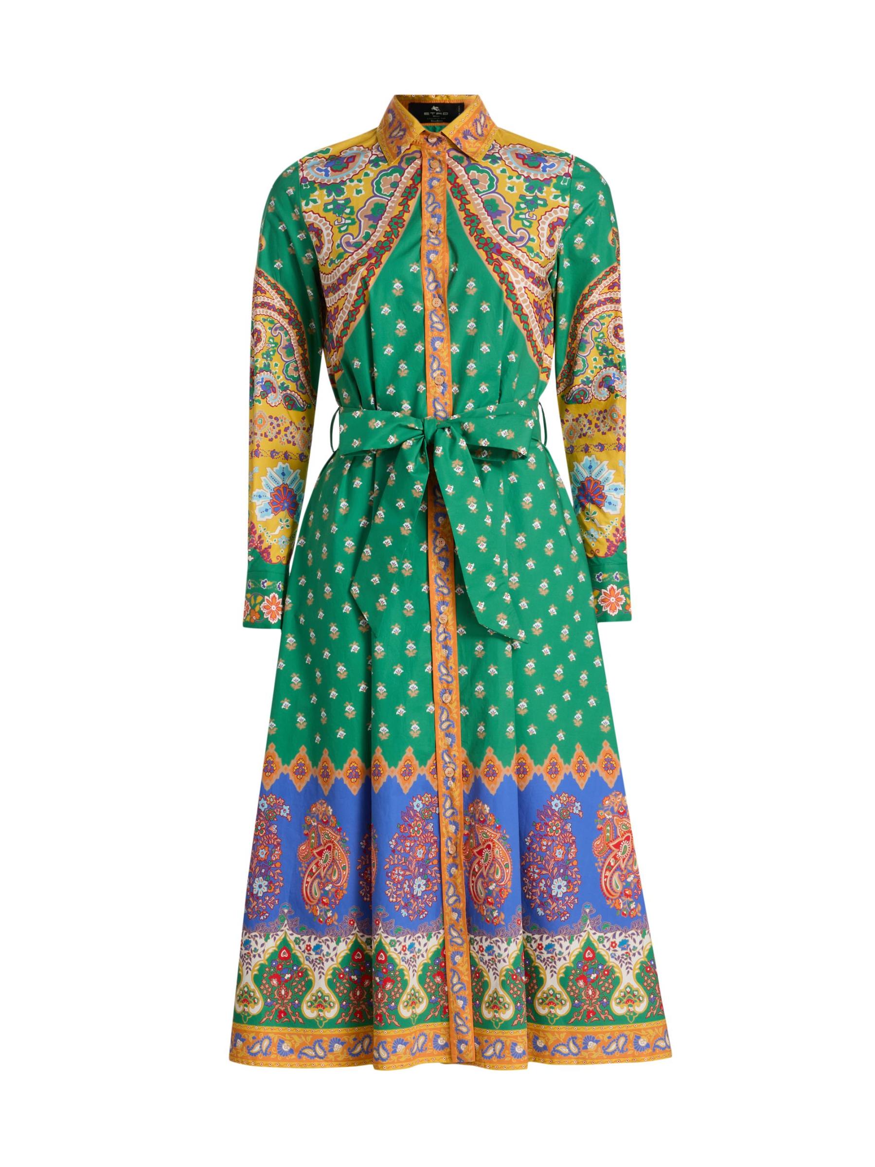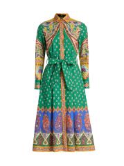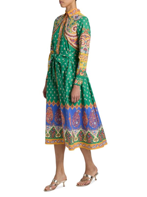 يُظهر فستان Etro متوسط الطول المصنوع من القطن الخفيف الطباعة المشرقة المميزة للعلامة التجارية. تم تصميمه بحزام قابل للربط الذاتي لتشكيل الخصر، وينسجم مع تنورة كاملة على شكل حرف A مع جيوب على شكل درزات.