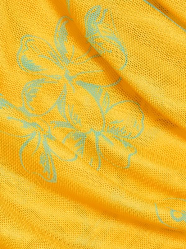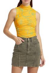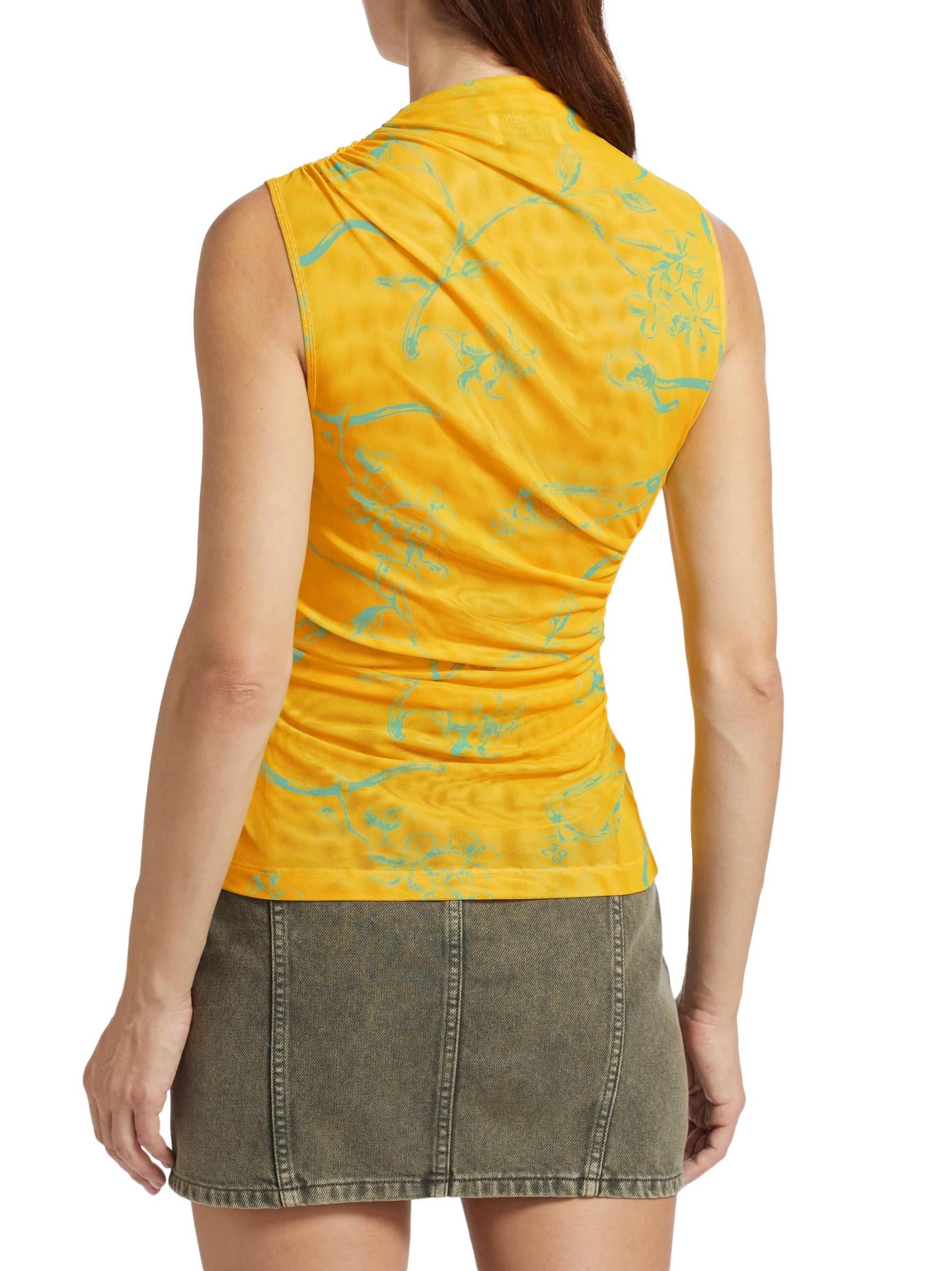 تتميّز بلوزة موسكينو الشبكية بلا أكمام، التي تتميّز بقصّة ضيقة، بطبعة زهرية مستوحاة من الطراز الاستوائي تُبرز تفاصيل منسدلة.