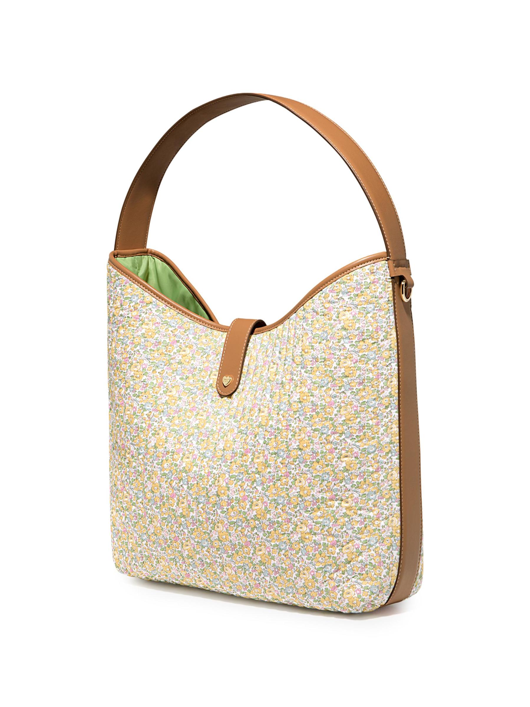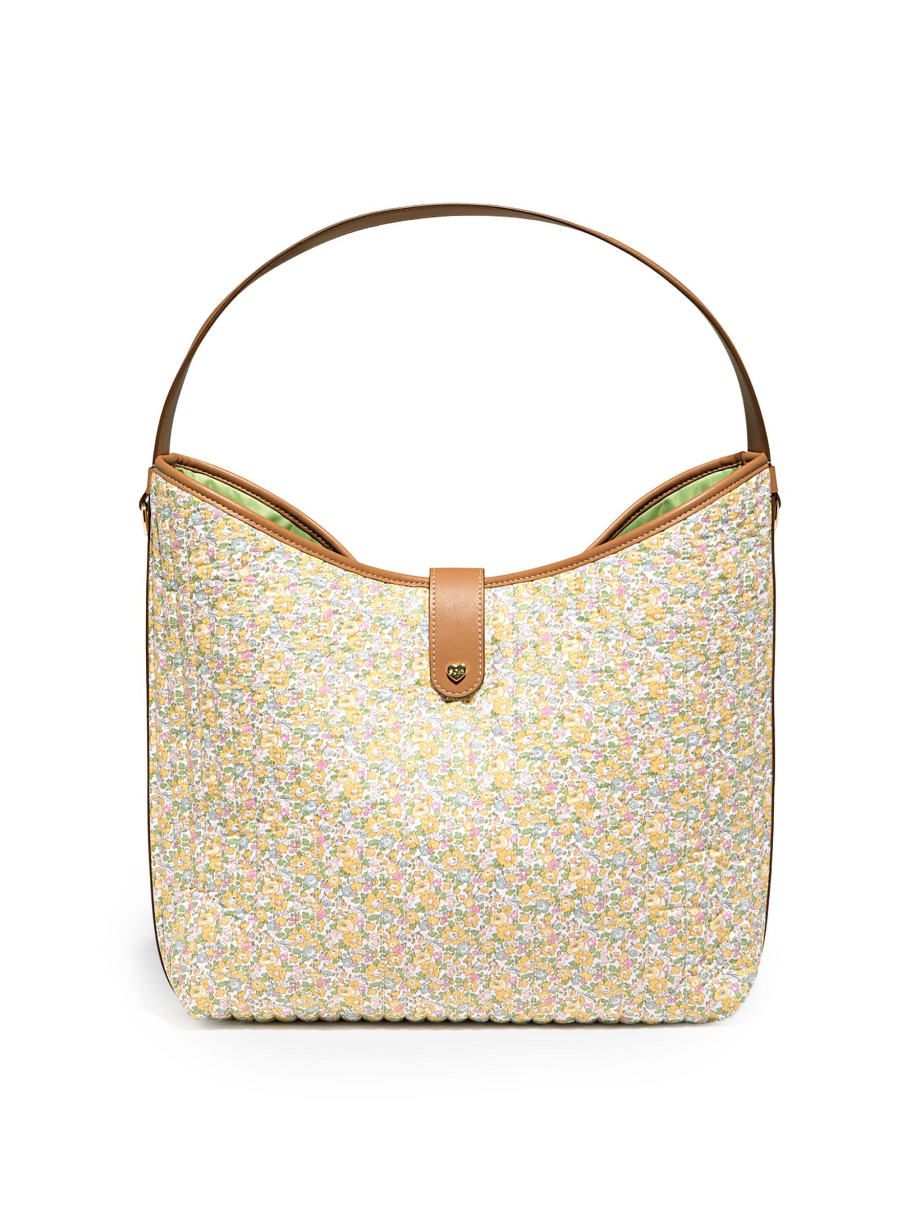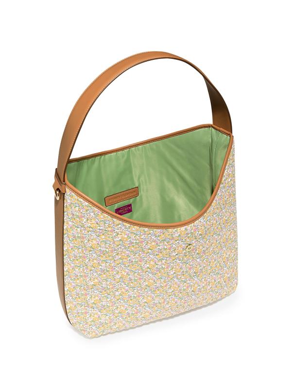 حقيبة هوبو المترهلة هذه من Stoney Clover Lane مصنوعة من قطن Liberty الزهري المميز للعلامة التجارية وتتميز بمقبض علوي وحزام قابل للإزالة وزر إغلاق.