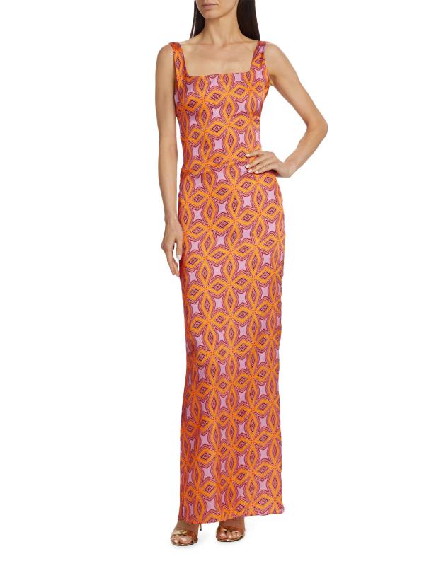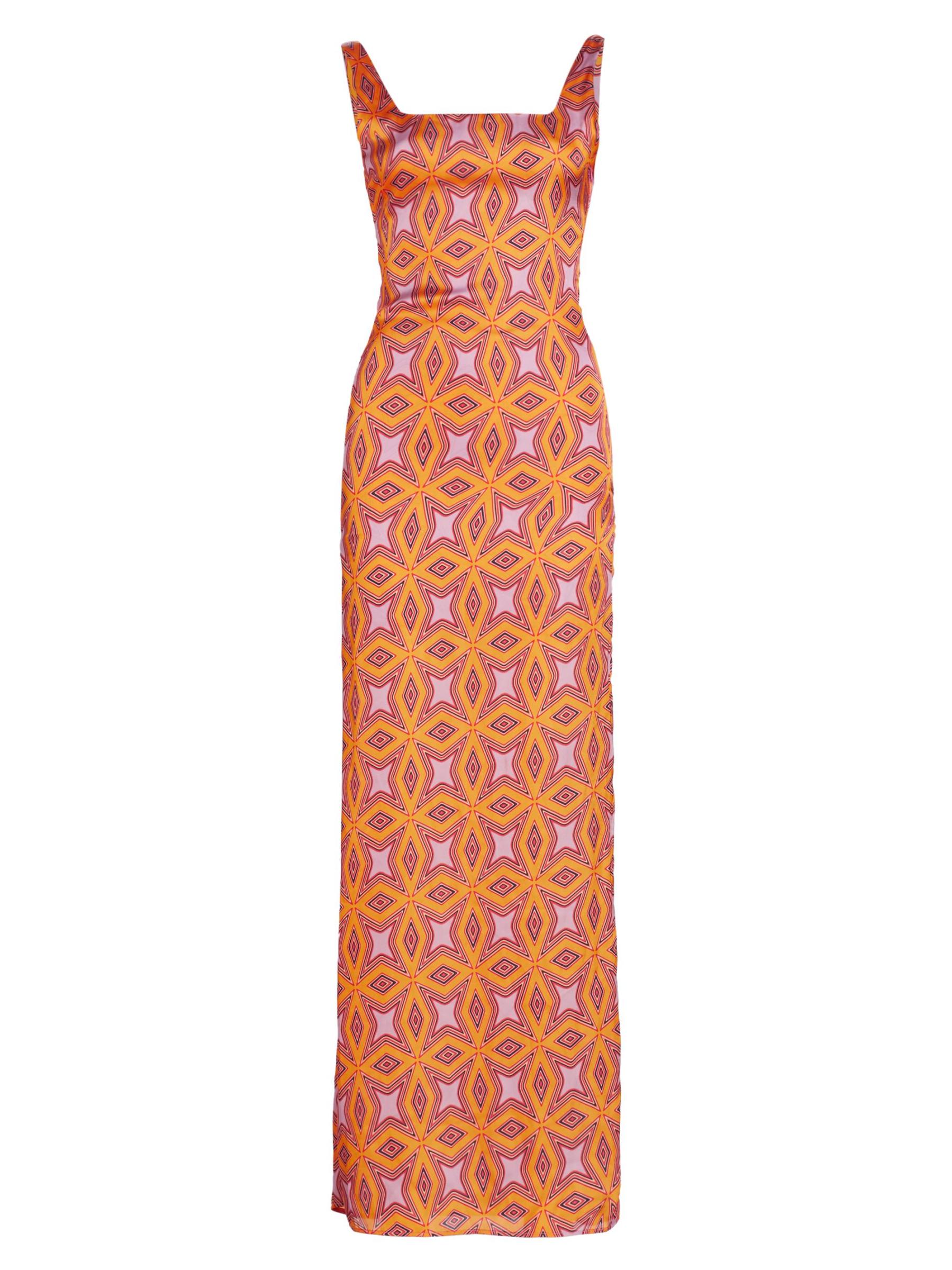 يتميز فستان Priyagold الطويل من Claude Kameni بطبعة هندسية جريئة. خط العنق المربع يكمل التصميم.