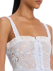 من LoveShackFancy، صُنعت بلوزة Pruitt من قماش قطني خفيف الوزن مع ألواح من الدانتيل وتطريز الأزهار في جميع الأنحاء.فتحة رقبة مربعة بدون أكمام إغلاق أمامي بحلقة وزر قطن غسيل يدوي أو تنظيف جاف مستوردة