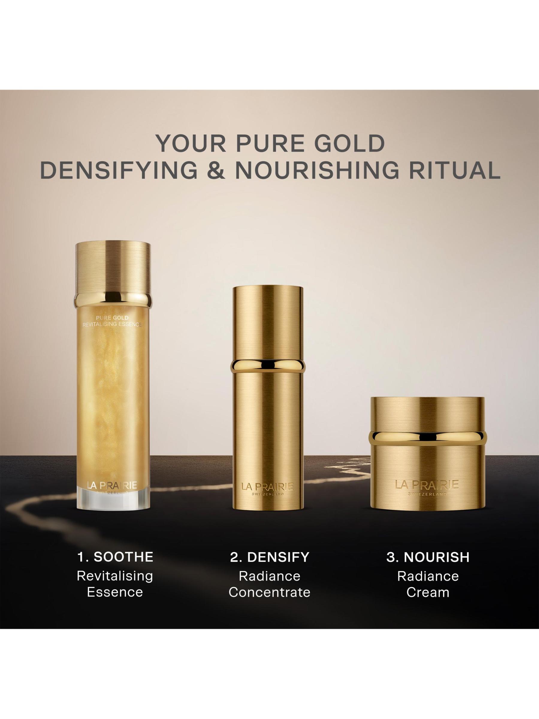 1. رج العبوة جيدًا قبل الاستخدام. 2. ضعيه صباحًا ومساءً بعد التنظيف والتنغيم. 3. اسكب كمية صغيرة في راحة اليد. ضعيه بلطف على الوجه والرقبة، مع تجنب منطقة العين. استمر بحركة تربيت لطيفة حتى يتم امتصاص المنتج بالكامل. 4. اتبعي العناية بالعيون ومصل الوجه والمرطب من مجموعة La Prairie Pure Gold.