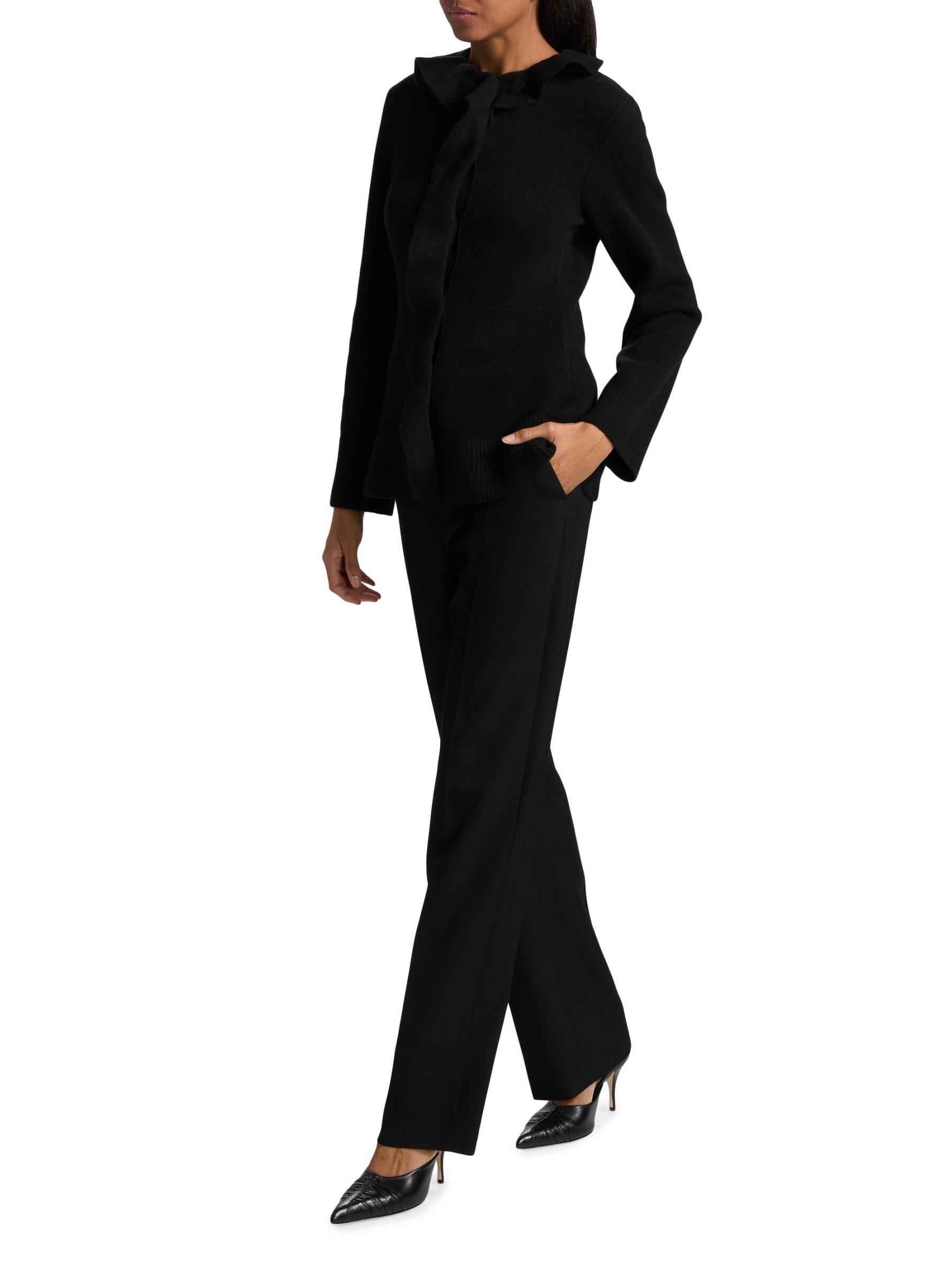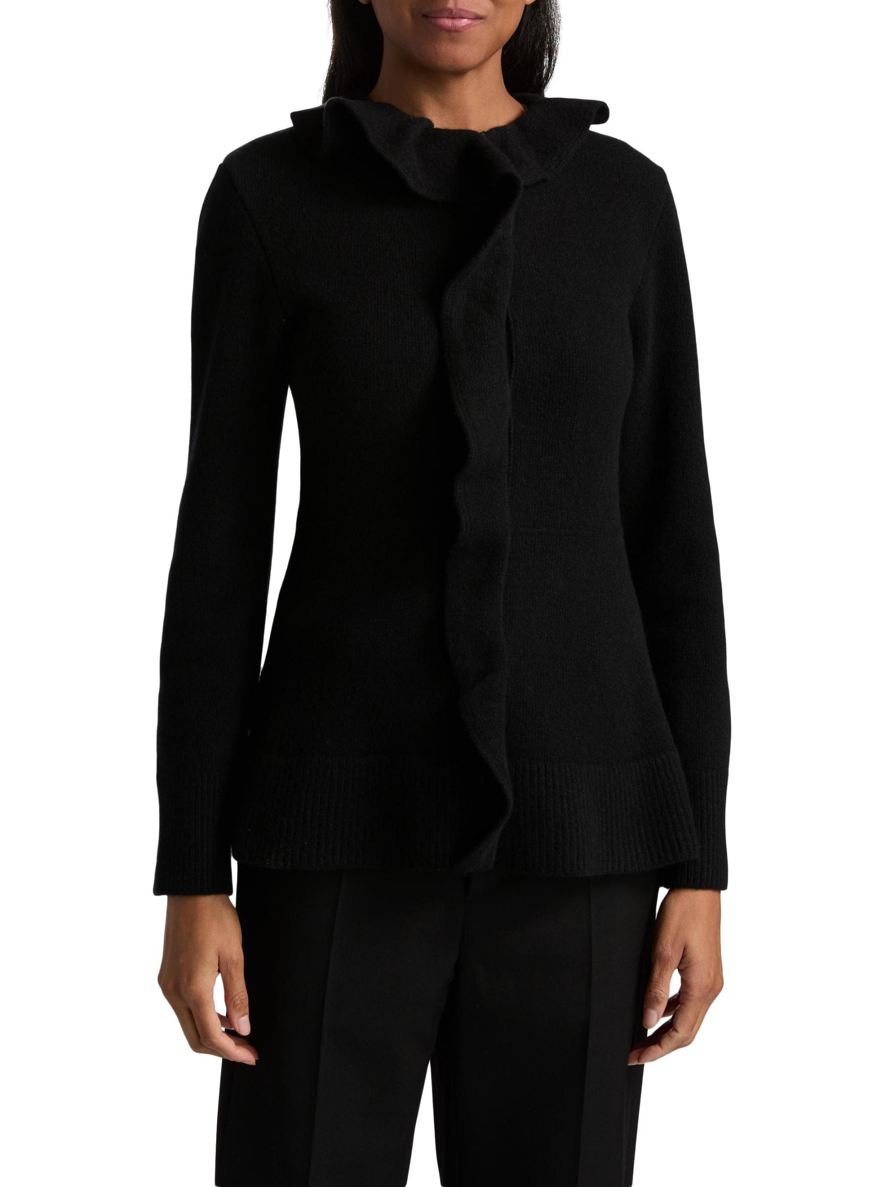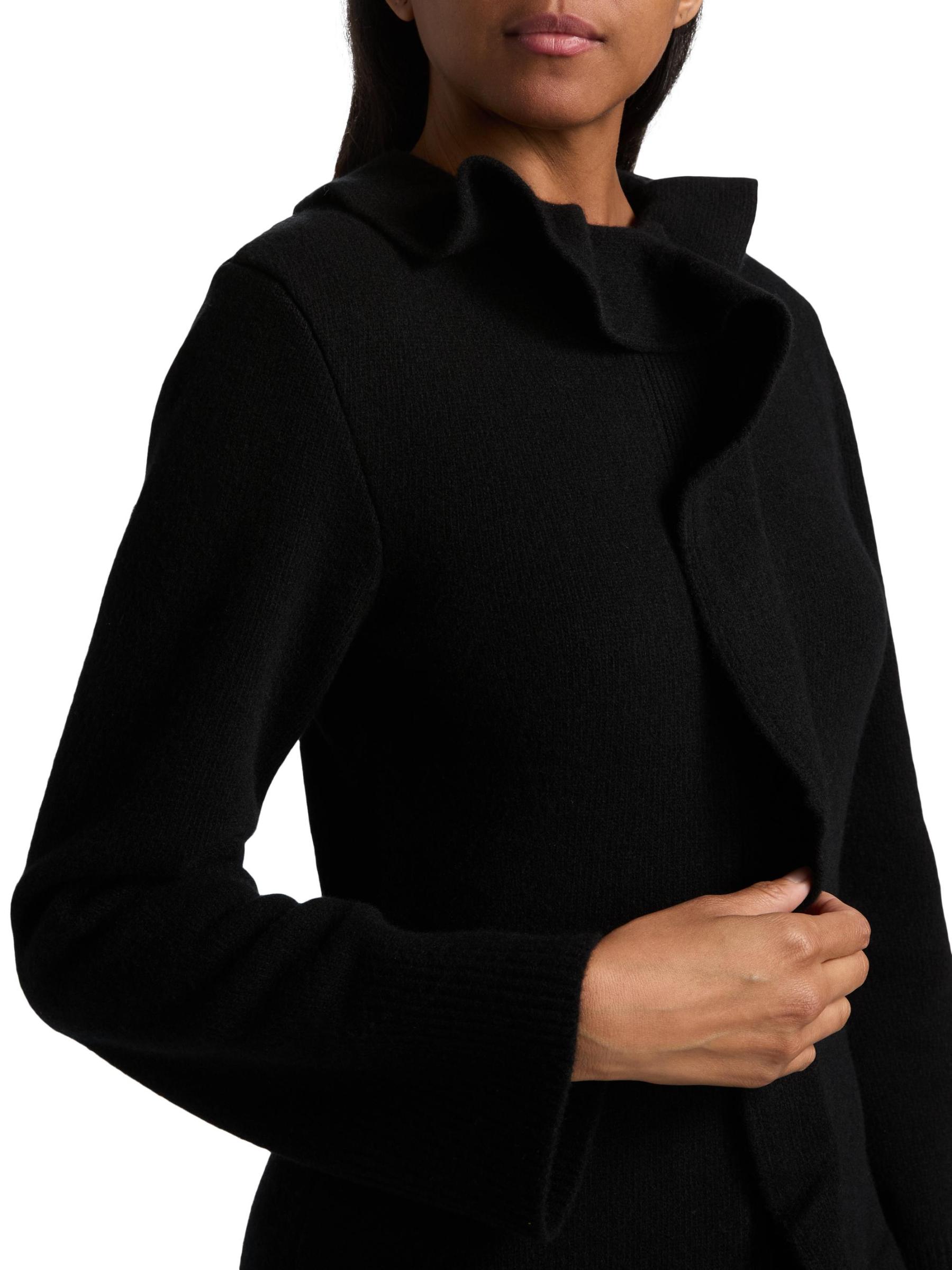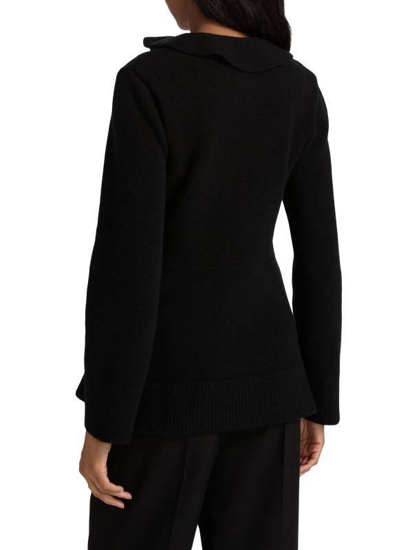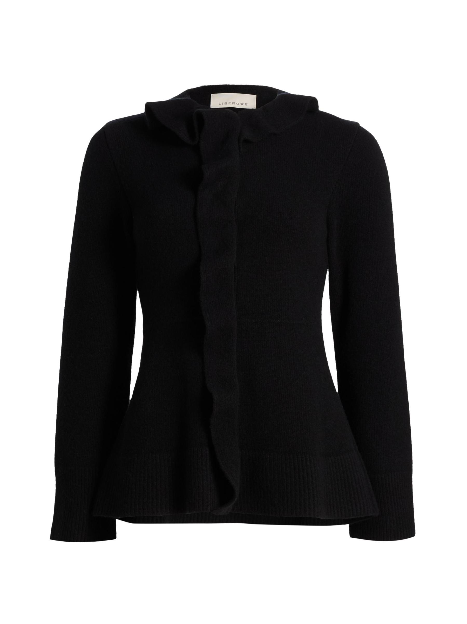 يتميز كارديجان كوين من Liberowe's Queen المصنوع من الصوف الفاخر في إيطاليا بإغلاق أمامي مزين بكشكشة متتالية وحواف محبوكة على شكل أضلاع.