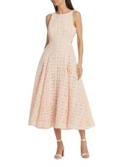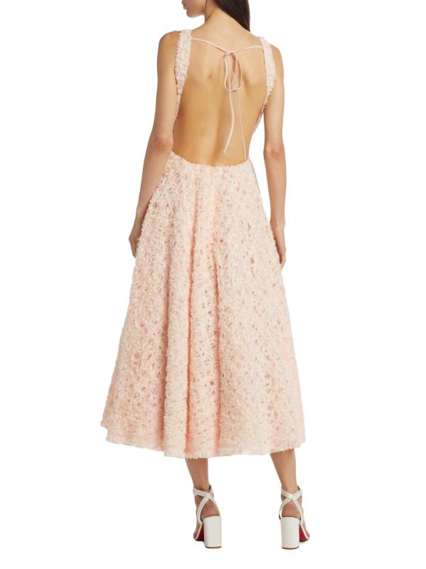 من مجموعة العناصر. يتميز فستان Quinette المتوسط بدون ظهر من Aje بملمس يشبه الأزهار بتصميم أنيق على شكل حرف A. تتميز هذه القطعة الرومانسية برباط خلفي وجيوب جانبية على الدرز.