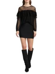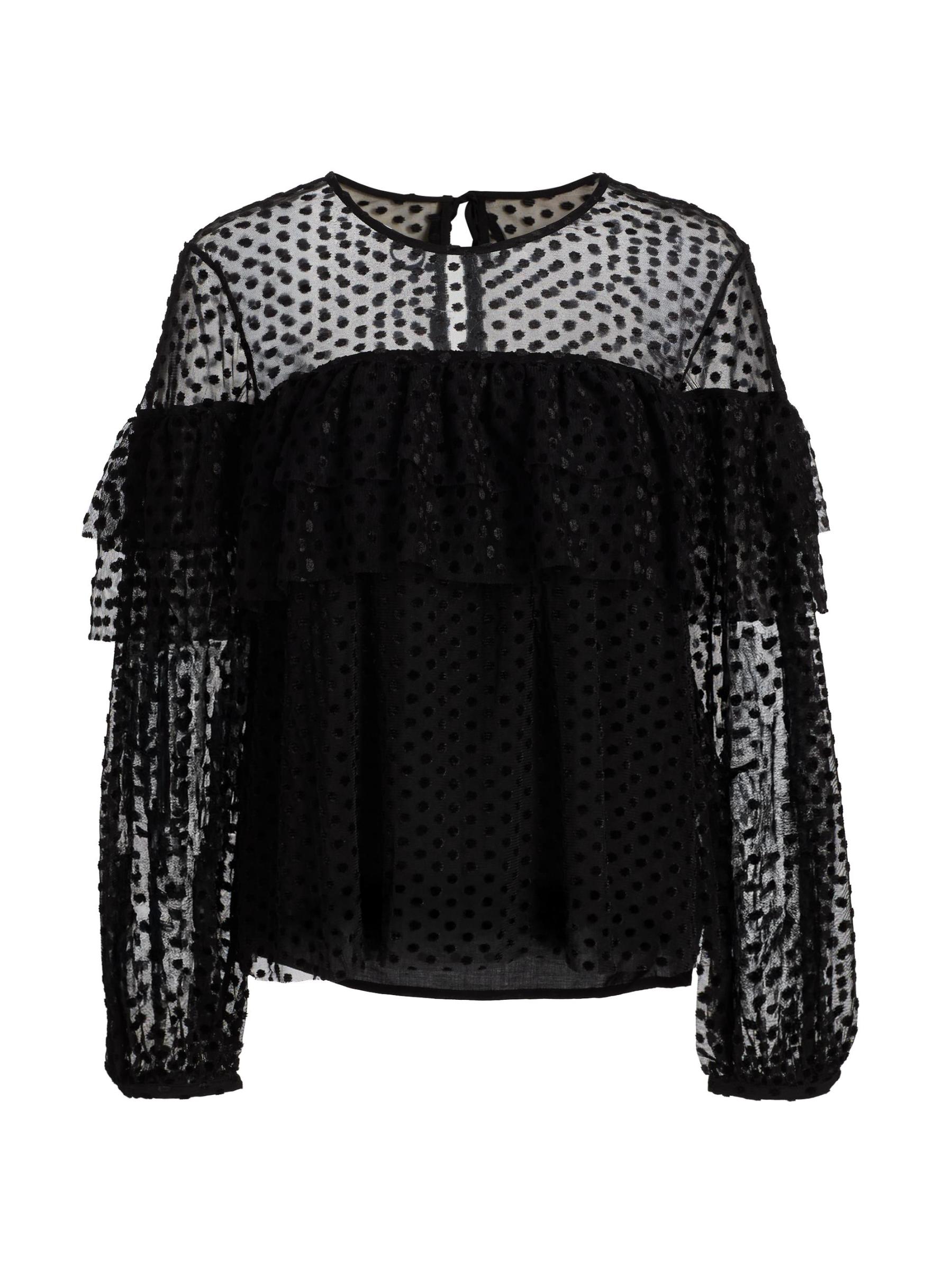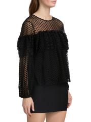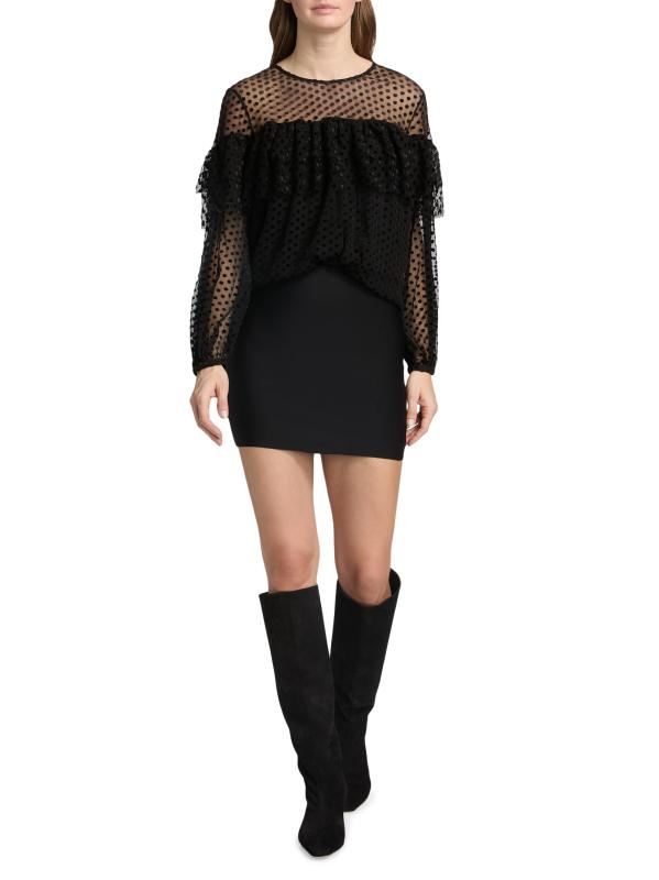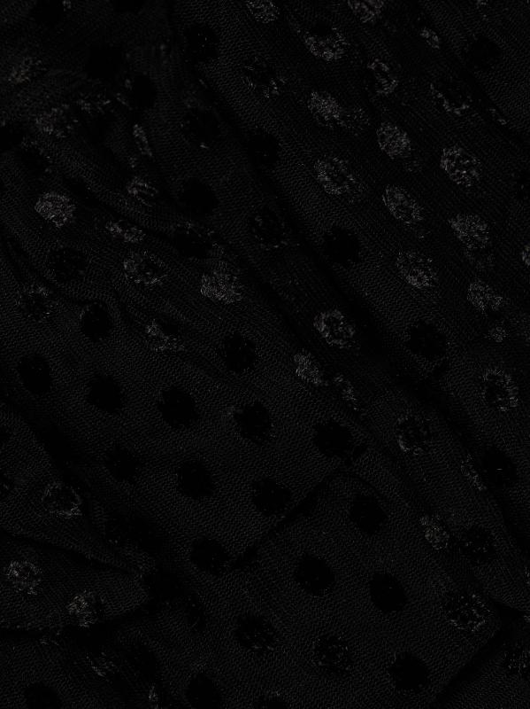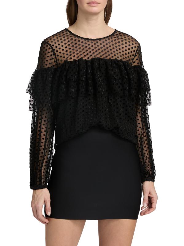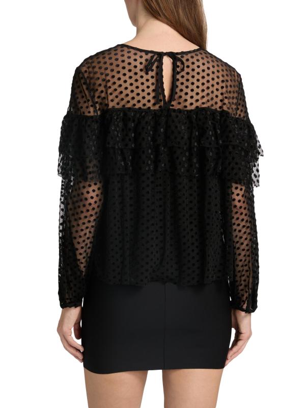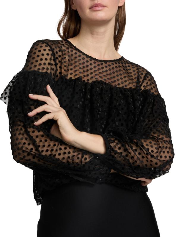 صُممت بلوزة راف من Ba&sh بتفاصيل ربطة يمكن ارتداؤها في الأمام أو الخلف، وهي مصنوعة من شبكة شفافة مع نقاط سويسرية كلاسيكية. الكشكشة المتدرجة المستمرة تخلق طبقة علوية متعددة الطبقات وتأثير حمالة الصدر.