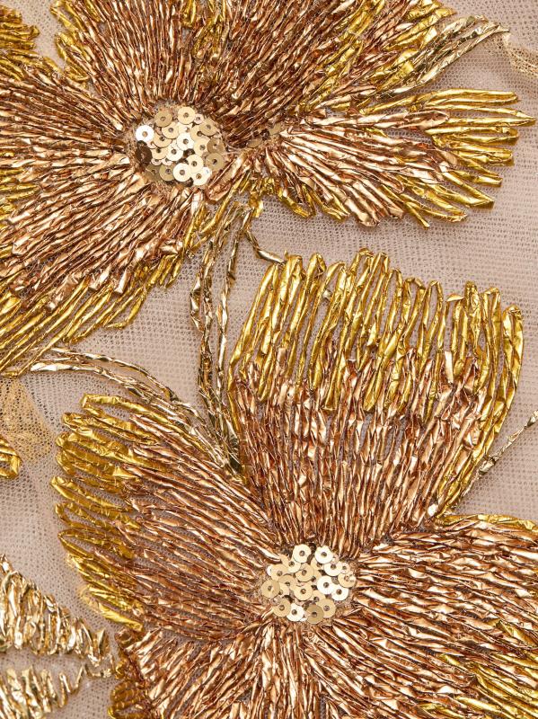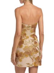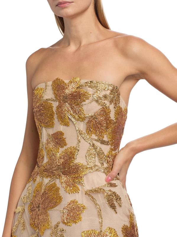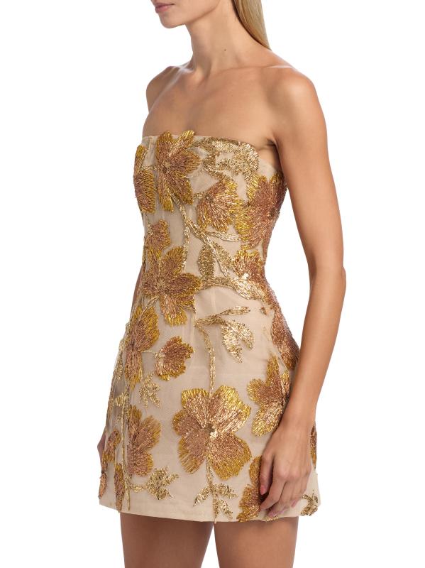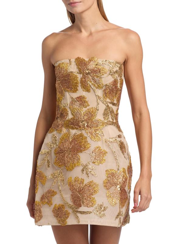 يُعزّز فستان الكوكتيل الصغير المنحوت من Monique Lhuillier التصميم بدون حمالات مع زخرفة زهرية مطرّزة بالرافيا على الجزء الخلفي من التل الخفيف.