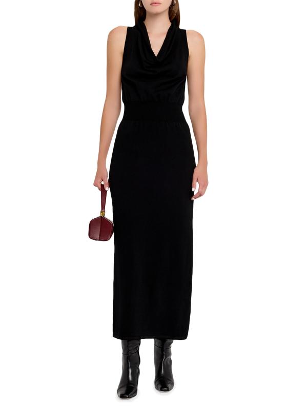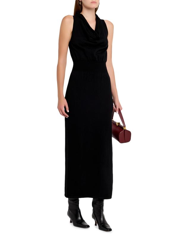 فستان رامونا الطويل بلا أكمام من SIMKHAI، المُحاك في شكل ضيّق، يعلوه تقويرة منسدلة على شكل قلنسوة.