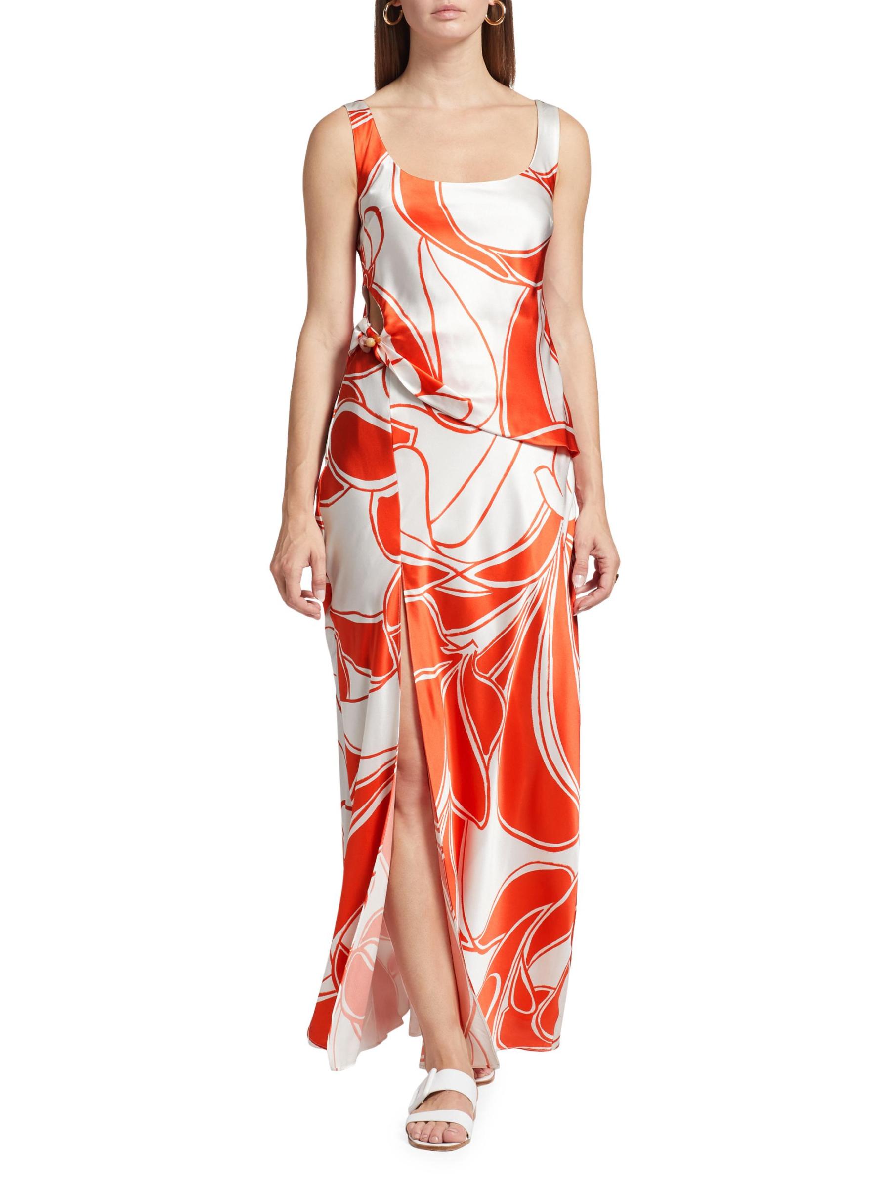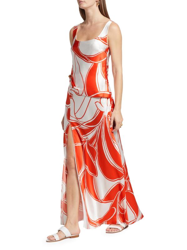 من مجموعة ريفليكسيون. مصنوع من الحرير الناعم بلمسة نهائية من الساتان، سيدي.» يُظهر فستان Ramona ذو القطع المتحيز تفاصيل ملتوية مع لمسات من الخرز. تتميز هذه القطعة، المطبوعة بزخارف نباتية كبيرة الحجم، بفتحة جانبية.سكوبنك بدون أكمام شق جانبي تسحب حرير بنسبة 100% تنظيف جاف مستوردة