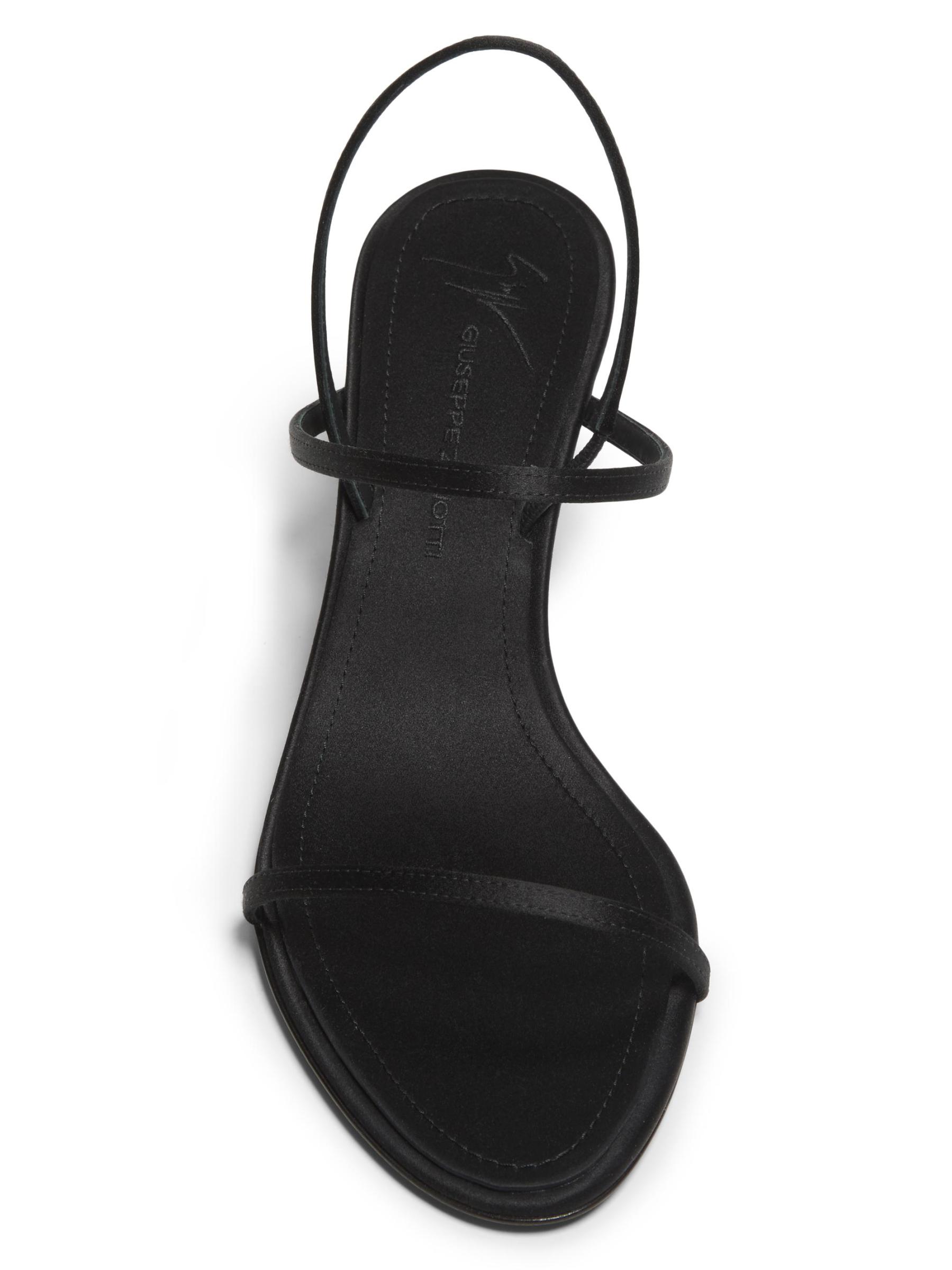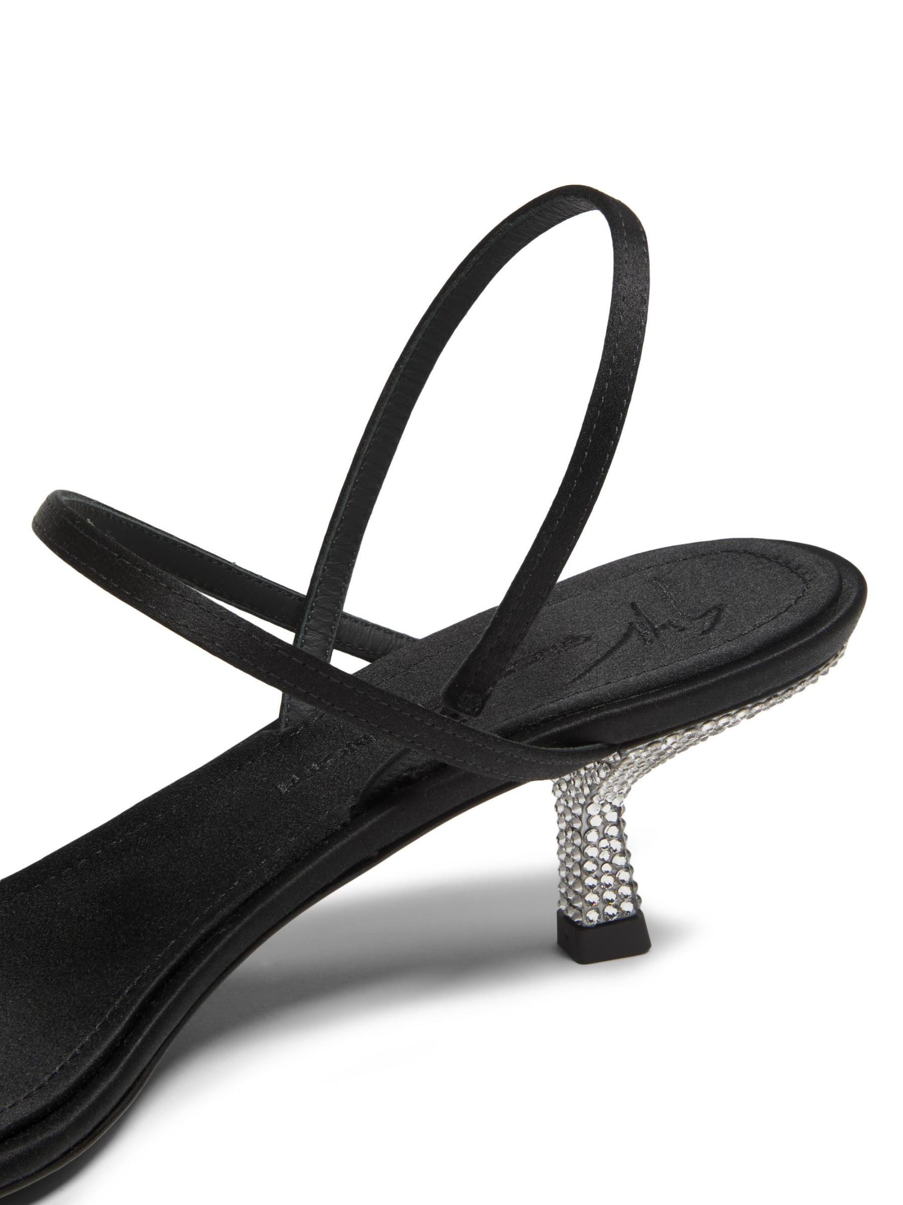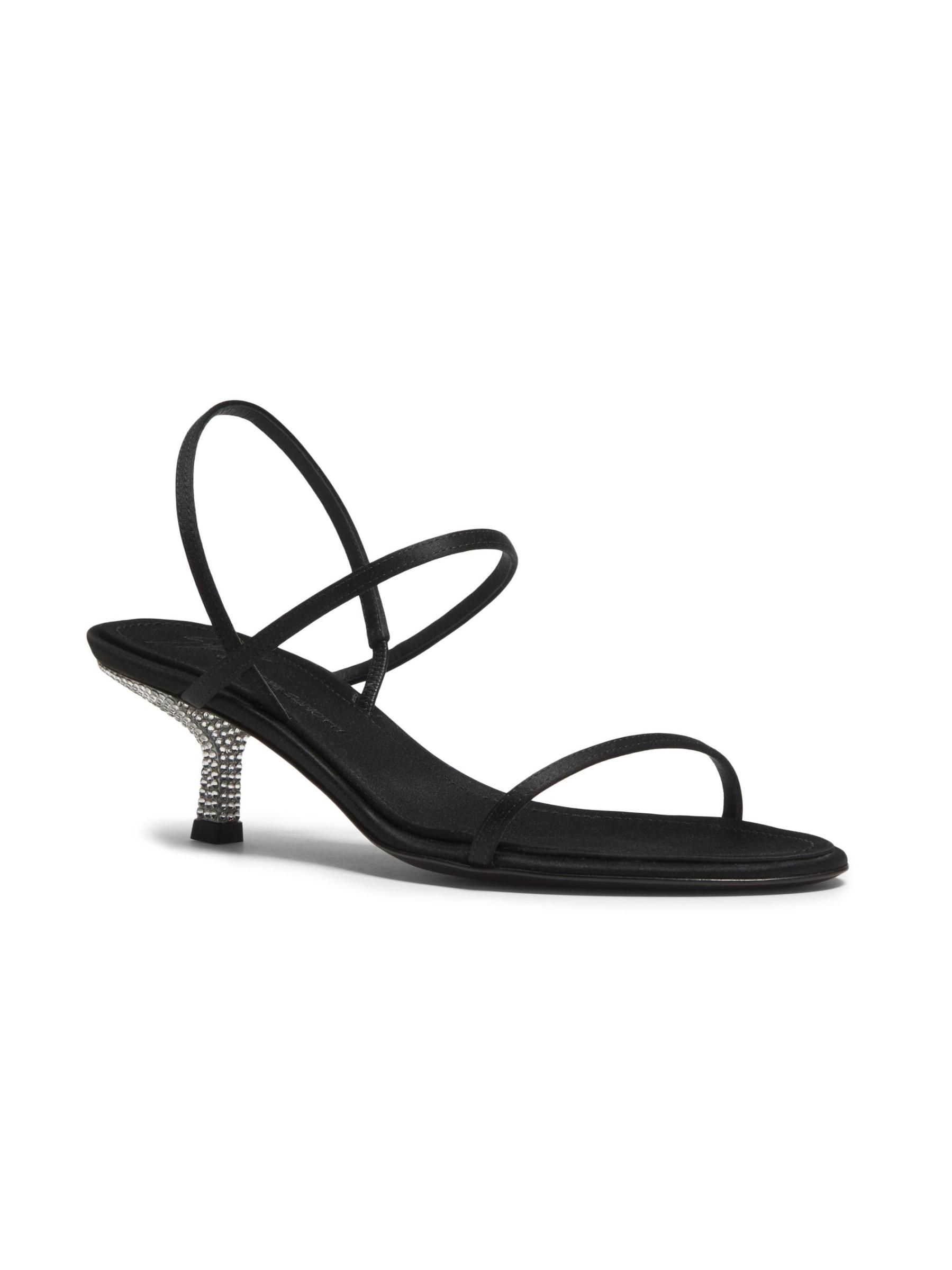 صُنع صندل Raso Nero من Giuseppe Zanotti من الحرير، ويتميز بكعب 50 مم مغطى بكريستال سواروفسكي.