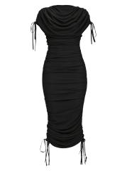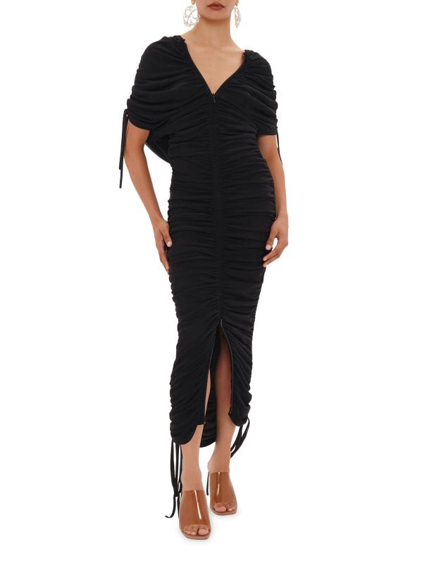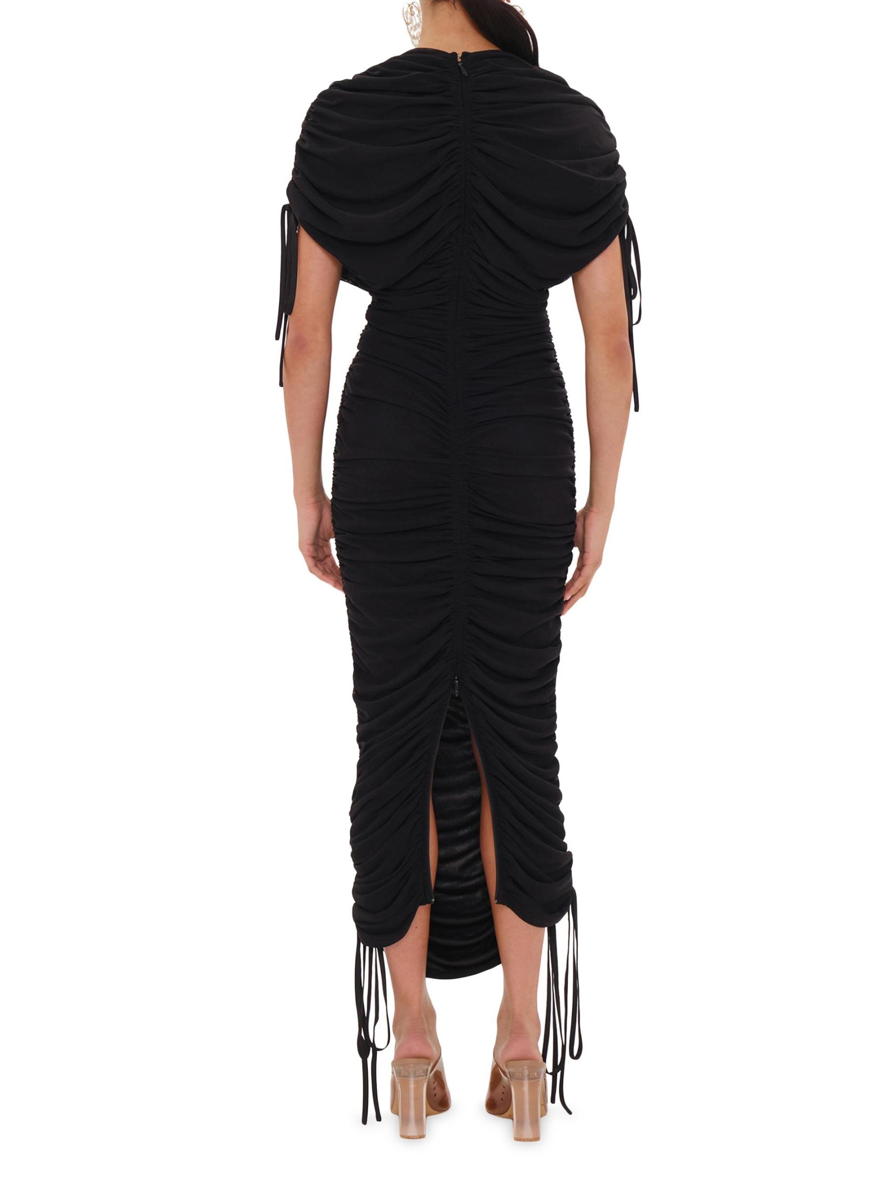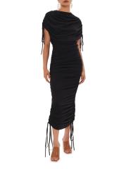 يتميّز فستان «راتو ميدي» من أندريا إياما، المصنوع من قماش شبكي مكشكش وخفيف الوزن، بصدّار مجمّع وأربطة جانبية عند الحافة والأكمام.