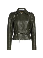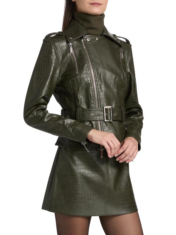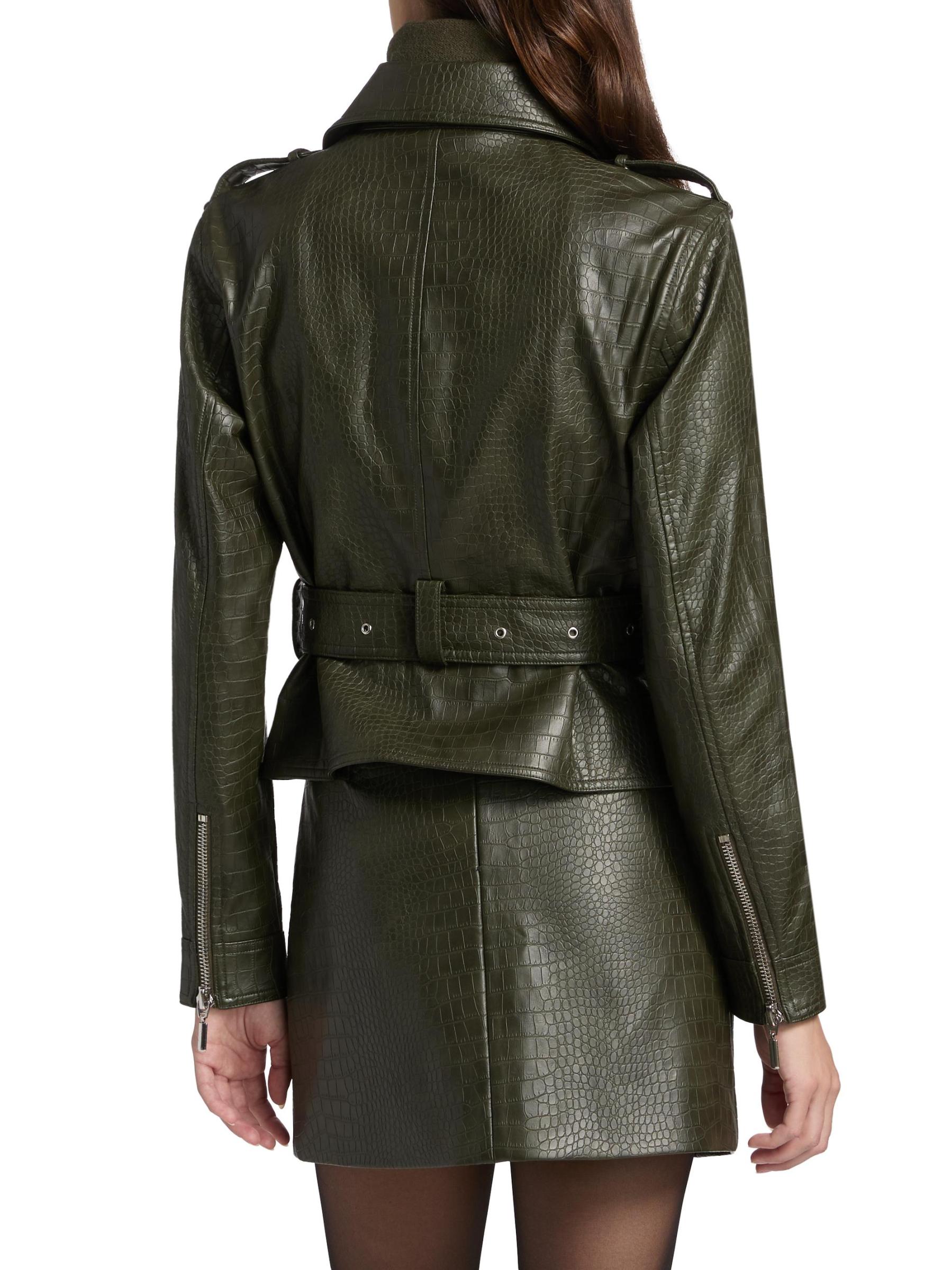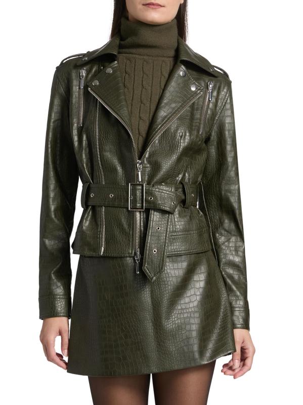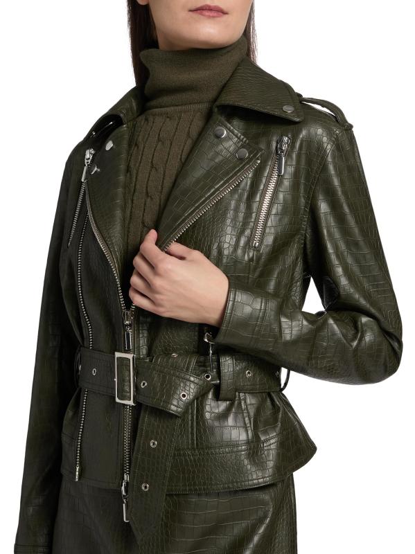 جاكيت ريد بايكر من Nonchalant Label مصنوع من الجلد الصناعي، ويتميز بتفاصيل الدراجات النارية الكلاسيكية مثل طية صدر السترة وحزام مشبك عند الخصر.