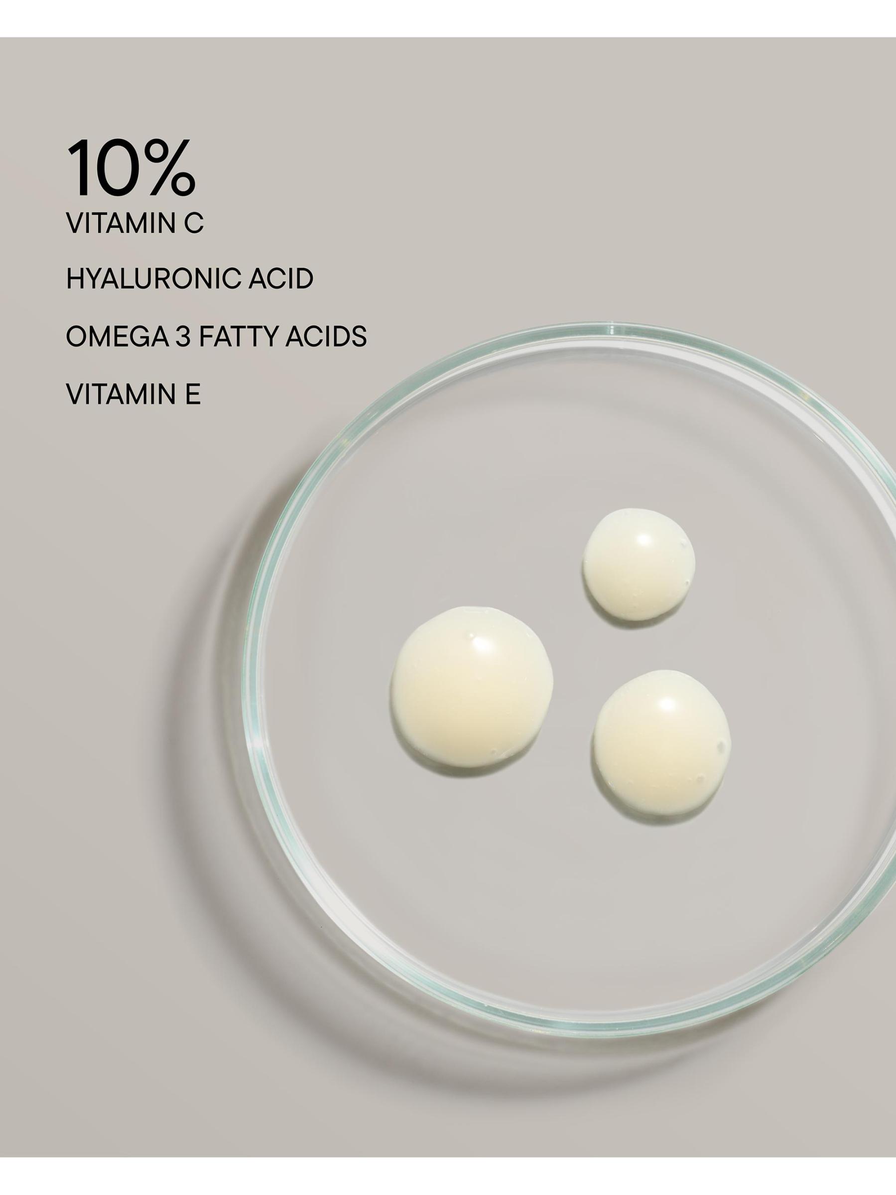 يحفز مشتق فيتامين C المستقر (10٪) الموجود في الصيغة تخليق الكولاجين وبالتالي يحافظ على مرونة الجلد. تبدو الخطوط الدقيقة والتجاعيد منخفضة، وتبدو البشرة أكثر تماسكًا وامتلاءً. بالإضافة إلى ذلك، يساعد فيتامين C على تقليل بقع الشيخوخة وفرط التصبغ وبالتالي تحسين بنية الجلد. كما يقلل تأثيره المضاد للأكسدة من الأضرار الناجمة عن عمليات الشيخوخة البيئية مثل الأشعة فوق البنفسجية وتحييد الجذور الحرة الضارة. يعمل حمض اللينولينك، وهو حمض أوميغا 3 الدهني، إلى جانب حمض الهيالورونيك منخفض الجزيئات، على ترطيب البشرة وحمايتها من الجفاف. يخترق حمض الهيالورونيك الجلد ويعزز امتصاص الرطوبة والربط على مستويات البشرة المختلفة، مما يحسن مرونة الجلد وثباته. جنبًا إلى جنب مع حمض اللينولينك، يتم تقوية الحاجز الواقي الطبيعي للبشرة، ويتم تفتيح فرط التصبغ وتقليله من خلال تأثيره في موازنة لون البشرة.