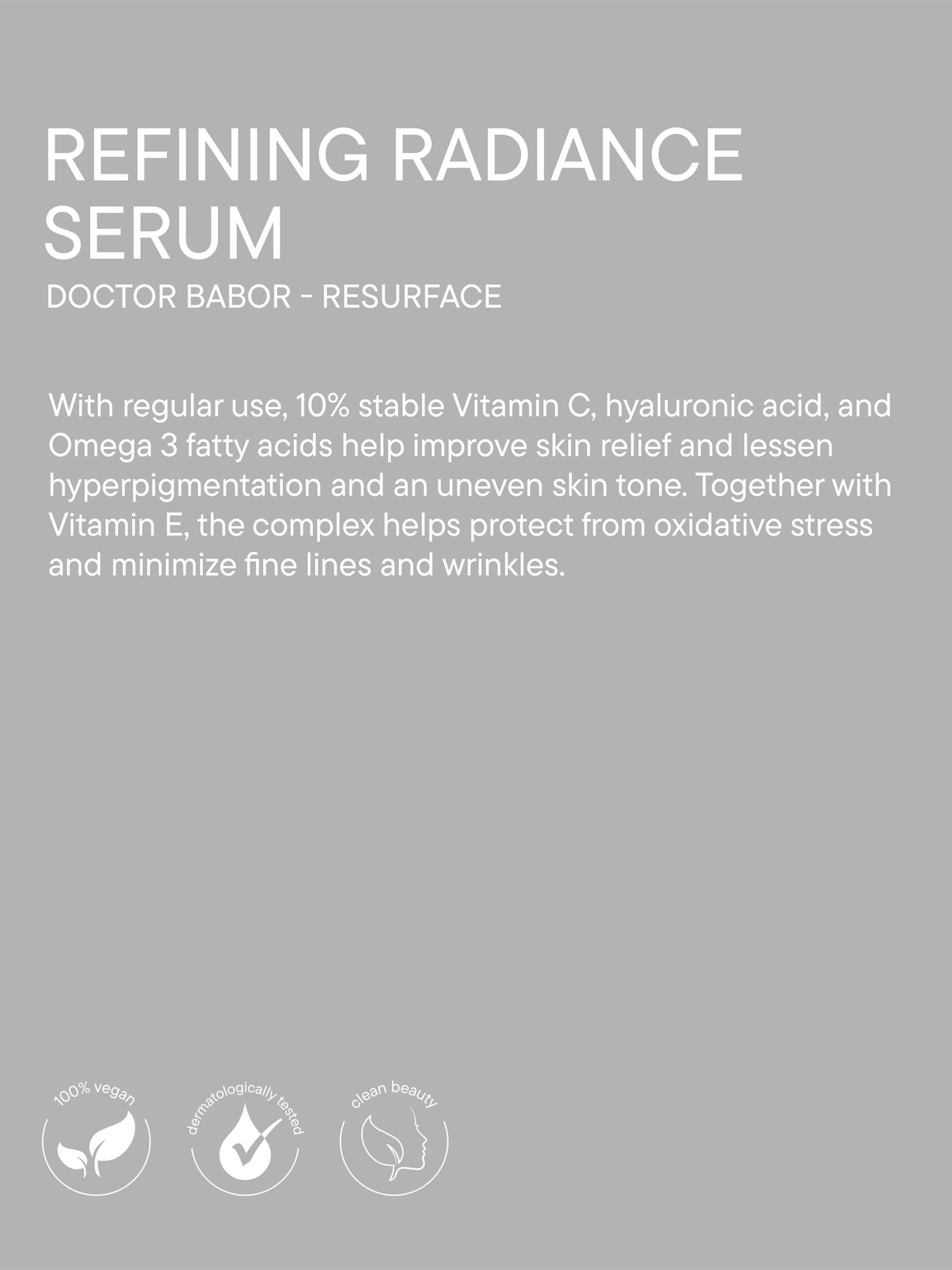 يتميز مصل Babor's Refining Radiance Serum بتركيز مضاد للأكسدة مع مركب نشط من فيتامين C واللينولينك وأحماض الهيالورونيك مما يقلل من ظهور بقع الشيخوخة، مما يجعل البشرة تبدو أكثر امتلاءً وتألق البشرة مرة أخرى. بالإضافة إلى ذلك، يتم ترطيب البشرة وحمايتها من التلف الذي تسببه الجذور الحرة. يساعد مصل Refining Radiance Serum، الذي يأتي خلفًا أقوى لسيروم Comfort Vitamin C، على تحسين ملمس البشرة وتقليل تلف الصبغات الموجودة عند استخدامه يوميًا. غني بمستخلص BIOGEN PLANT EXTRACT الحصري، الذي يُعد تتويجًا لأبحاث بابور، يتم تحفيز عمليات الجلد وبالتالي تعزيز رشاقة البشرة الشبابية. 1 أونصة مصنوعة في ألمانيا.