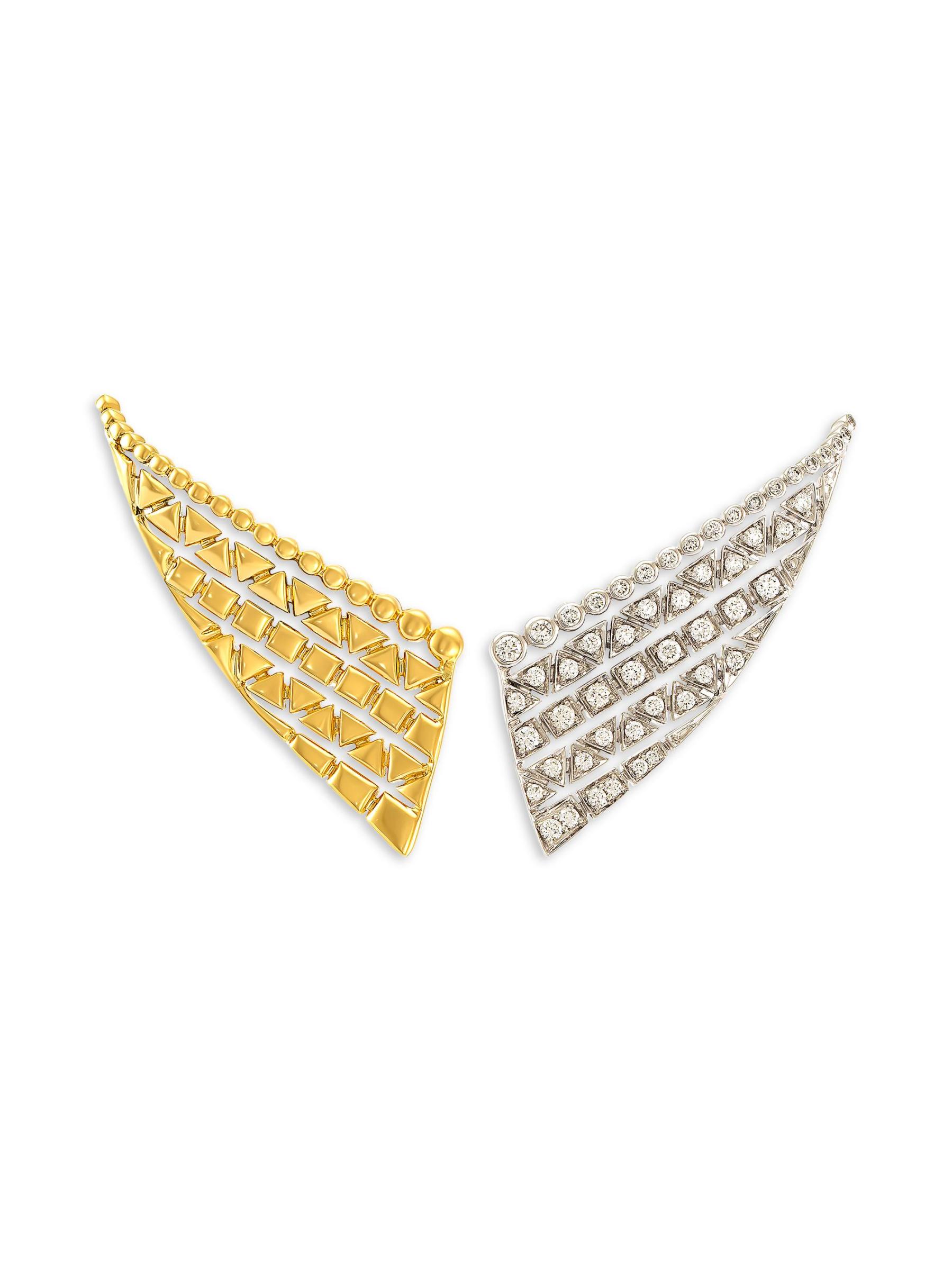 من مجموعة ريفليكسيون. أقراط Etho Maria المذهلة على شكل جناح تجمع بين الذهب الأصفر والأبيض عيار 18 قيراطًا. تم تصميم هذا الزوج بأسلوب مختلط ومتطابق، ويتميز بأشكال هندسية مرصعة بالألماس اللامع.