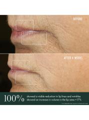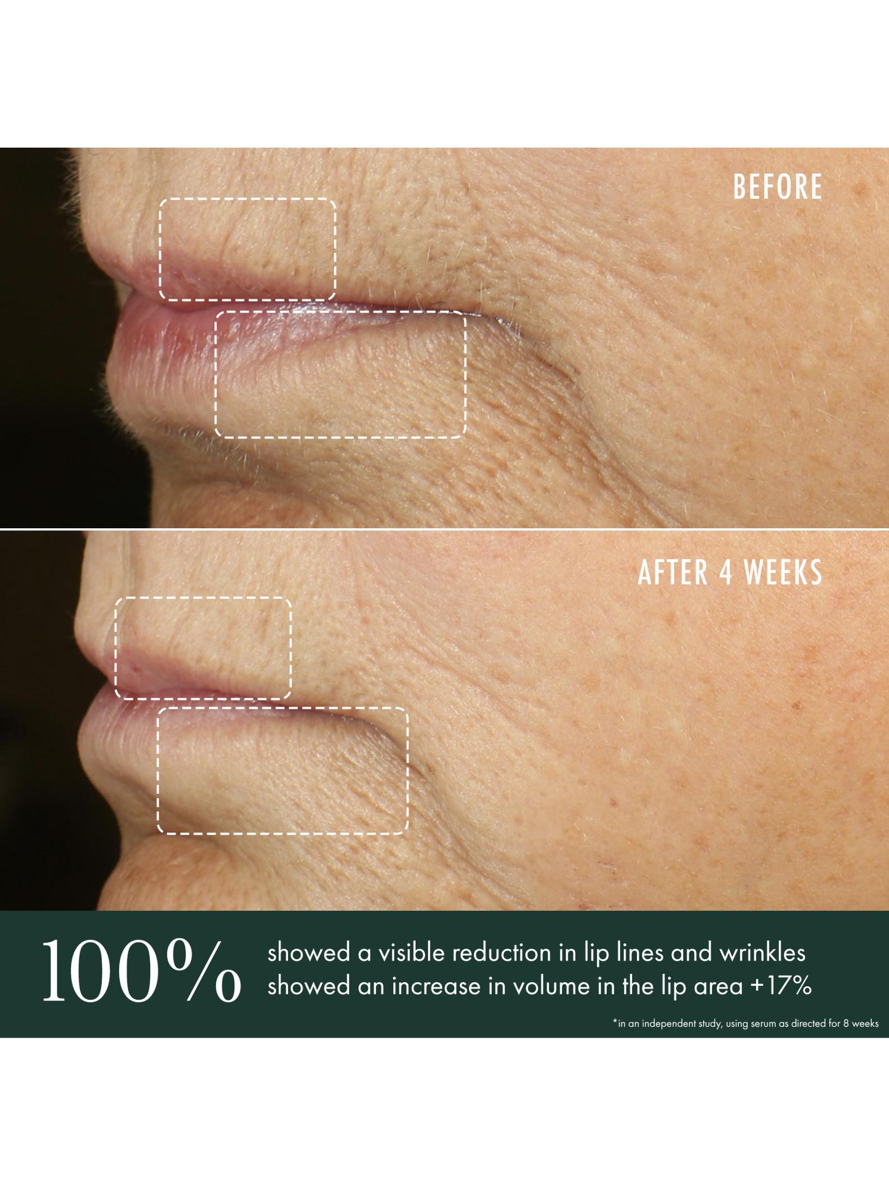 بعد 4 أسابيع، ثبت سريريًا قدرته على: √ تقليل الخطوط العمودية والتجاعيد حول منطقة الشفاه √ زيادة حجم منطقة الشفاه وامتلائها √ زيادة بنسبة 17٪ في حجم منطقة الشفاه أظهر 100٪ انخفاضًا ملحوظًا في الخطوط العمودية والتجاعيد أظهر 100٪ زيادة في الحجم في منطقة الشفاه بنسبة 17٪ توافق 100٪ على أن الجلد حول الشفاه يشعر بالترطيب والترطيب 97٪ يوافقون على أن الجلد حول الشفاه يشعر بالنعومة 94٪ يوافقون على أن منطقة الشفاه أكثر نعومة 91٪ يوافقون على تحسين ملمس البشرة ولونها حول منطقة الشفاه تم اختبارها مع المستهلكين باستخدام سيروم بالإضافة إلى أحمر الشفاه. يتفق أعضاء اللجنة على أن المصل يمنع بشكل فعال نزيف أحمر الشفاه، لذلك لم ينتقل أحمر الشفاه إلى خطوط الشفاه