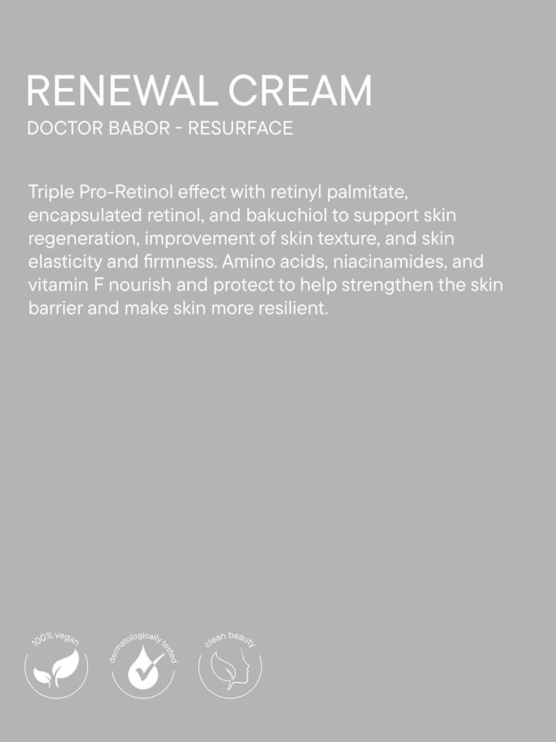 يدعم كريم Babor's Resurface Renewal Cream عمليات تجديد البشرة بمركب Triple Pro-Retinol القوي بنسبة 4.2% ويحسن مرونة البشرة وثباتها. توفر الأحماض الأمينية القيمة والنياسيناميد وفيتامين F رعاية مكثفة للبشرة وتقوية حاجز الحماية الطبيعي للبشرة. تبدو البشرة أكثر نعومة وتجانسًا بشكل واضح. غني بمستخلص BIOGEN PLANT EXTRACT الحصري، الذي يُعد تتويجًا لأبحاث بابور، يتم تحفيز عمليات الجلد وبالتالي تعزيز رشاقة البشرة الشبابية. 1.69 أونصة. صُنع في ألمانيا.