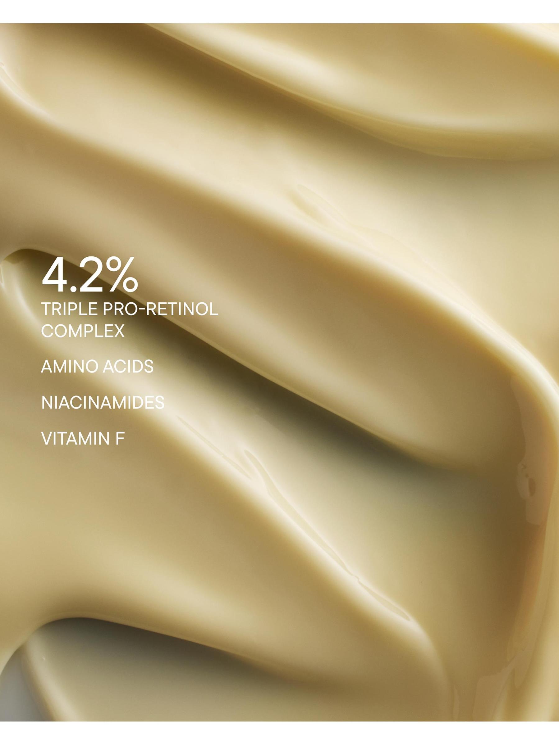 مركب Triple Pro-Retinol المكون من ريتينيل بالميتات والريتينول المغلف والباكوشيول ينشط عمليات تجديد الجلد ويتميز بخصائصه القوية المضادة للأكسدة: يعتبر ريتينيل بالميتات شكلاً ثابتًا من فيتامين أ وله خصائص مضادة للأكسدة تساعد على حماية البشرة من العوامل البيئية الضارة مثل الأشعة فوق البنفسجية والتلوث. يساعد هذا التأثير المضاد للأكسدة على تقليل الضرر التأكسدي الذي يمكن أن يؤدي إلى الشيخوخة المبكرة. يساعد ريتينيل بالميتات أيضًا على تقليل بقع التصبغ من خلال دعم تكسير الميلانين وتحسين توزيع الخلايا الصبغية في الجلد. يُعرف باكوشيول، وهو بروريتينول نباتي مستخرج من بذور نبات بابشي الهندي (Psoralea Corylifolia)، بخصائصه المضادة للأكسدة ويكمل المركب الثلاثي النشط لتجديد البشرة. كمكون طبيعي لمكافحة الشيخوخة، يعتبر الباكوشيول بديلاً لطيفًا للريتينول، حيث يوفر كلاً من الفعالية العالية والتحمل الجيد.
