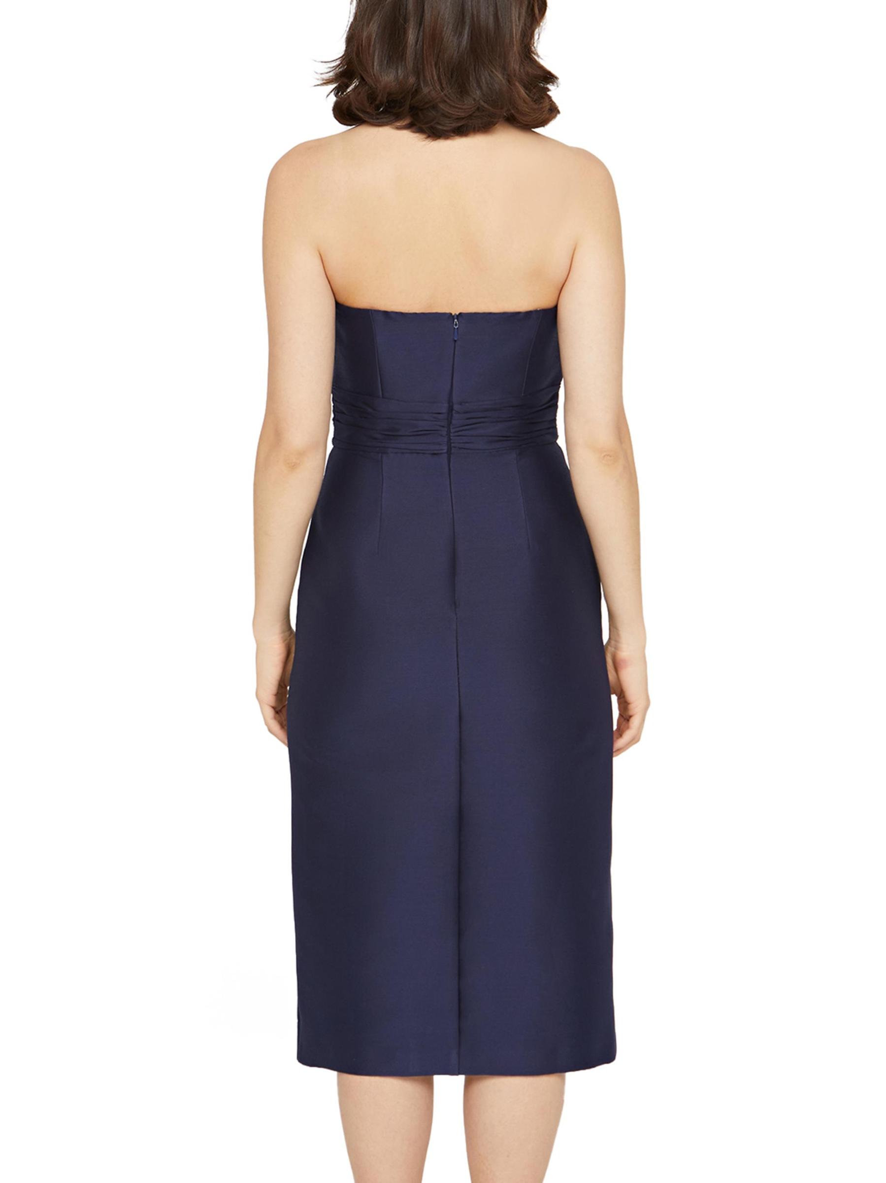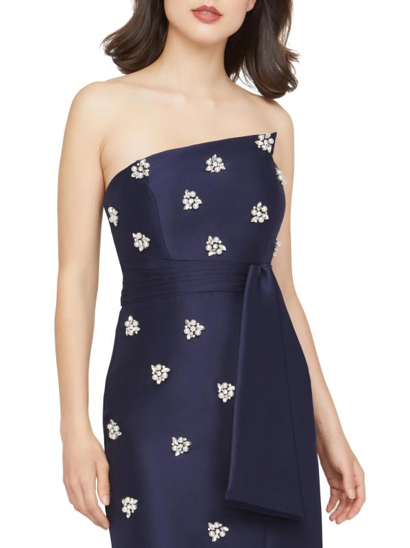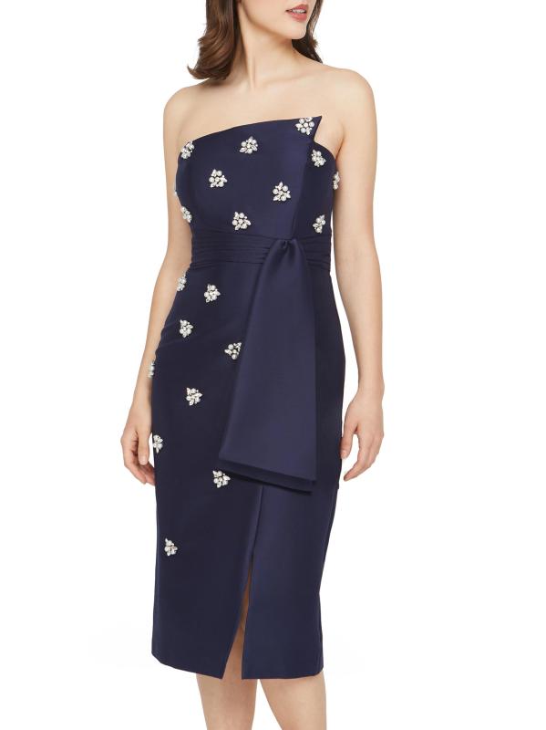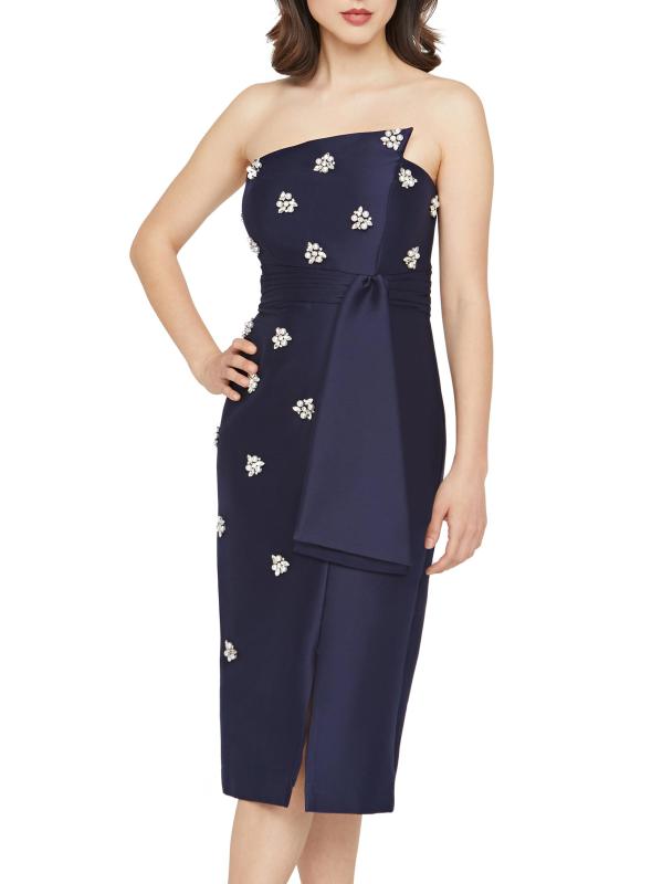 يتميّز فستان «ريا» المزركش لحفل الكوكتيل المصنوع من الساتان المرن من Kay Unger بخرز الأزهار العنقودي المتناثر على الصدّار غير المتماثل ويتلاشى في التنورة. تتضمن هذه القطعة خصرًا مزركشًا وشقًا أماميًا وصورة ظلية بدون حمالات.