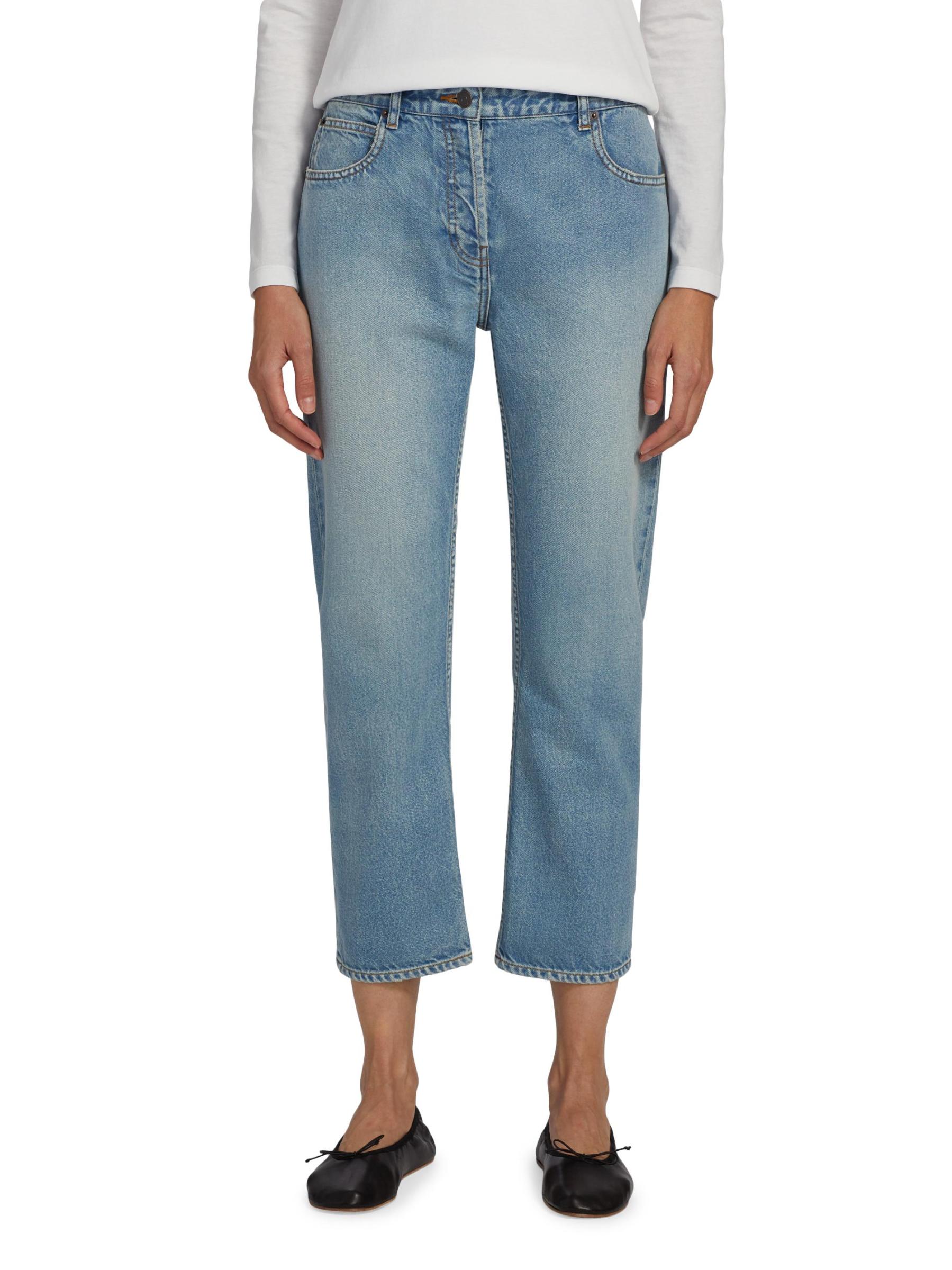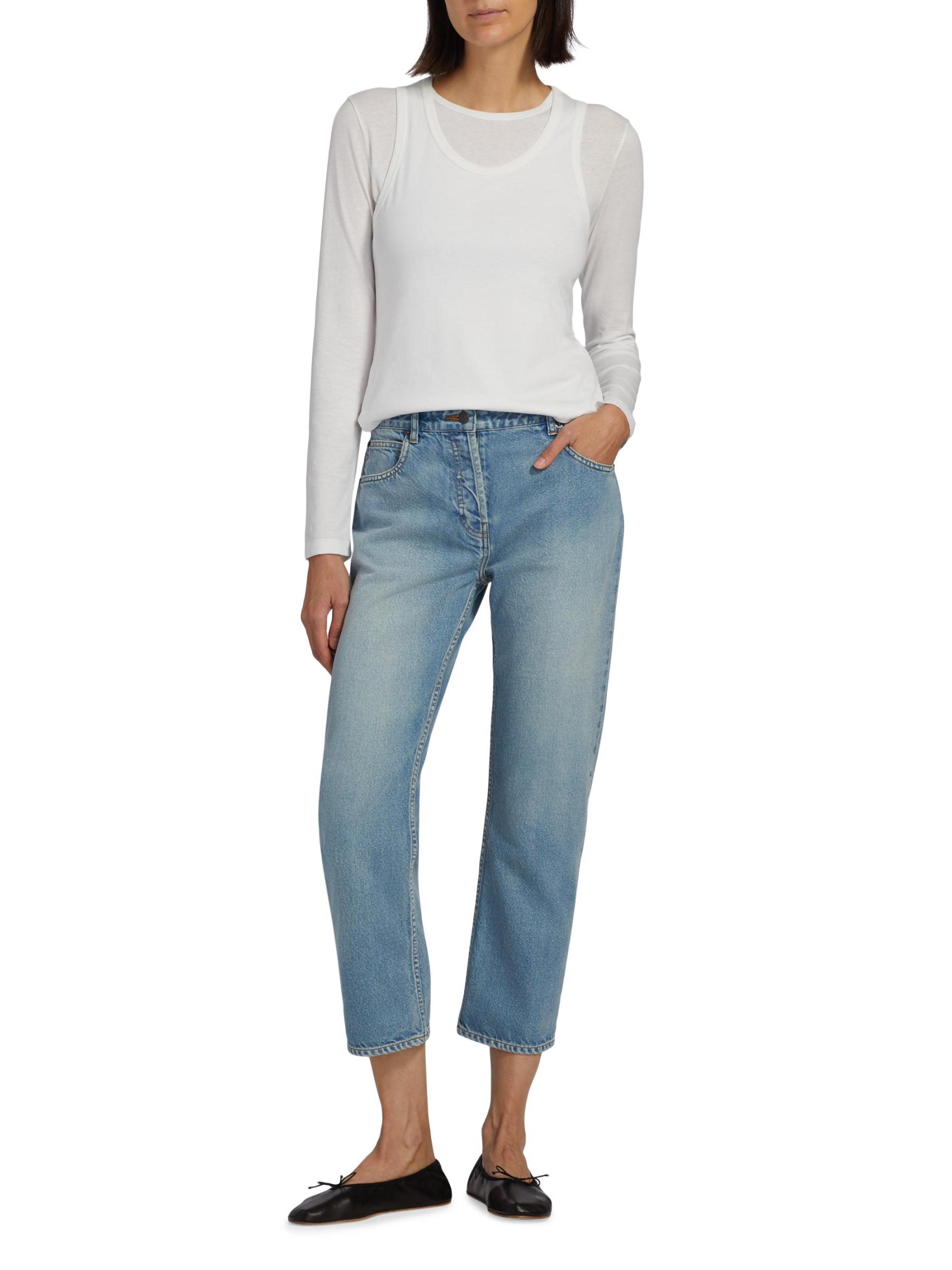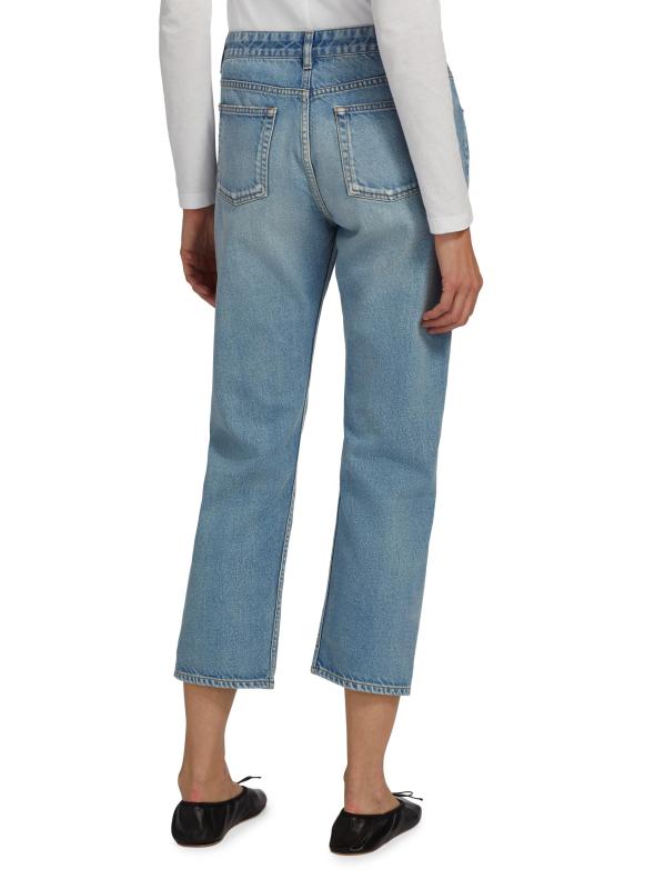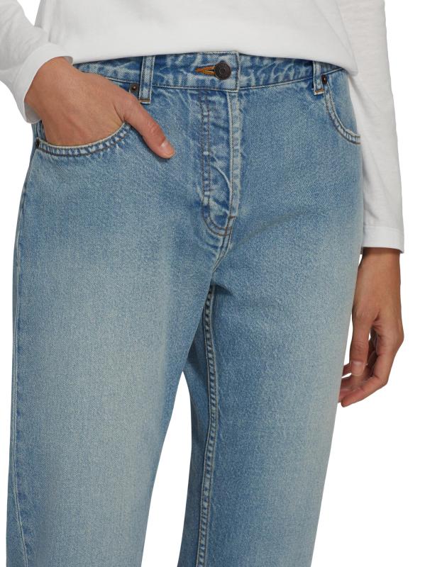 يتميّز بنطال «رياكو» متوسط الارتفاع من «ذا رو»، المصنوع من قماش الدنيم القطني الباهت بلطف في اليابان، بتصميم ضيق الساق. يشتمل هذا الزوج ذو الخمسة جيوب على خياطة علوية متباينة وشعيرات ورخامية لإطلالة نابضة بالحياة.