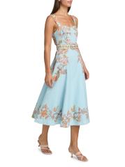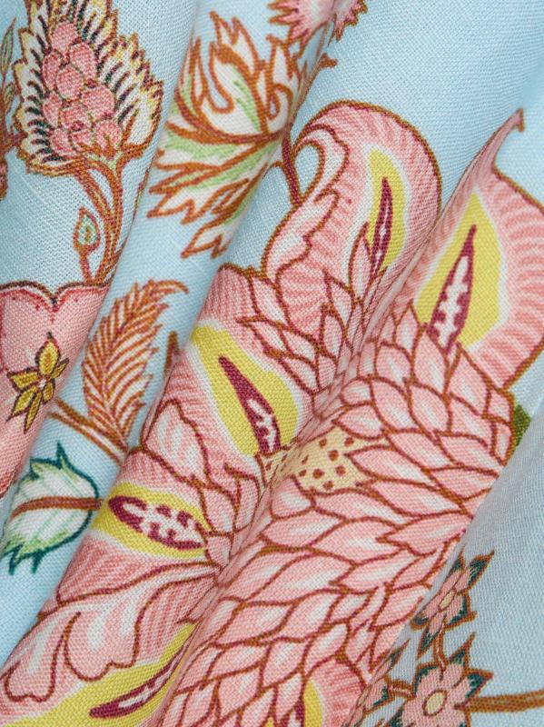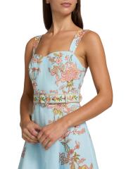 Nandita الكلاسيكي المتوسط بمزيج القطن والكتان الخفيف بزخارف نباتية ساحرة. تتميّز هذه القطعة، المُصمّمة بتقويرة على شكل قلب، بأحزمة ثابتة وحزام متناسق وسحّاب مخفي.