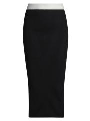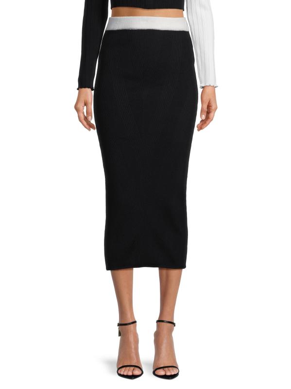 تتميّز تنورة Victor Glemaud المتوسطة هذه بتصميم ضيّق مصنوع من صوف الميرينو المحبوك على شكل أضلاع شيفرون. ويكمل الخصر المربوط بالألوان المظهر.