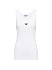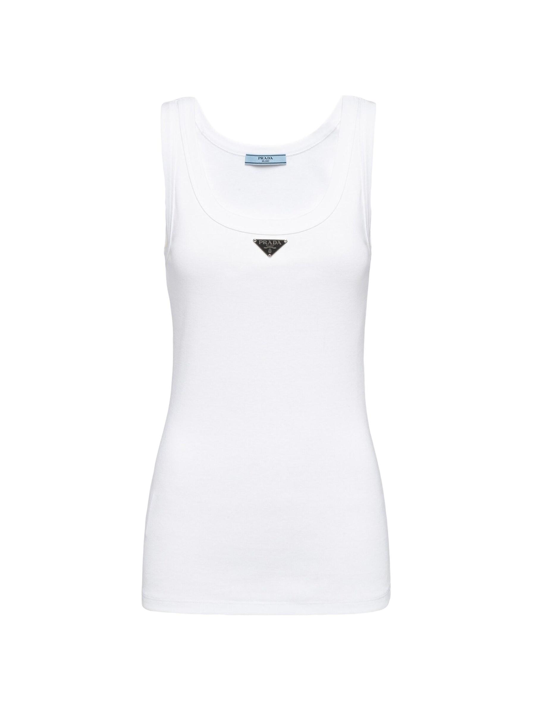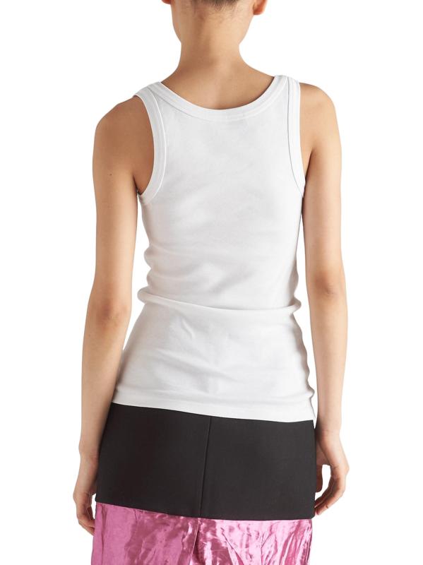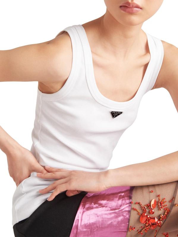 تكتسب الملابس البراغماتية أهمية وقيمة جديدة. تم تحويل هذا القميص بدون أكمام المصمم على شكل ملابس رجالية والذي تم تقديمه خلال عرض أزياء FW22 بلمسة أنثوية. تجسد ملابس برادا الأساسية التي تتميز بالصورة الظلية الضيقة رفاهية البساطة. يبرز شعار المثلث في الأعلى.