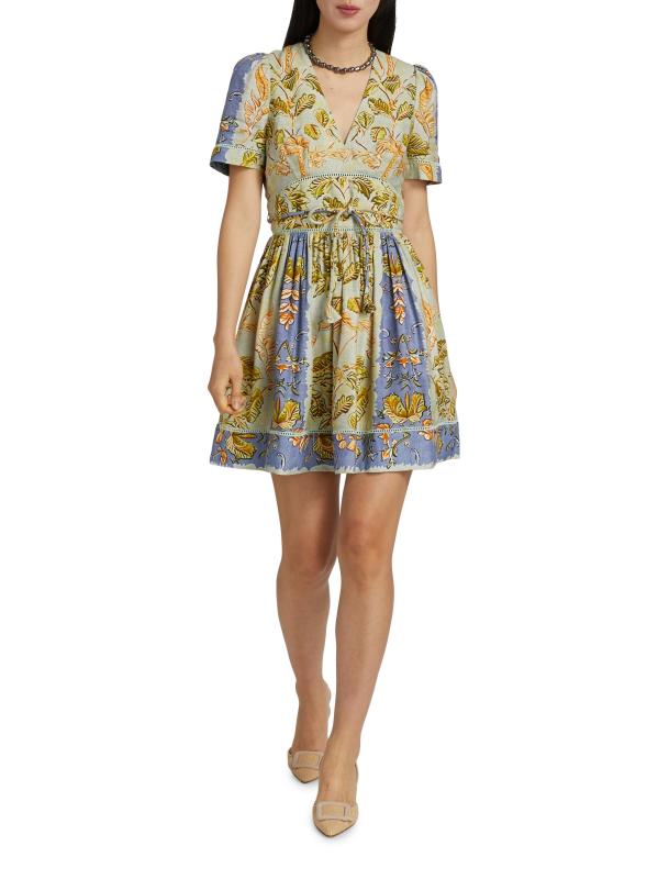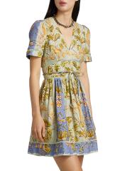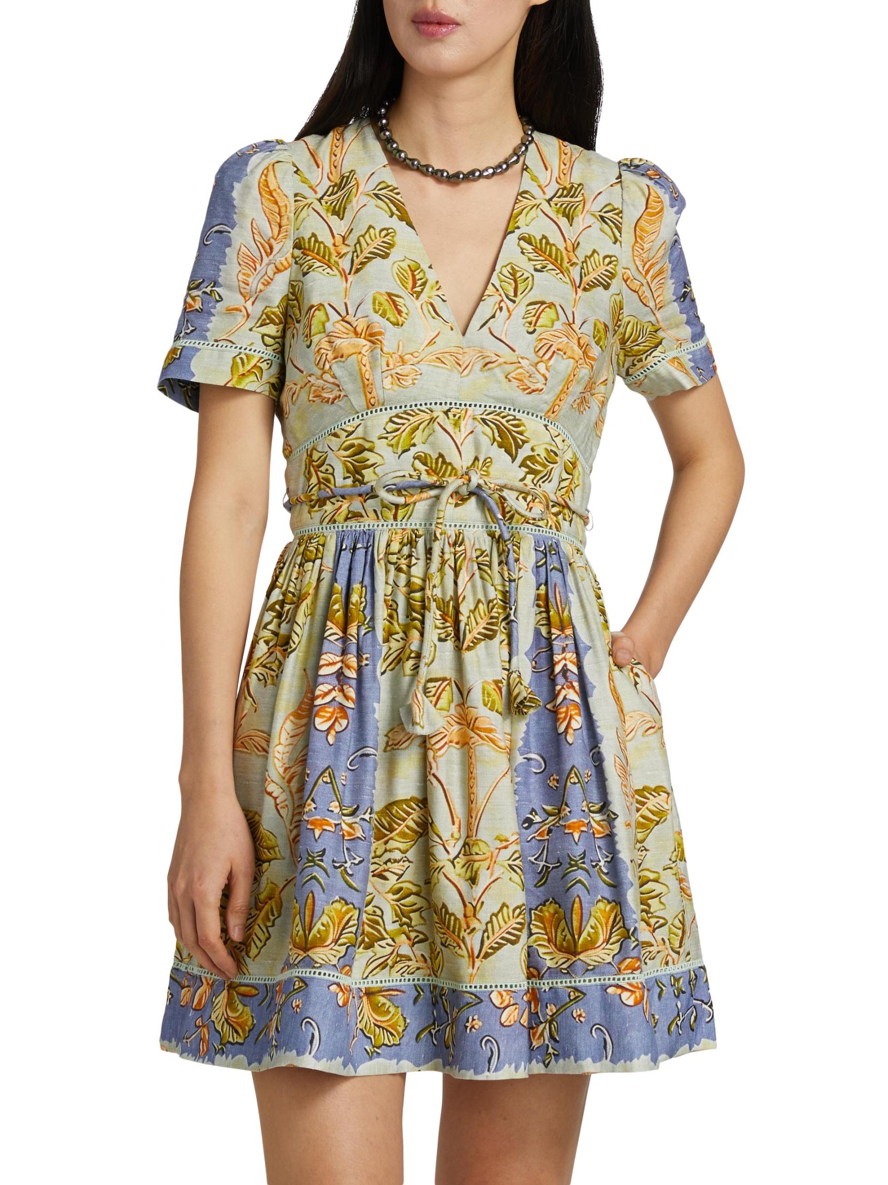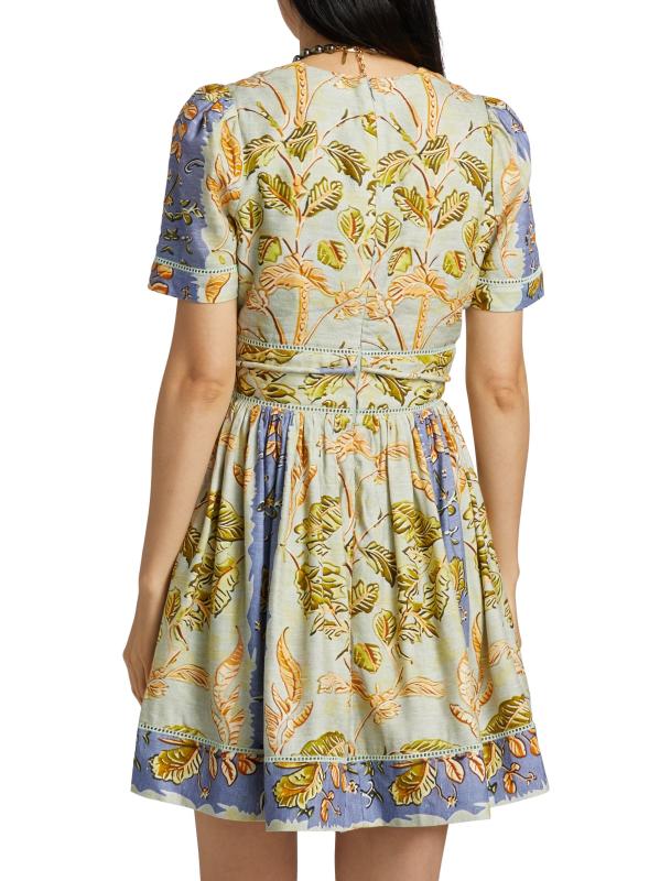 صُنع هذا الفستان القصير من Roan Fit and Flare من Hunter Bell من مزيج الكتان الفاخر، ويتميز بطبعة أوراق الشجر النابضة بالحياة ورقبة على شكل حرف V وربطة على الخصر.