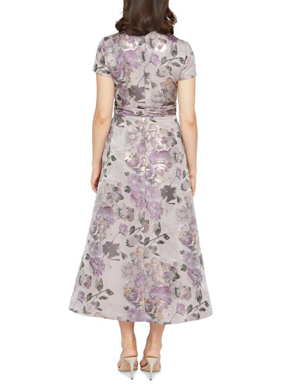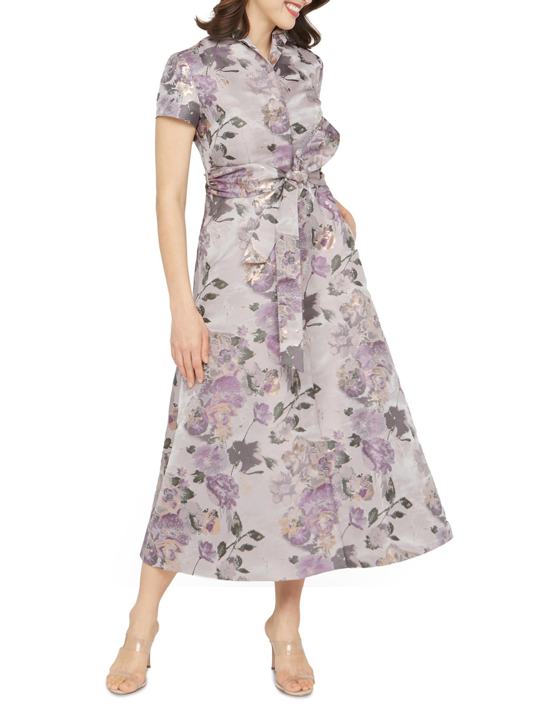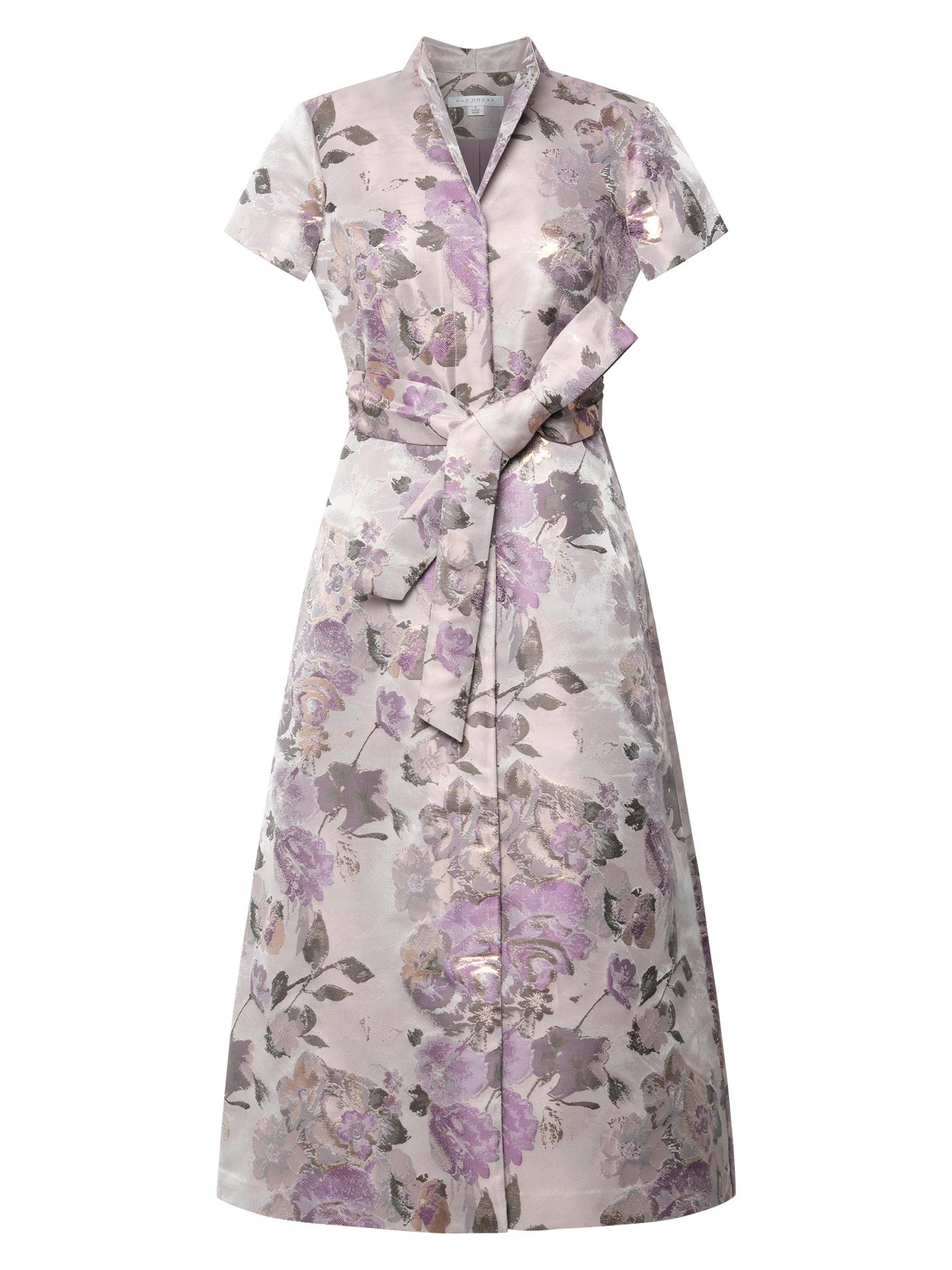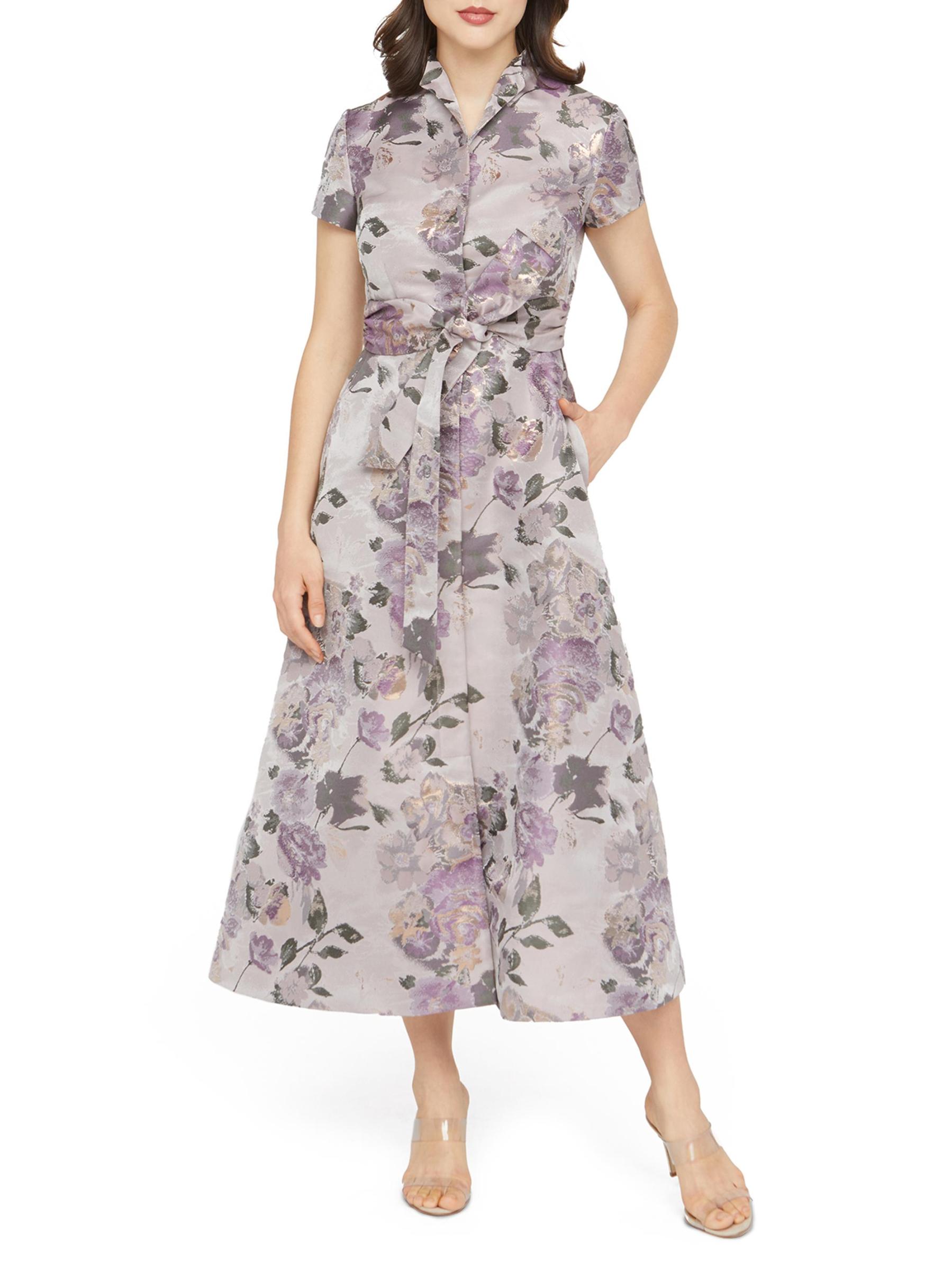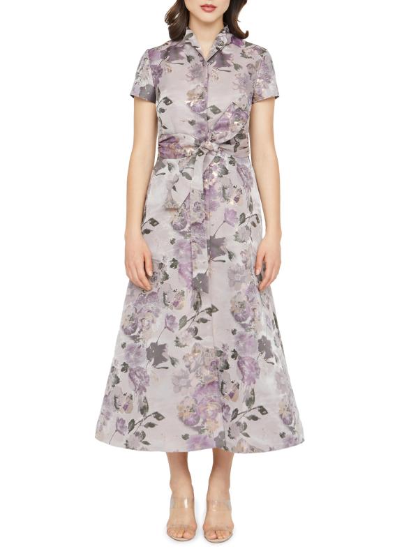 يُبرز فستان روبن بطول الشاي من كاي أونجر، المصنوع من قماش التفتا الخفيف مع لمعان معدني، زخارف جاكار زهرية رومانسية. تتميز هذه القطعة بياقة على شكل حرف V وفتحة مخفية وجيوب على درزات.
