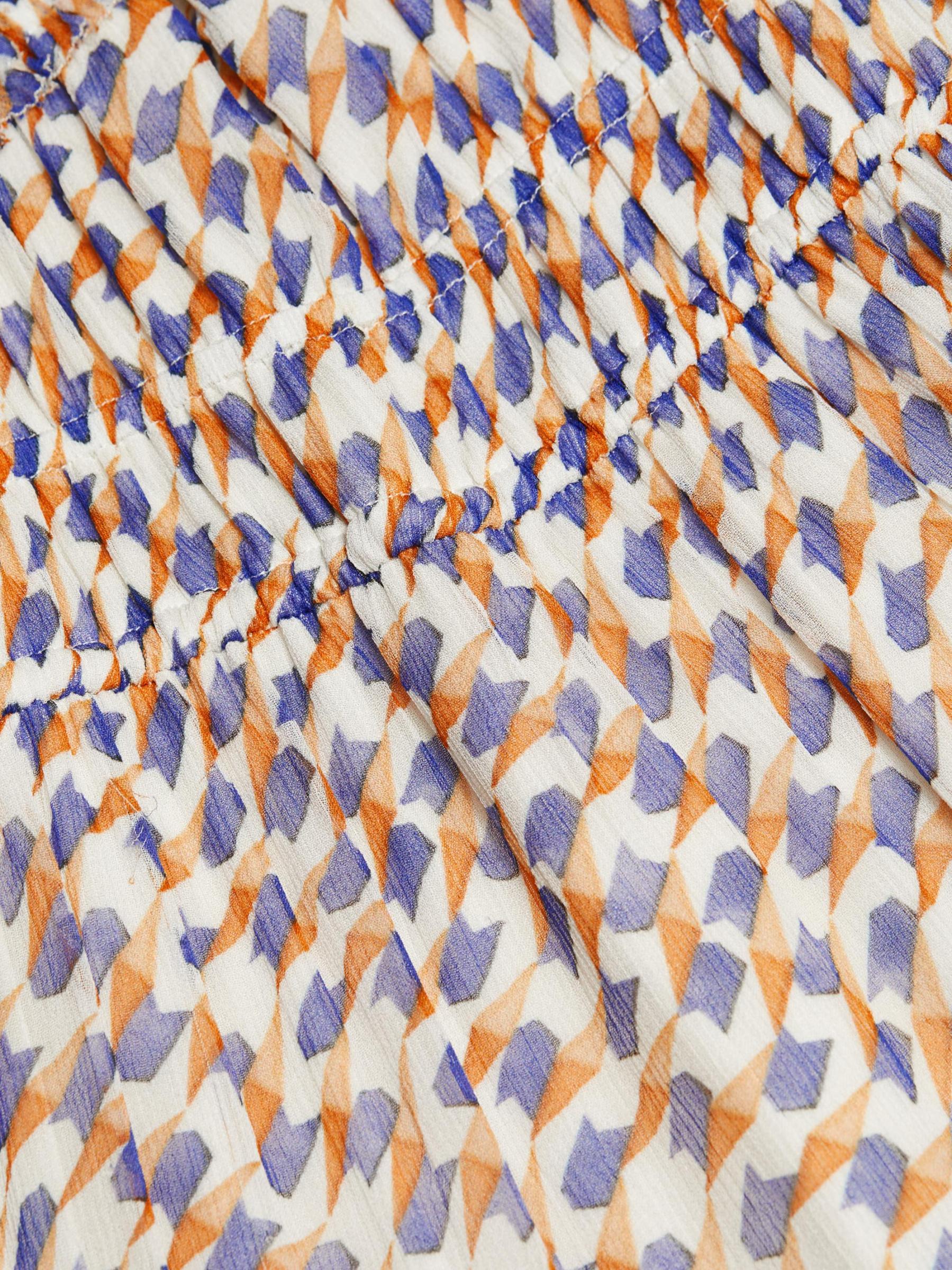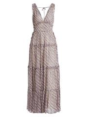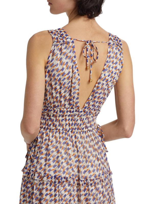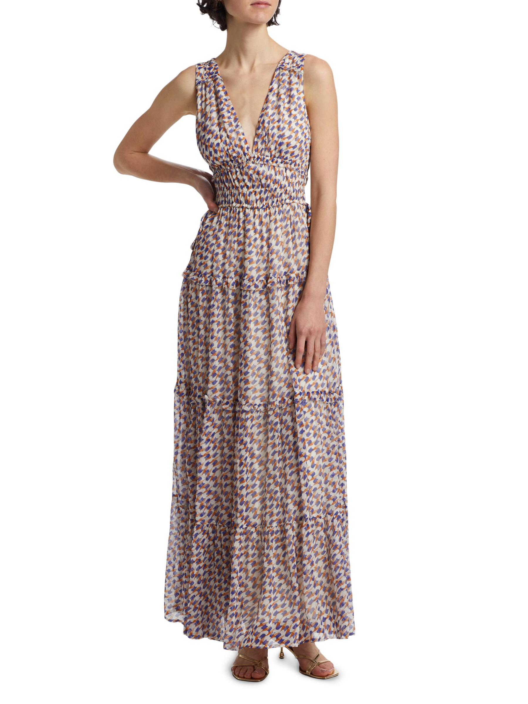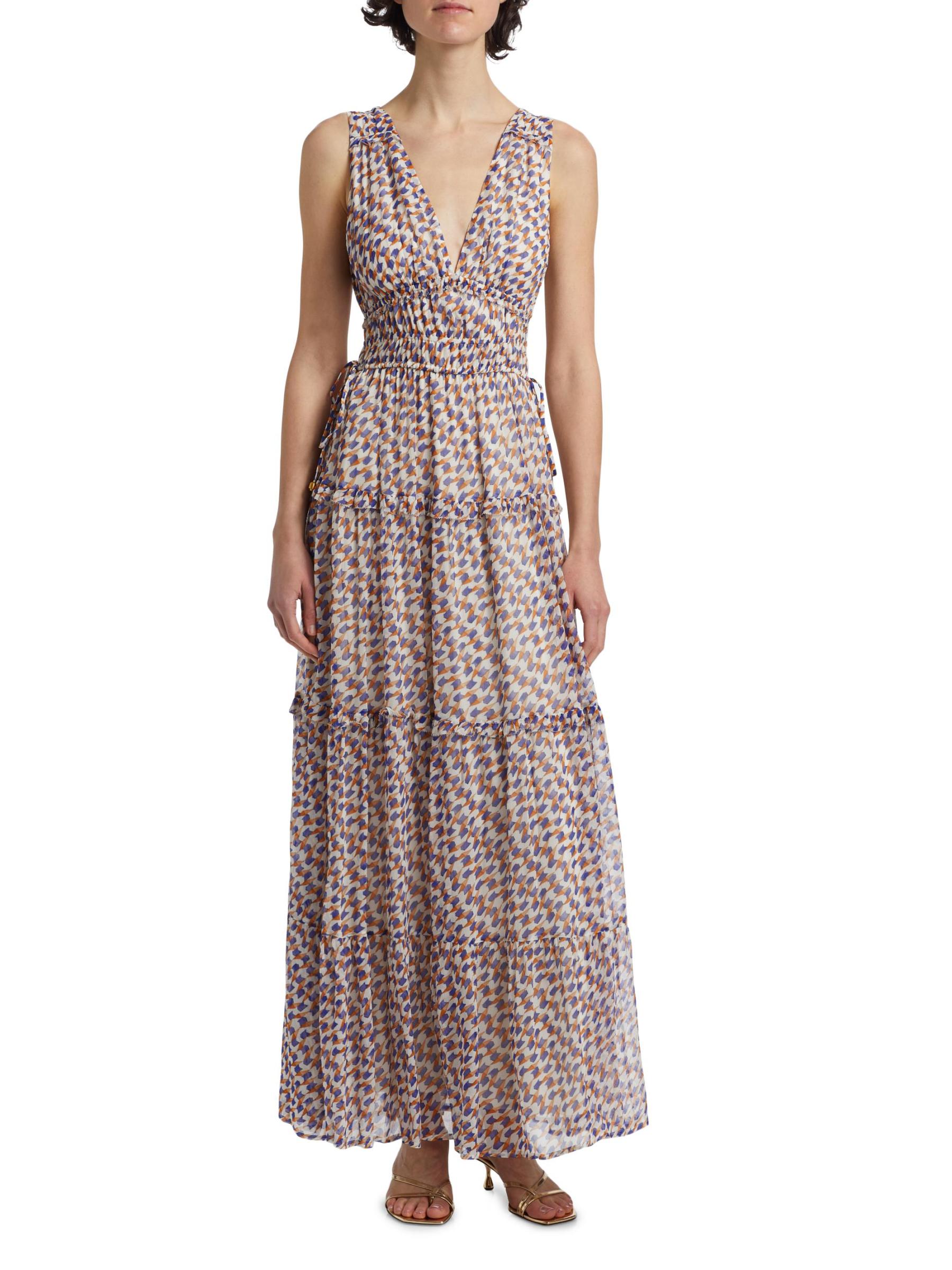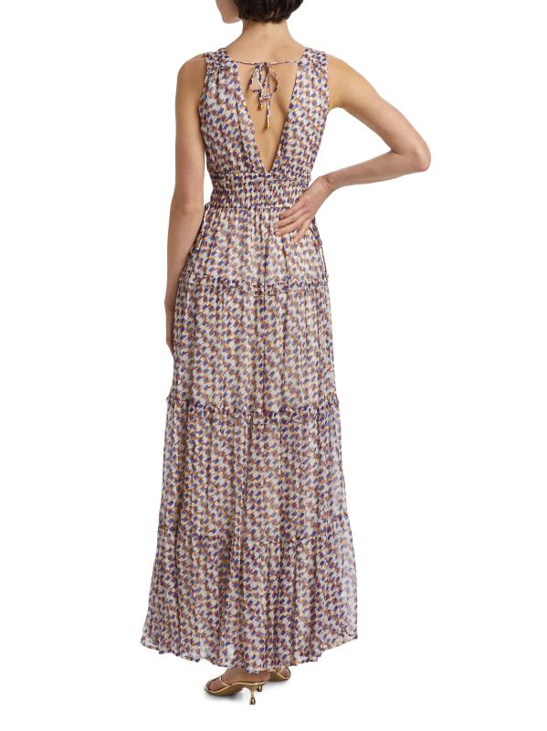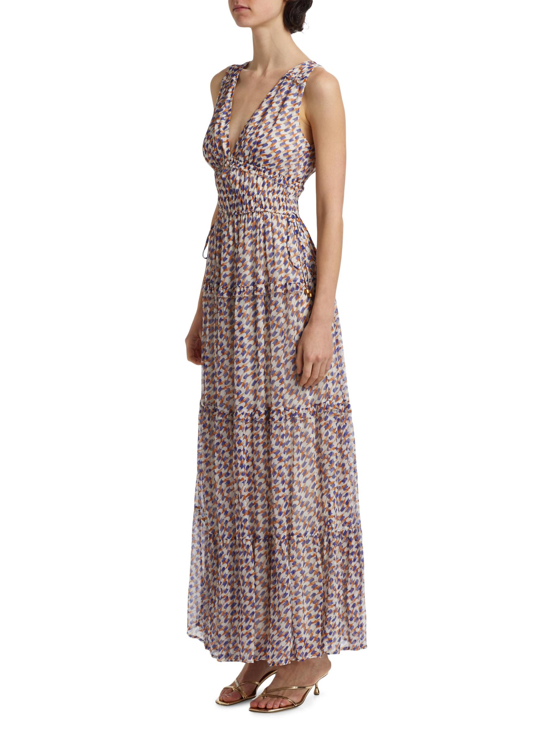 يتميّز فستان روشيل الطويل بدون أكمام من Kivari بطبعة هندسية تتميّز بتقويرة عميقة على شكل حرف V مع درزات ناعمة، مع رباط قابل للتعديل عند الخصر.