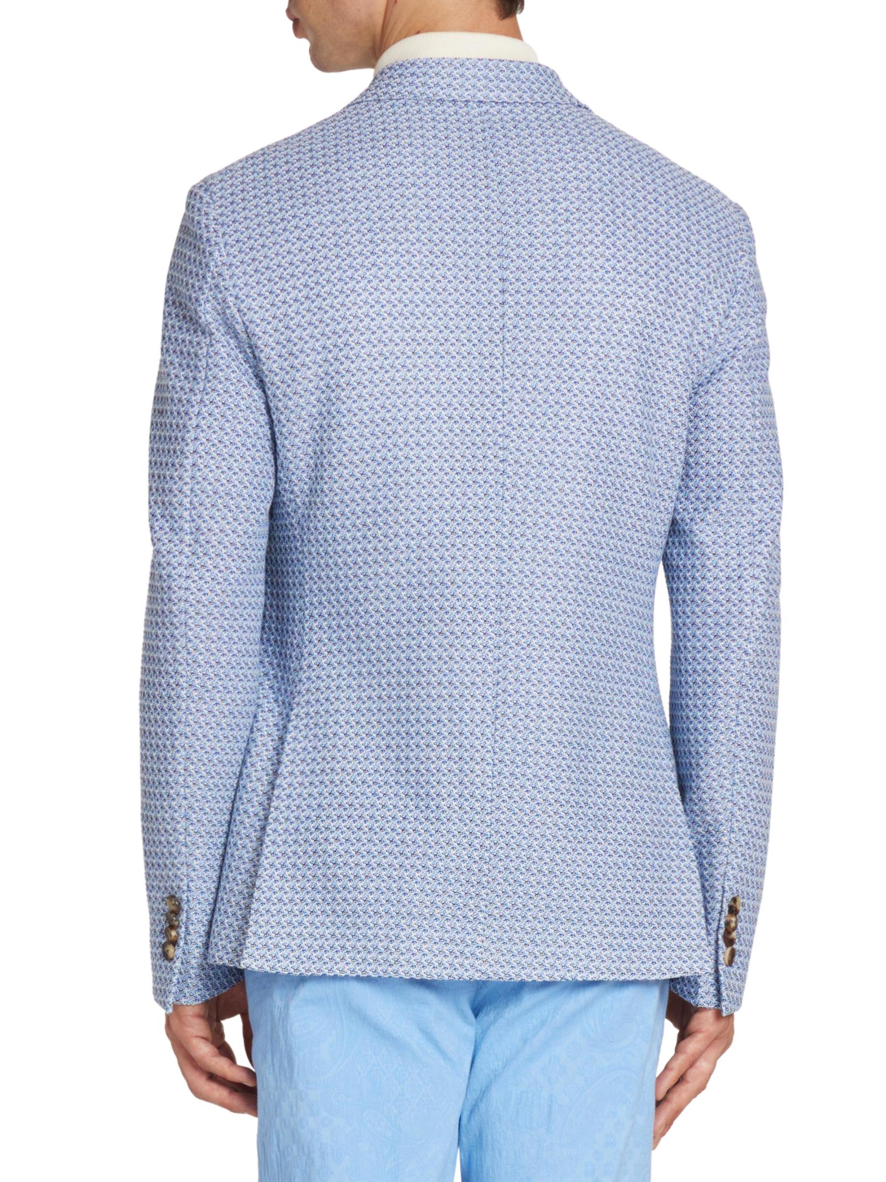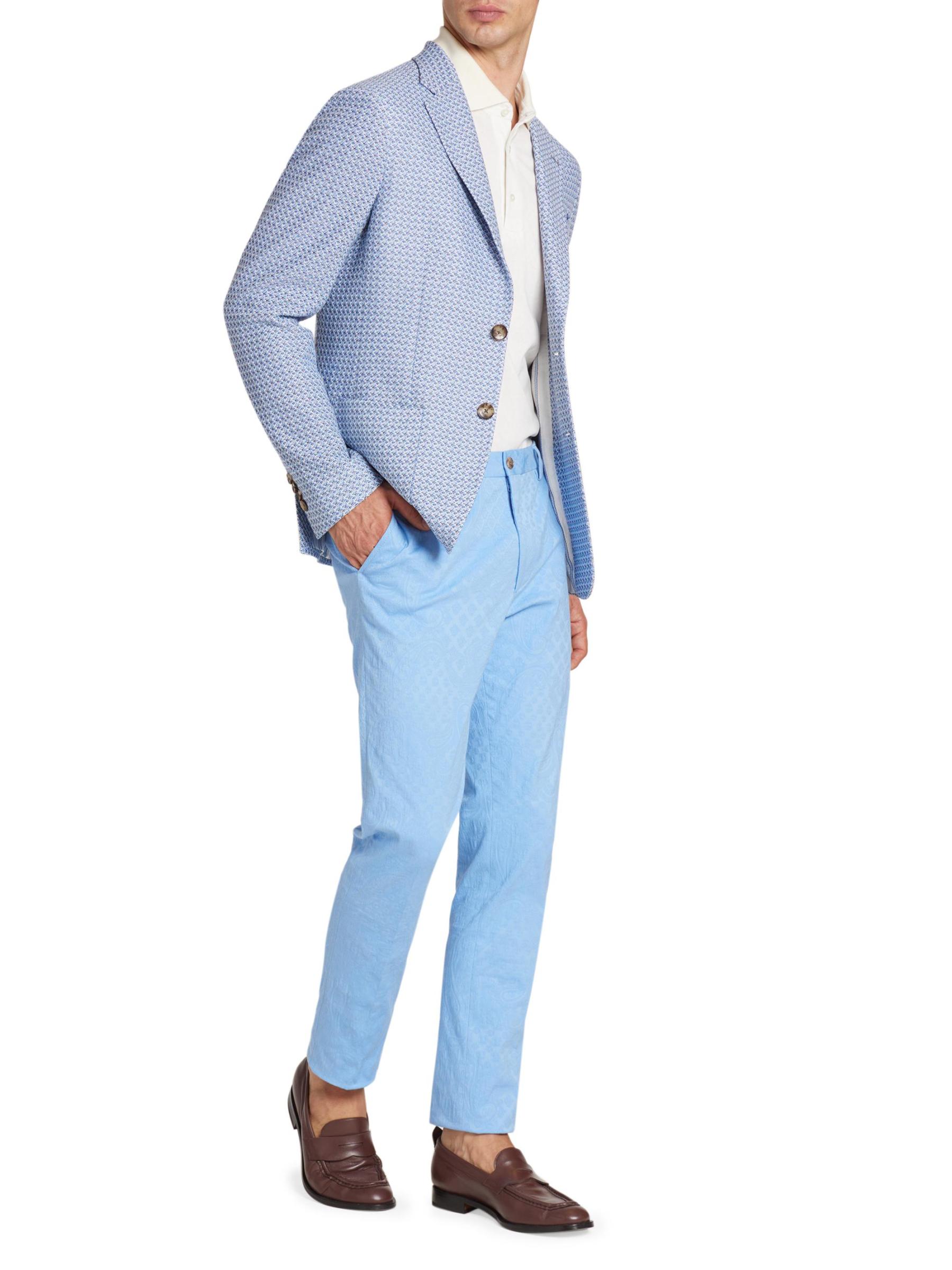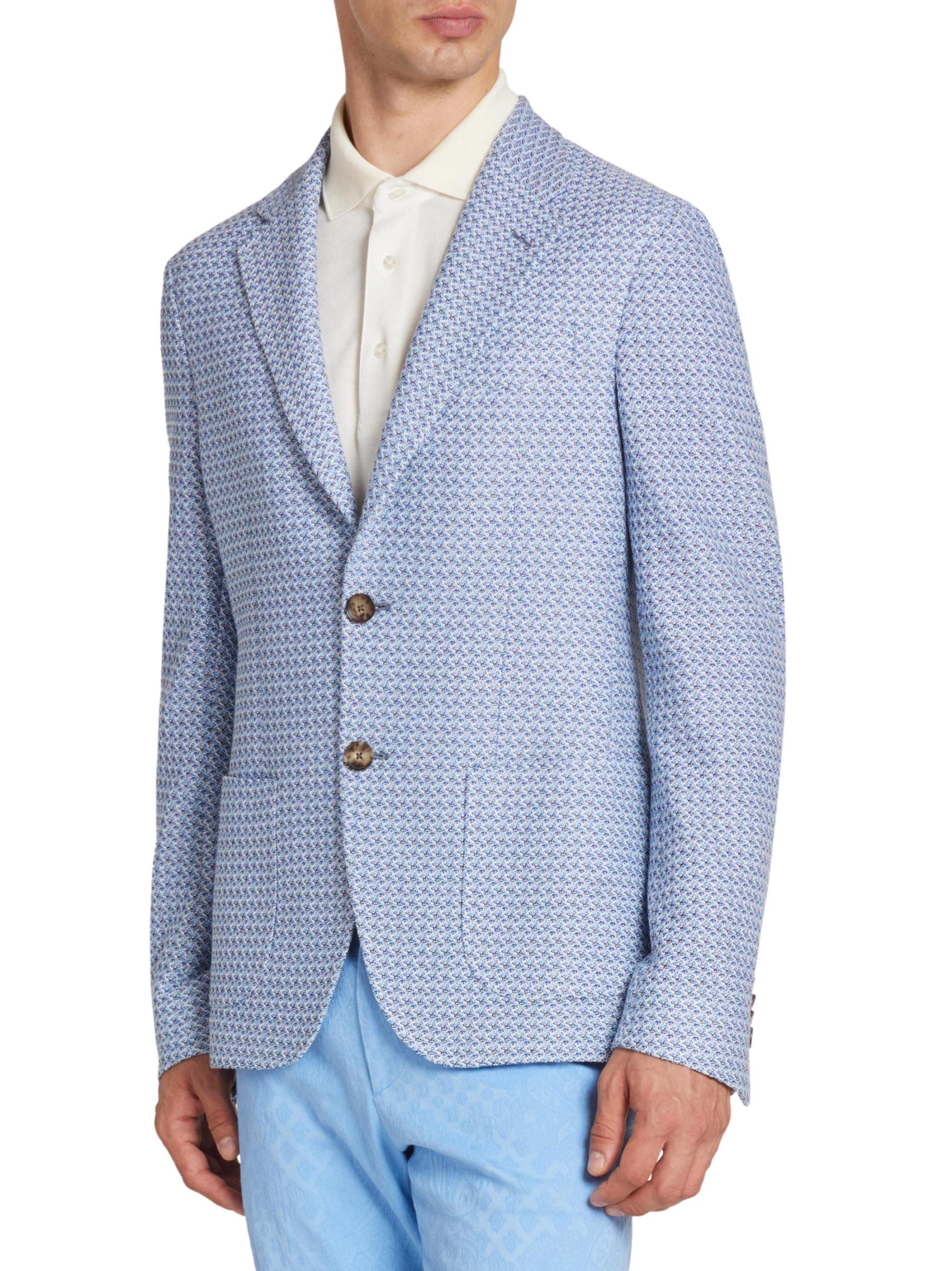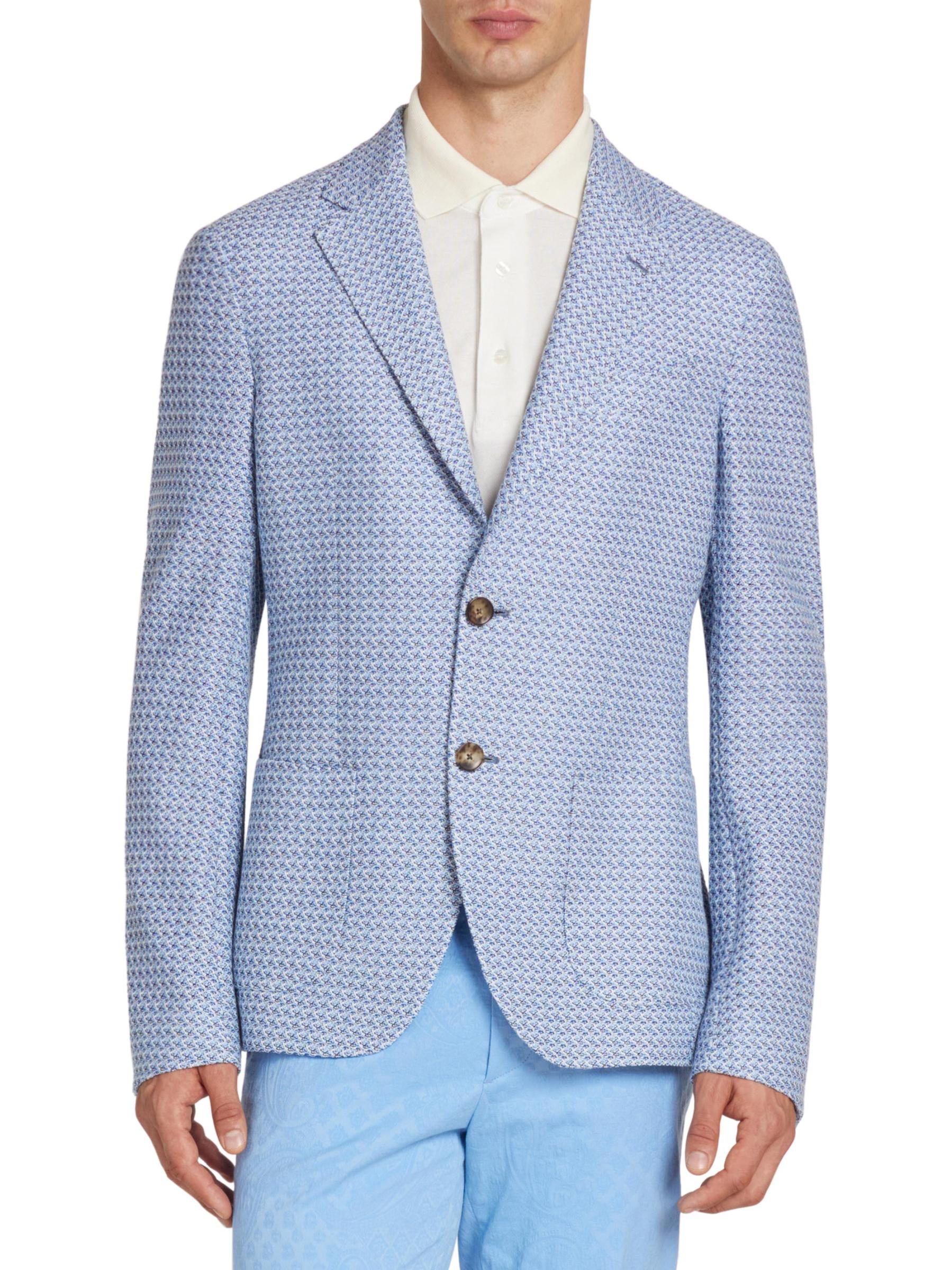 جاكيت Roma الرياضي من Etro مصنوع من القطن ويتميز بملمس منسوج من الجيرسيه على شكل خلية النحل. تم تصميم هذا الطراز بتصميم نحيف وحيد الصدر.