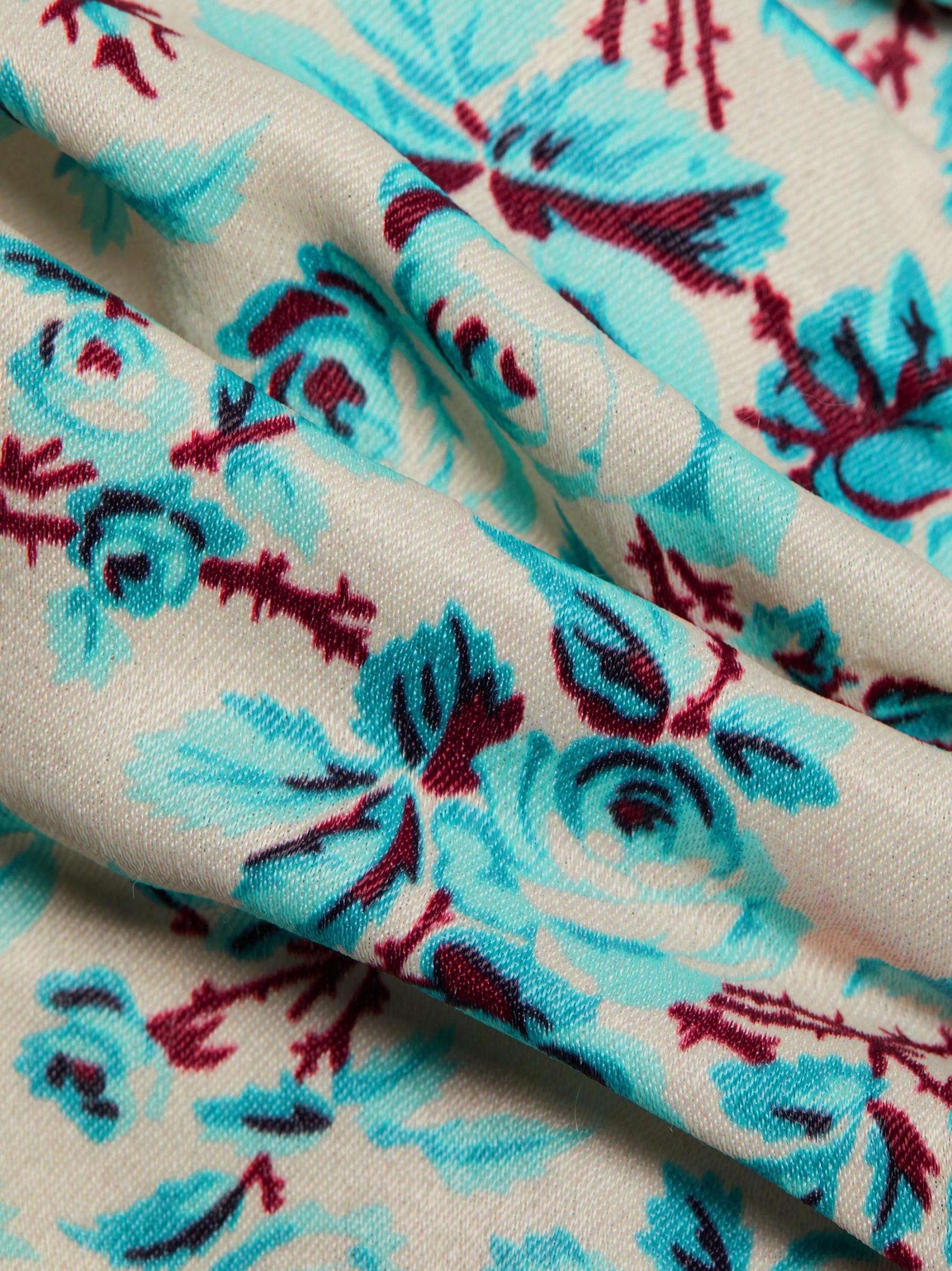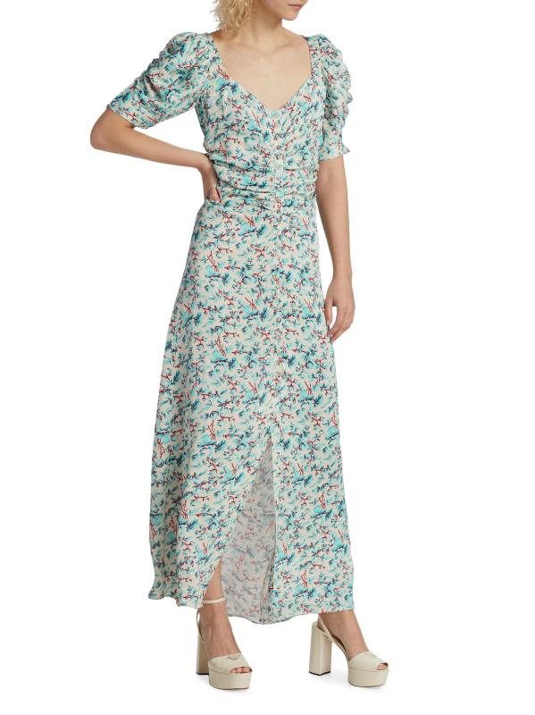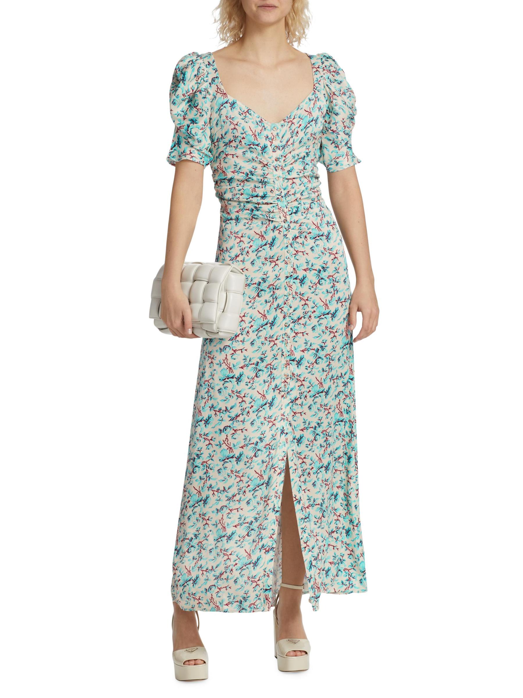 يتميز هذا الفستان الطويل المصنوع من الكريب المرن من Bytimo بصدّار مكشكش يتسع على الجانبين للحصول على صورة ظلية تعانق الجسم. تتميز هذه القطعة المزينة بطبعة وردية رومانسية برقبة واسعة على شكل حرف V وأكمام قصيرة منتفخة وفتحة بأزرار لونية