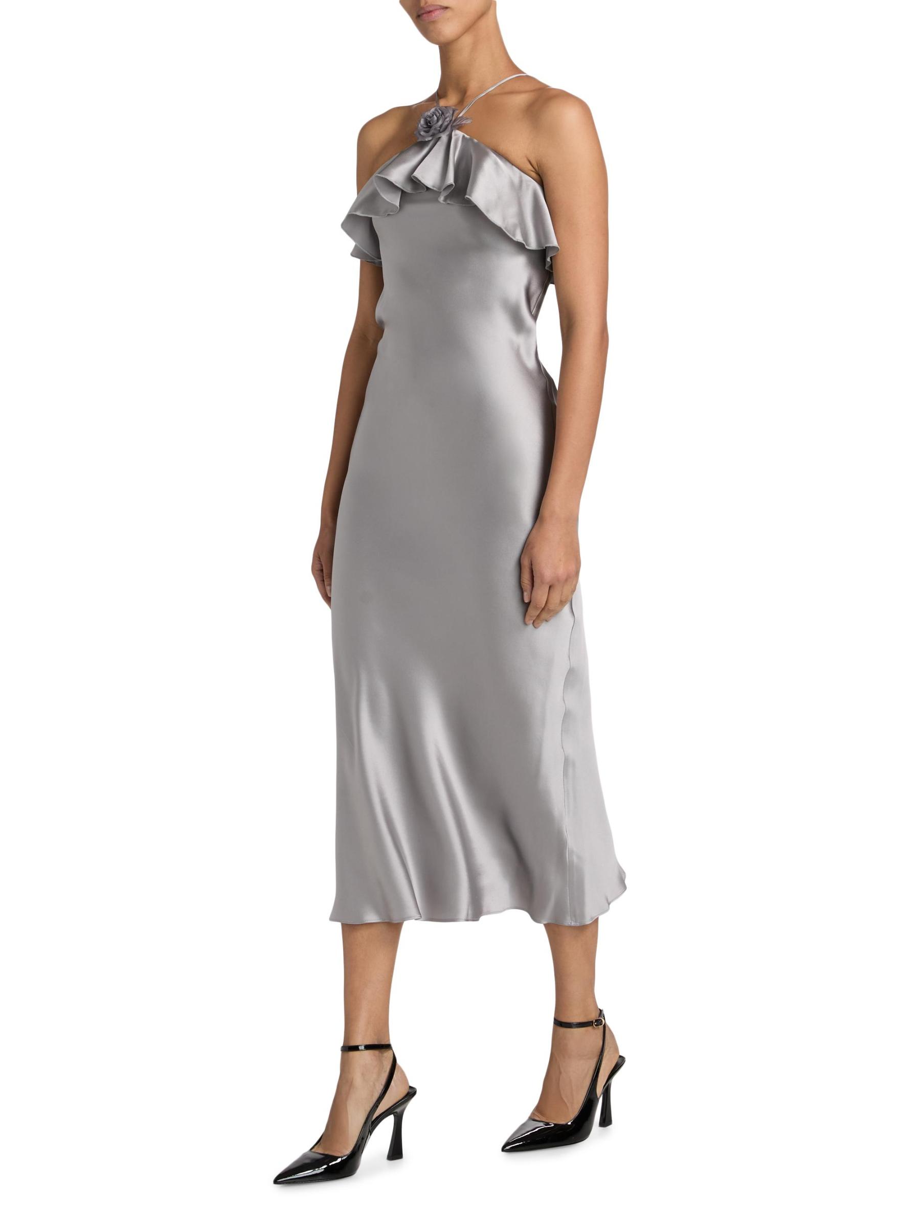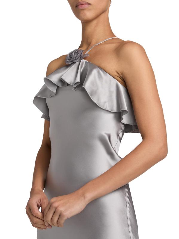 صُمم هذا الفستان المتوسط من Rodarte من الحرير على نحو يميل إلى الانزلاق بسلاسة فوق المنحنيات. تُبرز وردة ثلاثية الأبعاد خط العنق الرسن لهذا النمط اللامع.